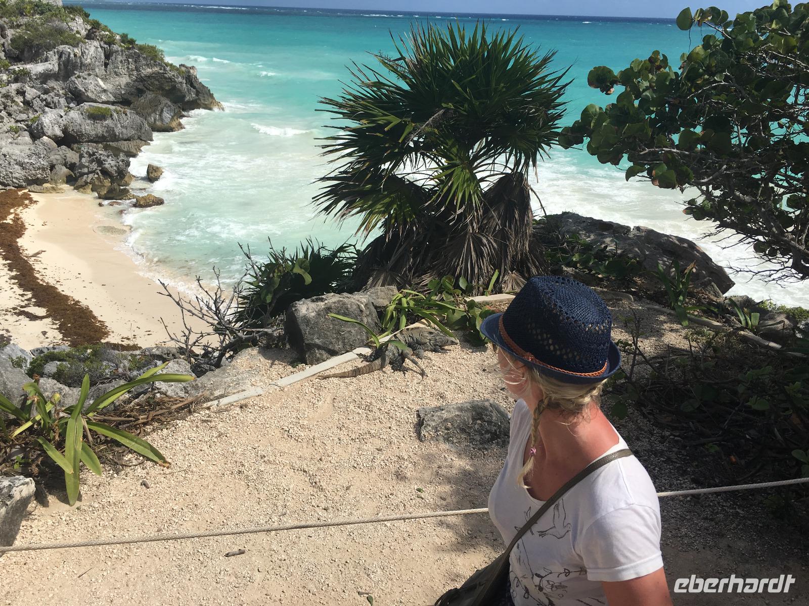 Tulum hat seinen Ursprung im 13. Jahrhundert, als die Maya-Hochkultur sich bereits ihrem Ende zuneigte. Wir erfahren von Juan Carlos viel über das Leben der Maya, während wir die einzelnen Ruinen auf unserem Spaziergang in der inneren Stadt innerhalb der Stadtmauer sehen. Auch hier begegnen uns zahlreiche Leguane und nennen diese Tempel ihr Zuhause ?. Dank der erhöhten Lage am Meer weht immer eine leichte Brise und macht die heutige Hitze erträglich.