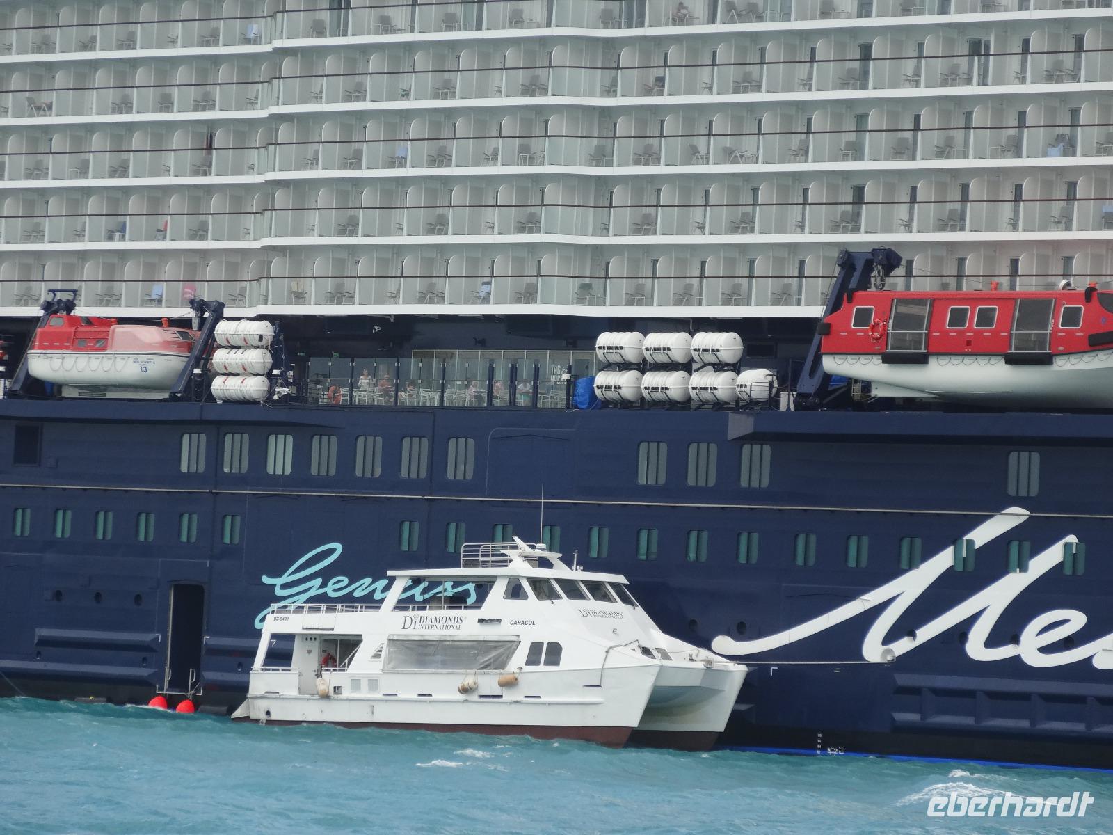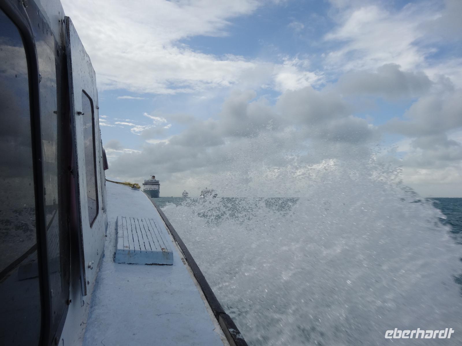 Heute wird getendert! Die Mein Schiff 6 liegt vor stechend türkisblauem Wasser vor Anker - ein traumhafter Anblick - und in der Ferne erkennt man Belize City. Lokale Tenderboote shutteln regelmäßig zwischen der hübschen Hafenpromenade und unserem Wohlfühlschiff. Die Bootsfahrt dauert ca. 20 Minuten.