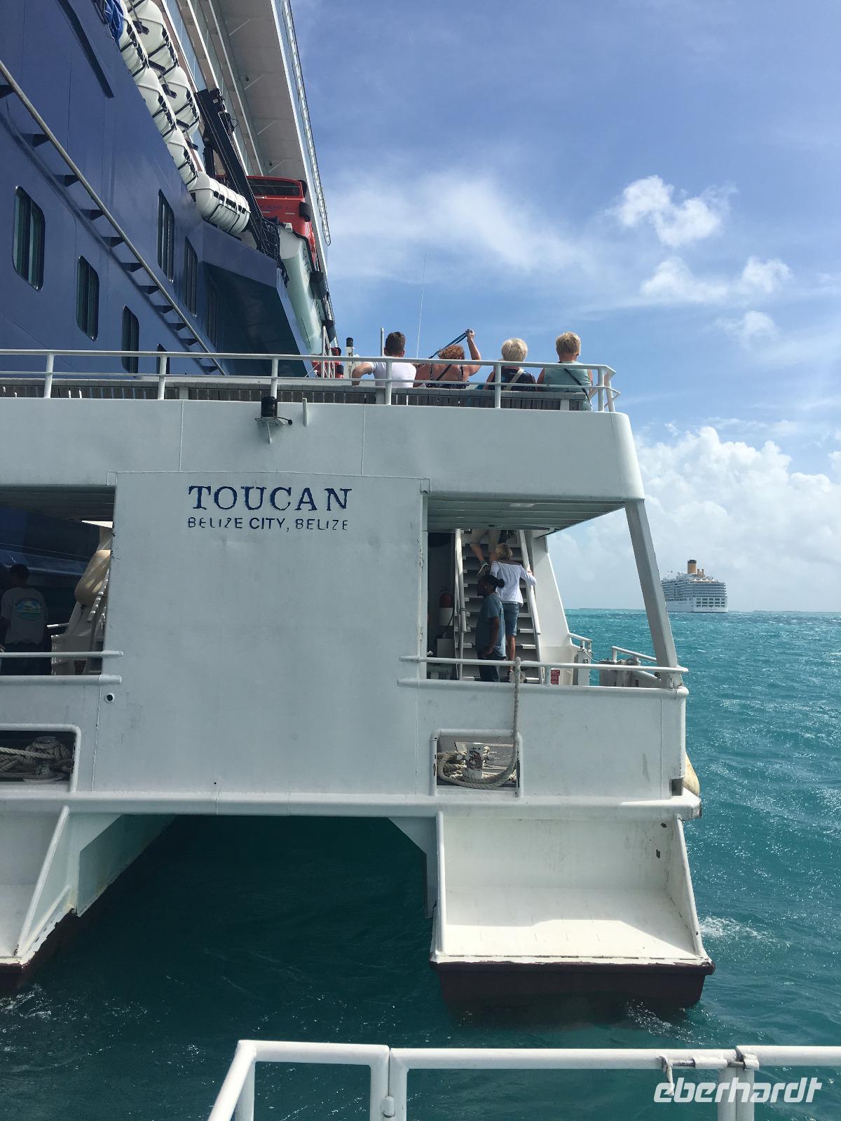 Am Ausflugstreffpunkt an Bord erhalten wir Länderkarten und als Australien aufgerufen wird, machen wir uns auf zu Deck 2 und steigen ins Tenderboot für unseren Ausflug „Belizes kostbare Tropfen & Kultur".