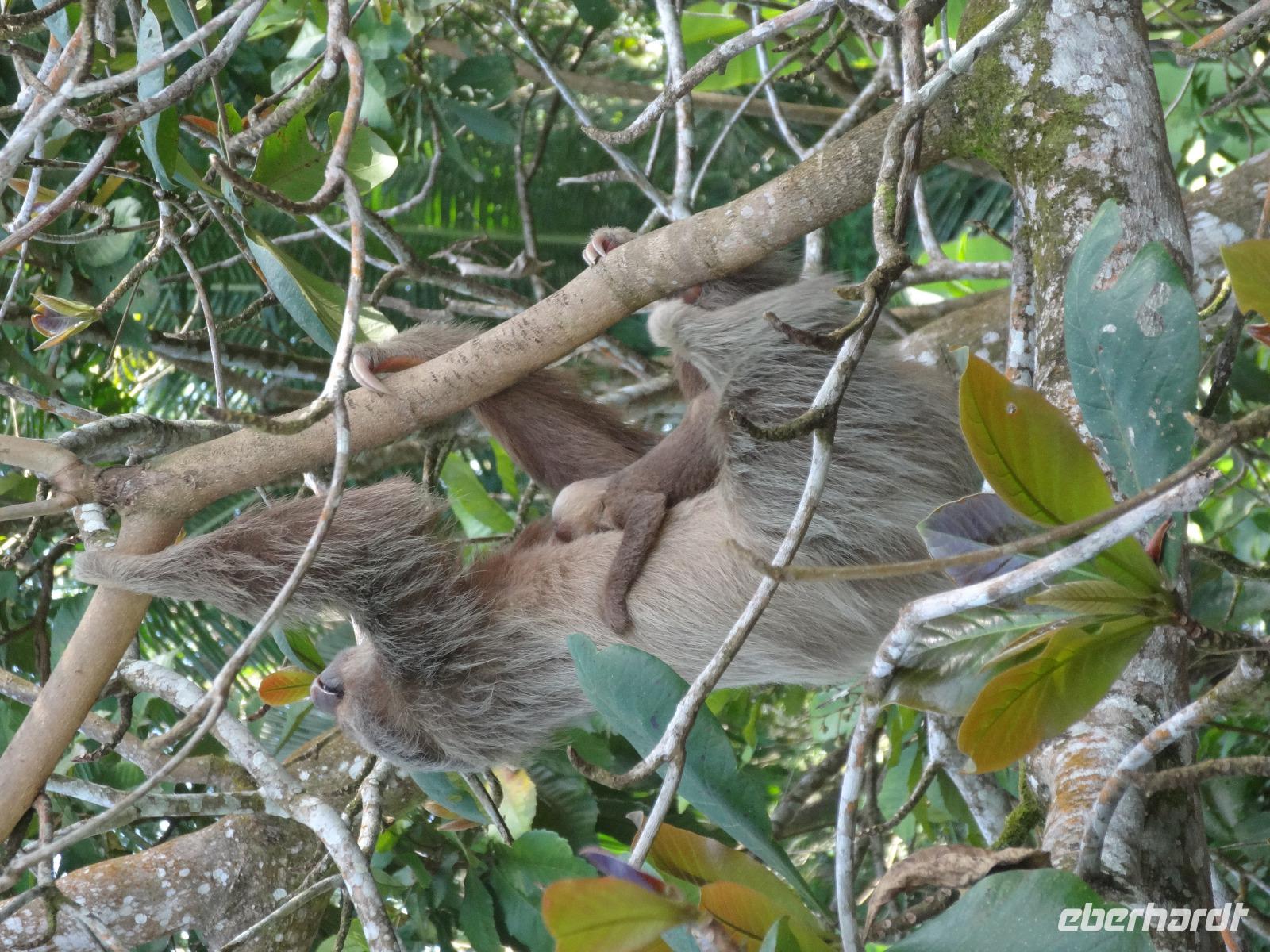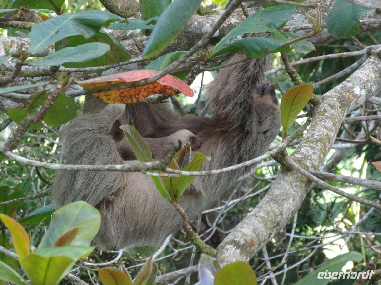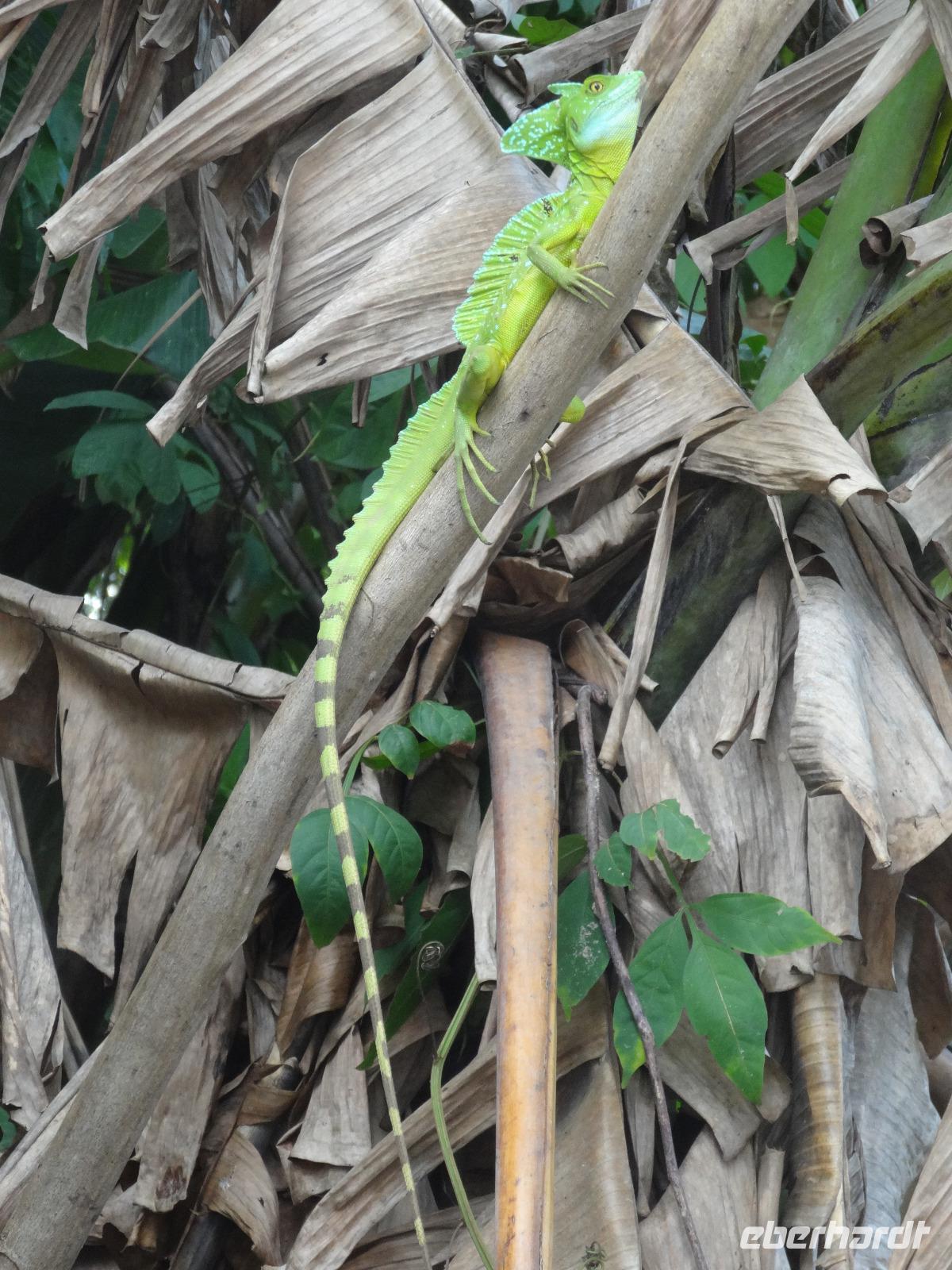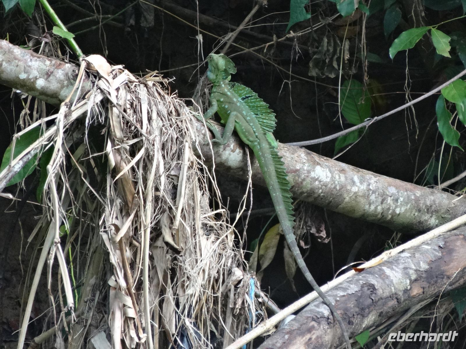 Die karibische Seite des Landes zieht uns heute beim exklusiven Eberhardt-Ausflug in ihren grünen Bann. Gut gelaunt empfängt uns am Morgen unser deutsch sprechender Reiseleiter Enrique. Wir starten direkt nach Moin, wo unser kleines Ausflugsboot bereit steht und wir eine zweistündige Bootsfahrt auf den Kanälen von Tortuguero unternehmen. Enriques freundliche Begleitung Maria versorgt uns mit frischem Obst und „local beer". Wir halten gespannt Augen und Ohren offen und unser Bootsführer sowie Enrique zeigen uns immer wieder Faultiere, Brüllaffen, Tukane, Reiher und den hübschen grünen Basilisk. Auch ein kleiner leuchtend roter Erdbeerfrosch wird für uns aus dem Regenwald geholt ?.