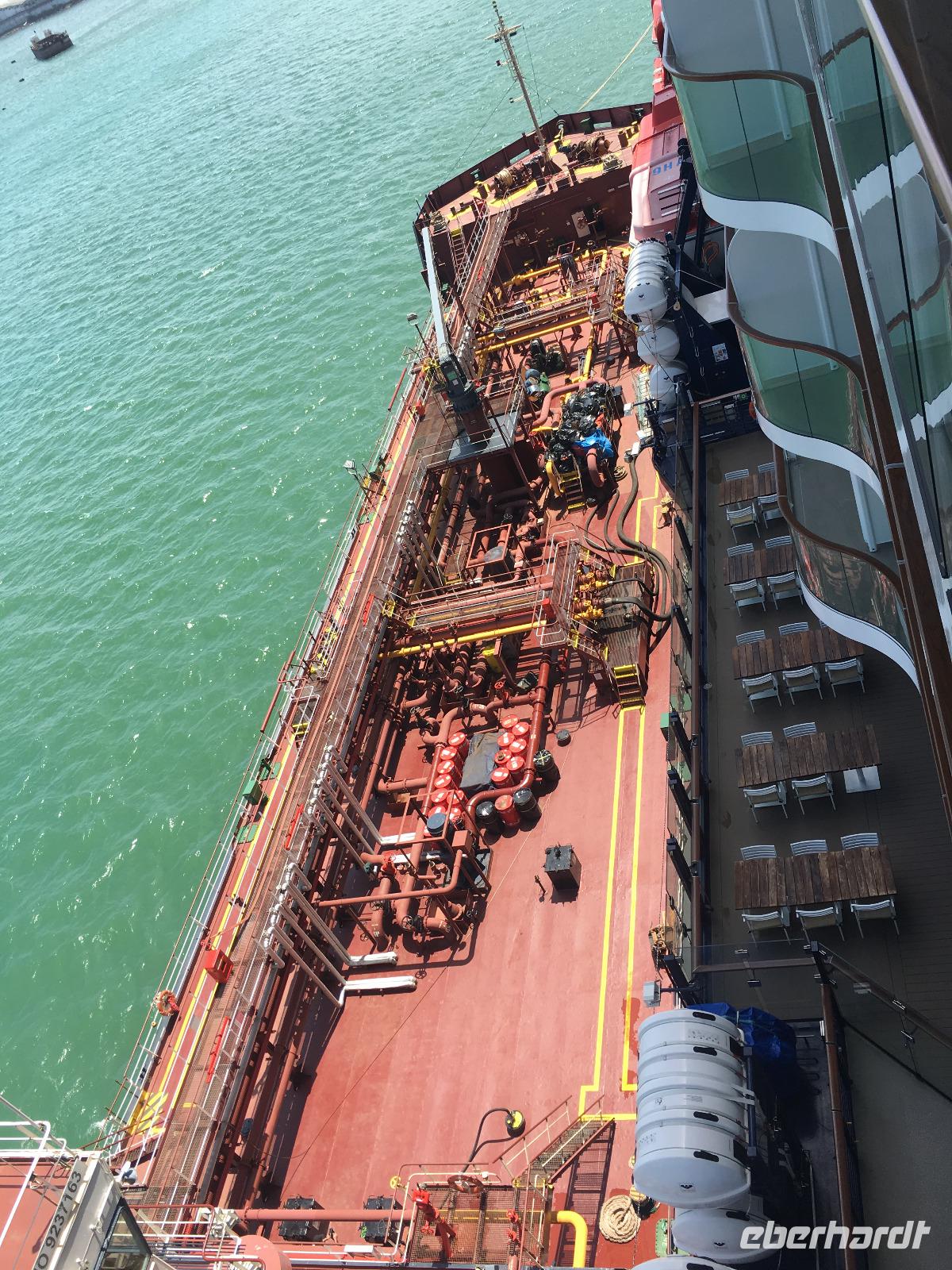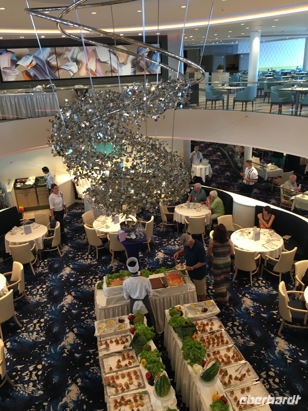 Die Bewohner der Balkonkabinen gönnen sich ihre erste Tasse Kaffee am Morgen ganz für sich auf dem kabineneigenen Balkon noch „vor dem Aufstehen". Bevor wir nach einem reichhaltigen Sektfrühstück die Annehmlichkeiten und Aktivitäten des Tagesprogrammes nutzen können, steht noch eine ausführliche Schiffsbesichtigung für unsere Gruppe auf dem Plan.11.00 Uhr startet unser exklusiver Schiffsrundgang mit einem Gläschen Sekt oder einem alkoholfreien Cocktail an der LUMAS-Bar auf Deck 4 mit Nadine aus der Schweiz, eine der „Gastgeberinnen" an Bord, die uns fast zwei Stunden die wichtigsten öffentlichen Bereiche des Schiffes zeigt. Wir staunen das ein oder andere Mal über die wohl designte Welt dieses schwimmenden Hotels: Ob es der gläserne „Blaue Balkon" auf Deck 14 ist oder der Diamant im Heck des Schiffes mit seinen Spezialitäten-Restaurants und -Bars.