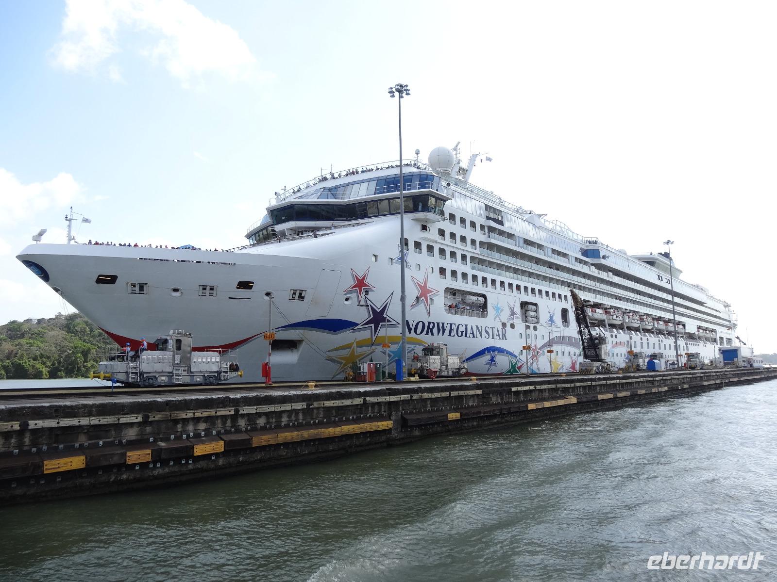 Nach einem kurzen Frühstück starten wir nun in einen Ausflug voller Höhepunkte! 6.00 Uhr ist Treff für unsere Gäste und eine Vielzahl von Bussen gen Panama City. Gegen 08.00 Uhr treffen wir am Bootseinstieg ein, von wo aus unsere vierstündige Bootsfahrt startet. Das Ausflugsboot bietet ca. 300 Personen Platz und ein deutsch sprechender örtlicher Reiseleiter erzählt viel über die Geschichte und Besonderheiten des Panamakanals. Die Bootstour beginnt rechterhand mit einem Blick auf die glitzernde Skyline von Panama City. Wir passieren danach die Pedro-Miguel- und die Miraflores-Schleusen. Diese bestehen aus zwei bis drei Schleusenkammern und dieser bis zu 45 Minuten dauernde Vorgang ist wirklich faszinierend. Dabei überwinden wir einen Höhenunterschied von 26 Metern. Wir hatten das große Glück, an diesem Tag von zwei großen Container-Schiffen im neuen Schleusenbereich und von einem Kreuzfahrtschiff neben uns begleitet zu werden. Zwischendurch stärken wir uns beim Mittagsbuffet, was man aufgrund der Uhrzeit eher als Brunch bezeichnen könnte. Nach unserer eindrucksvollen Fahrt auf dem Panamakanal bei heißen, sonnigen Temperaturen verkürzt der Reiseleiter im Bus mit allerhand Erklärungen zum Freihandelshafen in Colón die etwa einstündige Busfahrt wieder zurück zum Hafen.