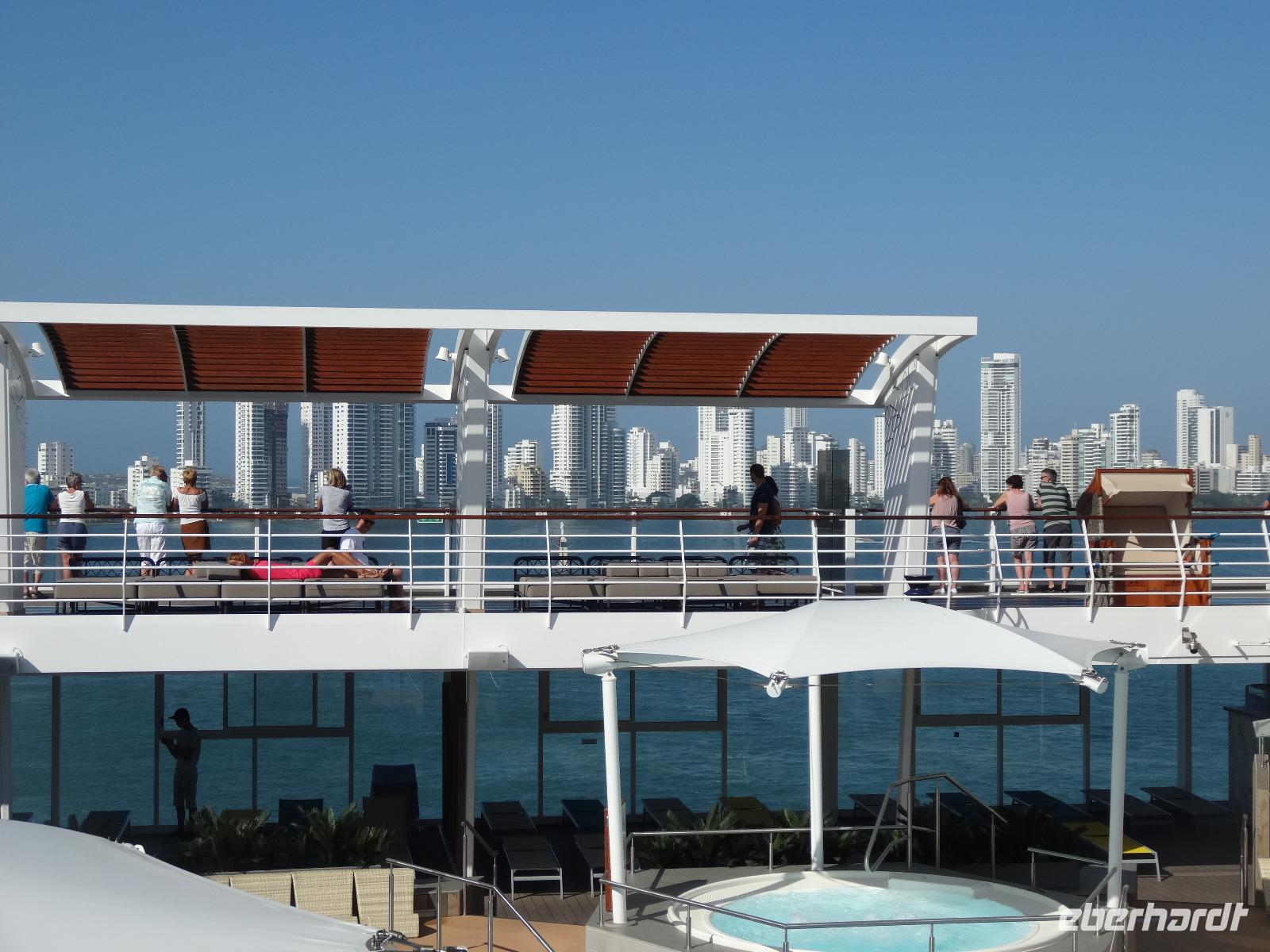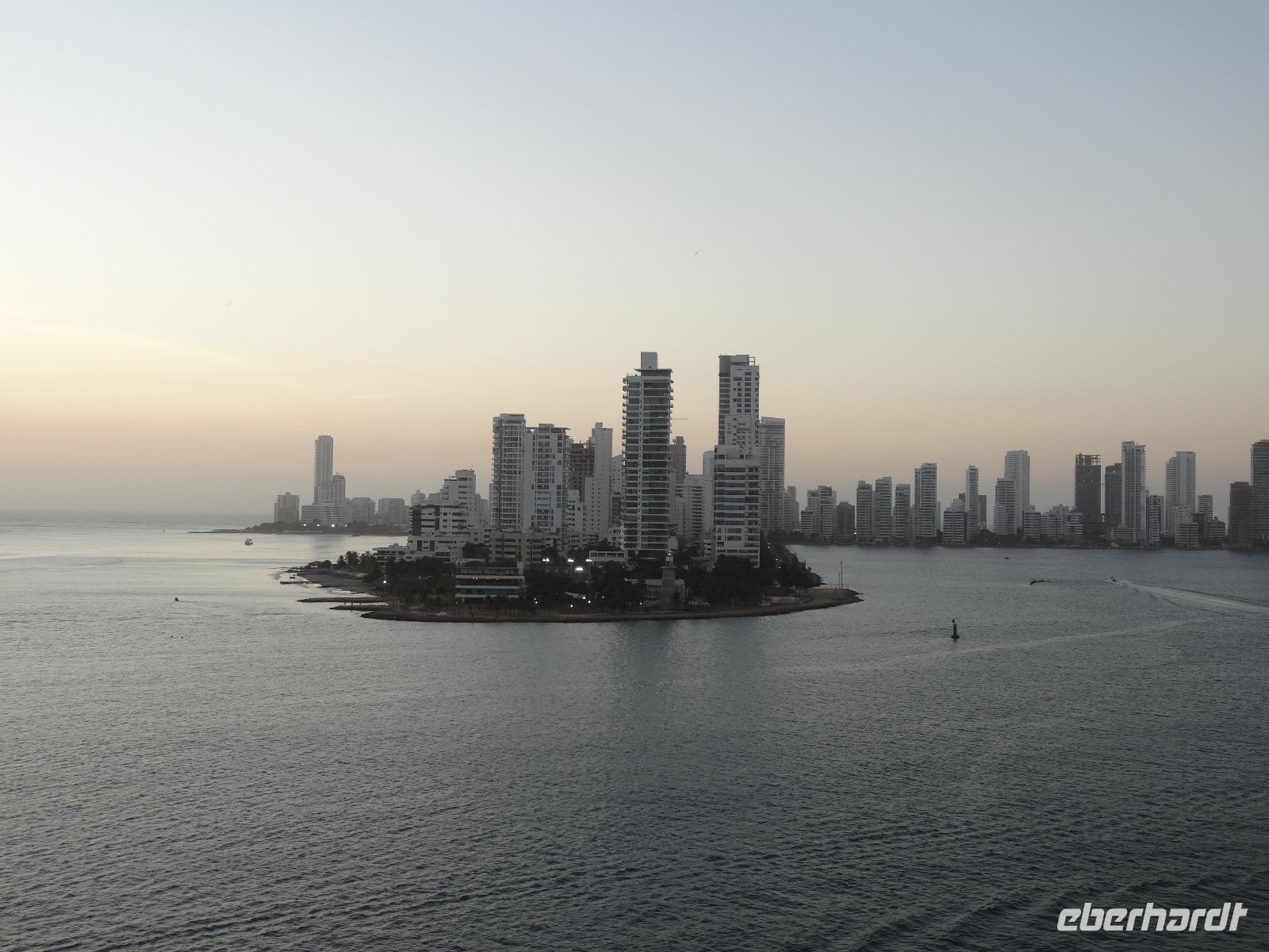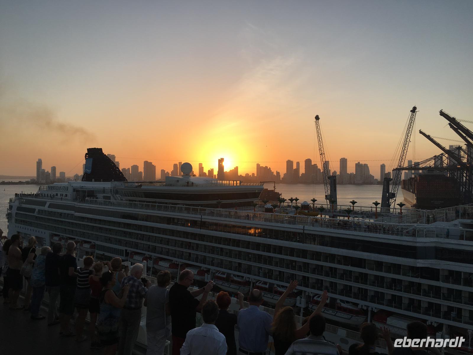 Das Auslaufen der Mein Schiff 6 am Abend aus Bocagrande ist besonders schön und wir beobachten, wie die glühende Sonne hinter den glänzenden Wolkenkratzern untergeht und diese in ein wunderschönes Licht taucht ...