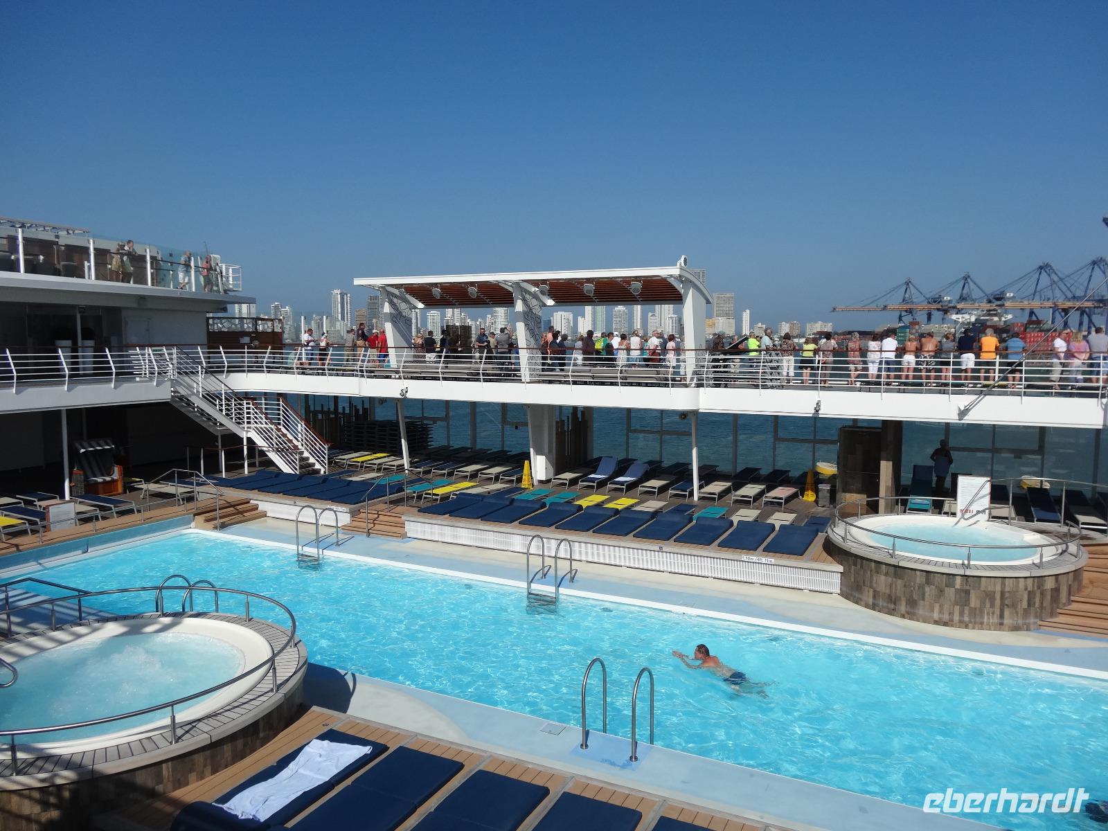 Nun sucht sich jeder wieder sein Lieblingsplätzchen an Bord. Eine Sonnenstunde am Swimmingpool verbringen, der eingebettet von bequemen Liegemöglichkeiten und Sitzlounges das Aqua-Deck dominiert. Oder doch lieber ein frisch gemixter Smoothie in der Himmel & Meer Lounge mit Blick aufs Meer? Der intimste Platz am Wasser ist jedoch immer noch der eigene Balkon in der Kabine :-).