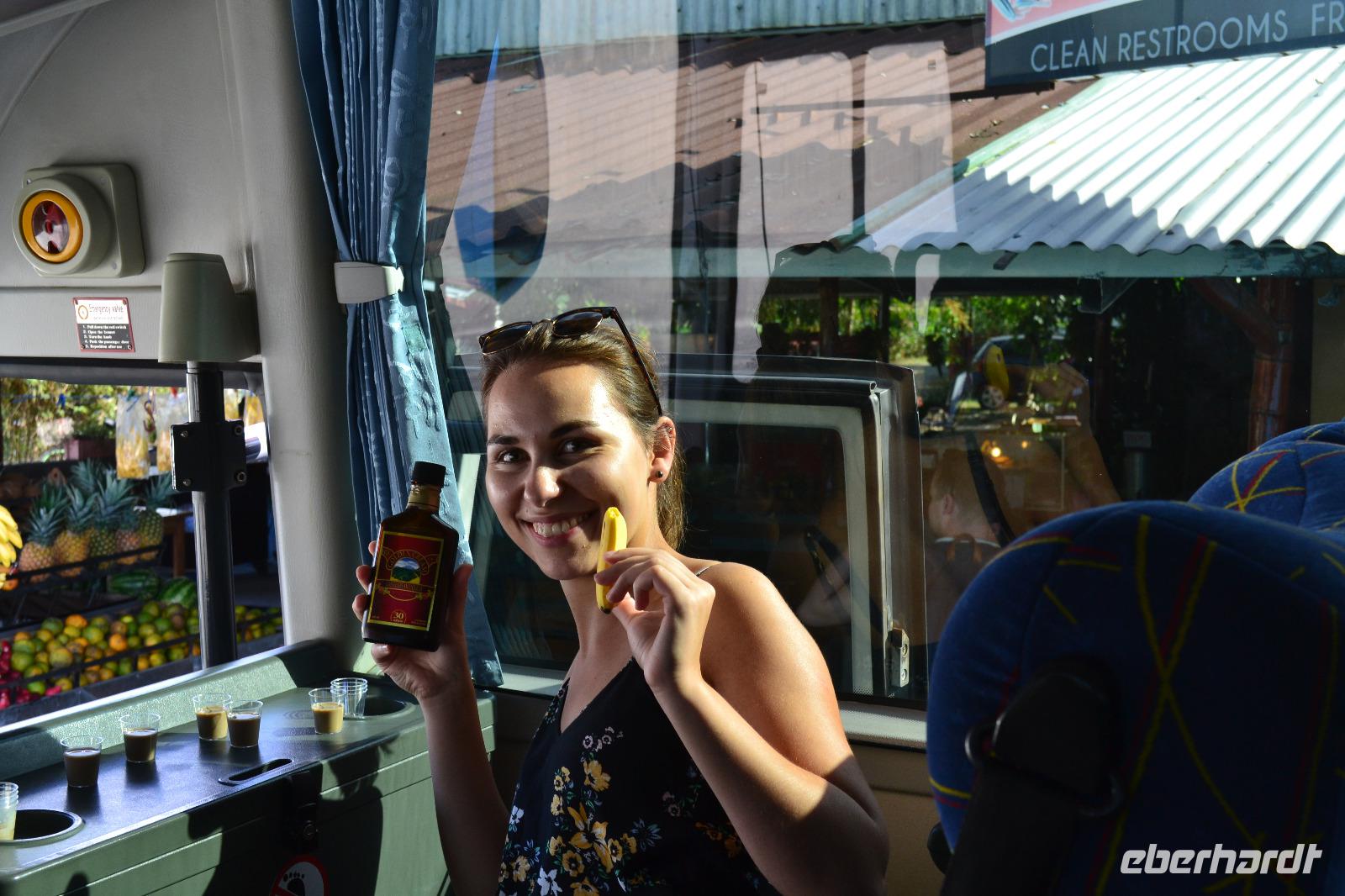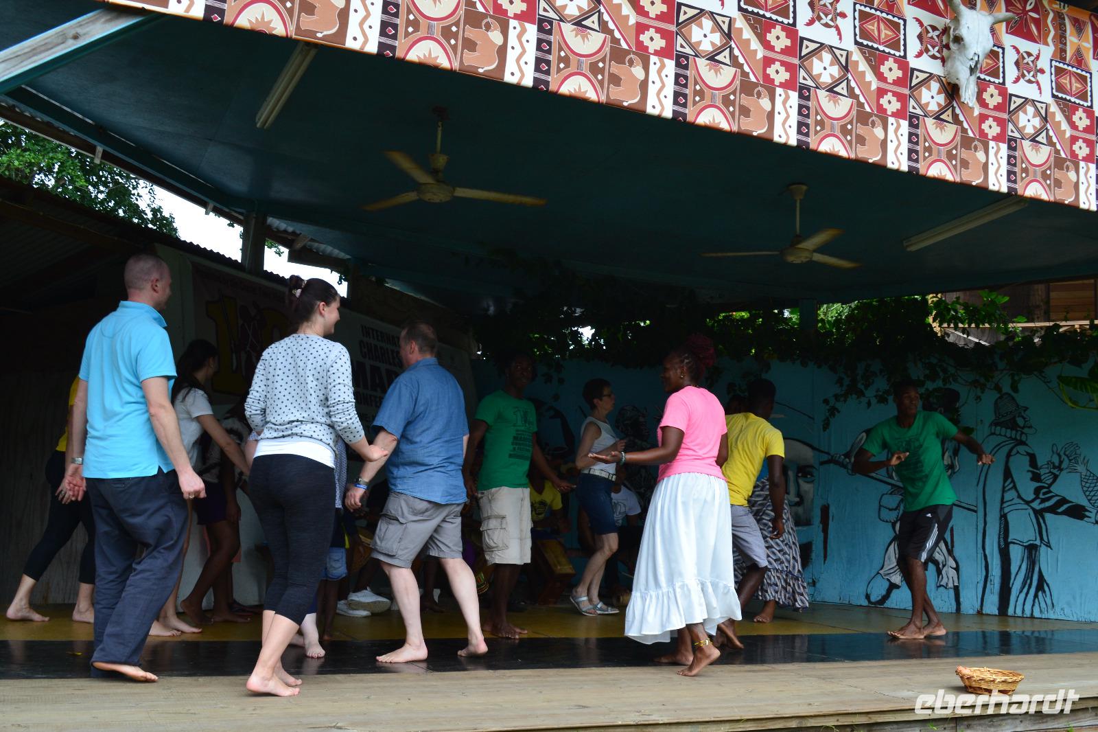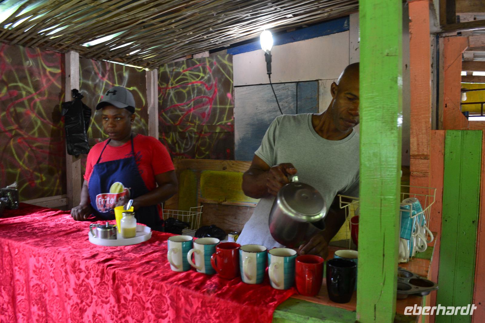 Am heutigen morgen legte die „Mein Schiff 6" im Hafen von Ocho Rios an. Nachdem das Schiff von den örtlichen Zollbehörden frei gegeben wurde erkundeten wir heute gemeinsam die Insel. Während eines Ausfluges von TUI Cruises erfuhren wir spannenden Informationen von unserer deutschen Reiseleiterin Doris. Sie wohnt bereits seit vielen Jahren auf der Insel und hat dort als Auswanderin aus Berlin Ihren Lebensmittelpunkt verlegt. Zunächst hielten wir auf dem Weg in die Blue Mountains an einigen Fotokulissen. Der Name Blue Mountains kommt von dem Nebel, welcher sich an Regentagen über dem Gebirge befindet und blau schimmert. Die niedriger gelegen Hängen werden für den Anbau der hochwertigen Kaffeesorte Jamaican Blue Mountain genutzt. In tropischen Höhen überraschte uns ein ordentlicher Regenschauer, doch für unseren kleinen Spaziergang durch die farbenfrohe Natur legte dieser eine Pause ein. Wenn Engel Reisen! Nun war es Zeit den zweit besten und teuersten Kaffee der Welt zu probieren. Wir kehrten in eine unscheinbare Hütte am Wegesrand ein und verkosteten die Spezialität. Gegen Mittag fuhren wir mit unserem kleinen Bus zurück in das Tal zu den dort lebenden Maroons. Die Völker stammen aus Afrika und entkamen der Sklaverei auf Jamaica und sammelten sich im Berginneren in Gruppen zusammen. Sie stellten uns Ihre typischen Speisen, wie Reis mit Kidneybohnen, Ackee und Salat zusammen. Dazu reichte man uns einen leckeren Vitaminreichen Saft. Die einheimischen Jugendlichen führten uns Ihre Tänze vor und luden zum Mitmachen ein. Als Abschluss erhielten wir in dem kleinen Museum ein paar Informationen zur Geschichte des Stammes. Doris brachte uns mit dem Busfahrer Pieter wieder zurück zum Hafen, wo wir am späten Nachmittag noch den restlichen Tag ausklingen ließen.