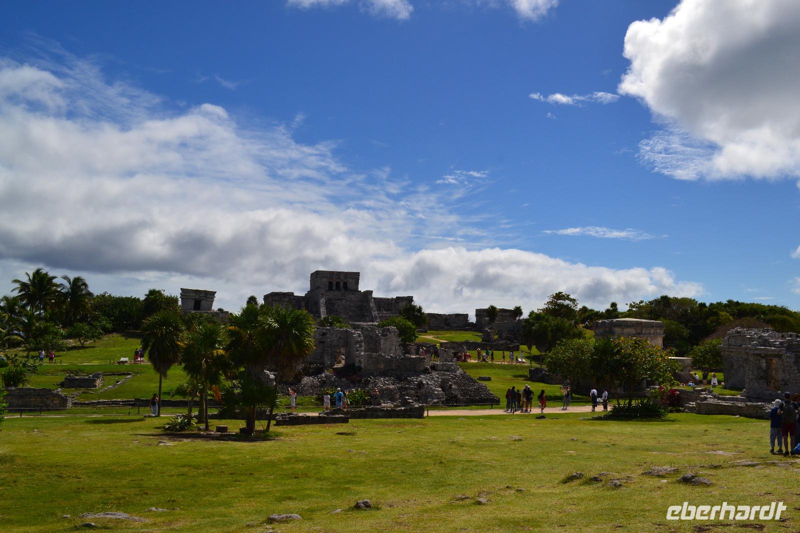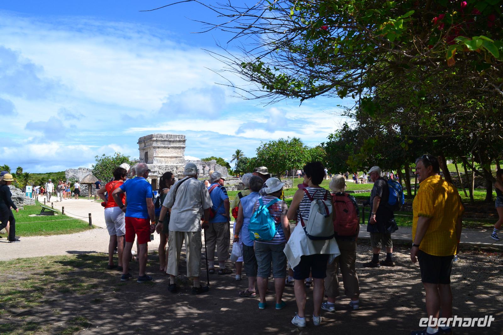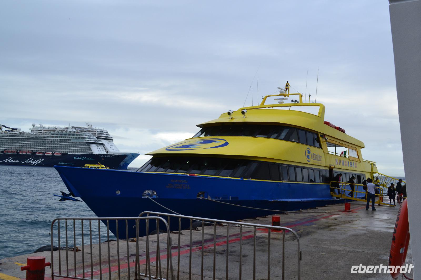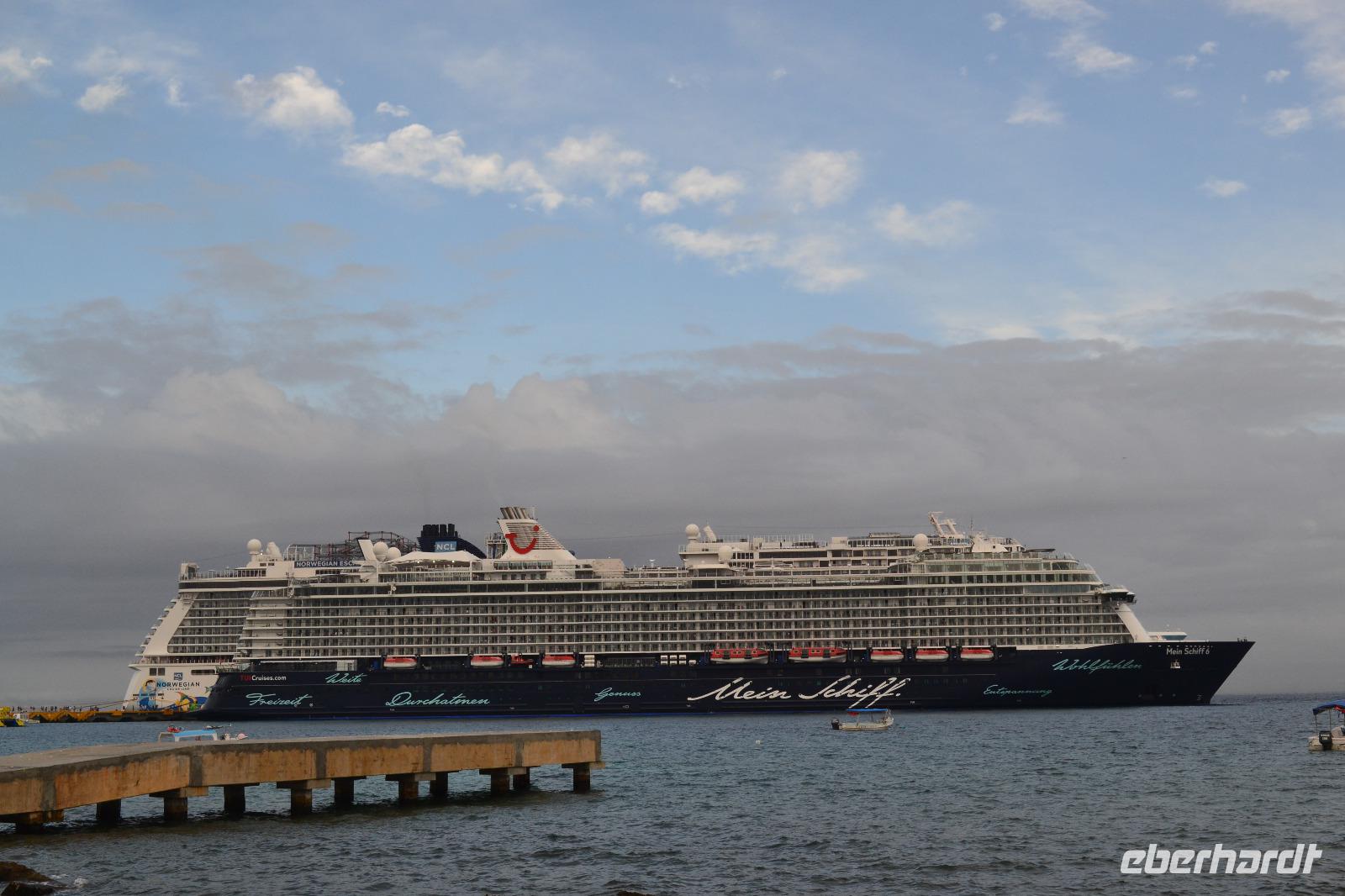 Zu einer humanen Zeit, nämlich 8 Uhr gingen wir gemeinsam von Bord und trafen im Shopping Center außerhalb des Kreuzfahrt Terminals auf unseren heutigen Reiseleiter Viktor. Er lebte in seinen jungen Jahren 8 Jahre lang in der Nähe von Ölbronn und beherschte dementsprechend unsere Sprache sehr gut. Sein erster Besuch in Deutschland war zur Eröffnung des Dönerladens von seinem Onkel in den 80 er Jahren in Berlin Kreuzberg. Zunächst liefen wir ca. 20 Minuten von dem großen Kreuzfahrt Anleger zu den öffentlichen Fähren. Übrigens können entlang der kleinen Insel Cozumel 8 Kreuzfahrtriesen gleichzeitig anlegen. Am heutigen Tag entdeckten wir 5 dieser Sorte. Nach ca. 35 Minuten erreichten wir den Hafen von Playa del Carmen am Festland Mexikos. Da es derzeit Winter in der Karibik ist, ließ der Regen nicht lang auf sich warten. Ausgerüstet mit Regenponochos und Schirmen gelangten wir nach einigen Metern zu unserem örtlichen Reisebus. Auf der kurzen 45-Minütigen Fahrt nach Tulum erzählte uns Viktor einiges von seinem Leben in Mexiko und von der Maya Kultur. Dort angekommen lachte die Sonne am Himmel bereits wieder und wir genossen den Spaziergang über die historische Stätte, welche als Besonderheit direkt am Meer gelegen ist. Dank den Erläuterungen unseres Reiseleiters konnten wir uns in das Leben der Mayas gut versetzen. Die nennenwertensten Gebäude sind der „Tempel des Herabsteigenden Gottes", der „Tempel des Windes" und der „Freskentempel". Pünktlich zur Mittagszeit und einem weiteren Regenschauer brachen wir zu unserem Mittagessen und Strandaufenthalt dem Serenity Camp auf. Nur für uns legte der Regen eine Pause ein, in welcher wir im Trockenen Essen und die Sonne, sowie den Strand genießen konnten. Als Vorspeise wurden uns Frühlingsrollen gereicht. Das Hauptgericht war ein Rindersteak mit Gemüse und das Dessert ein süßer Crêpe mit Eis. Nach dieser Stärkung hatten wir noch rund 1,5 Stunden Zeit um den Strand zum Baden und entspannen zu nutzen. Glücklicherweise hatten wir für unsere Erkundungen im freien immer Glück mit dem Wetter. Die Fährüberfahrt zurück nach Cozumel schlug dem ein oder anderen kräftig auf den Magen. Die Mein Schiff 6 legte heute eine Stunde später als geplant ab, da ein Ausflugsbus ein wenig Verspätung hatte.