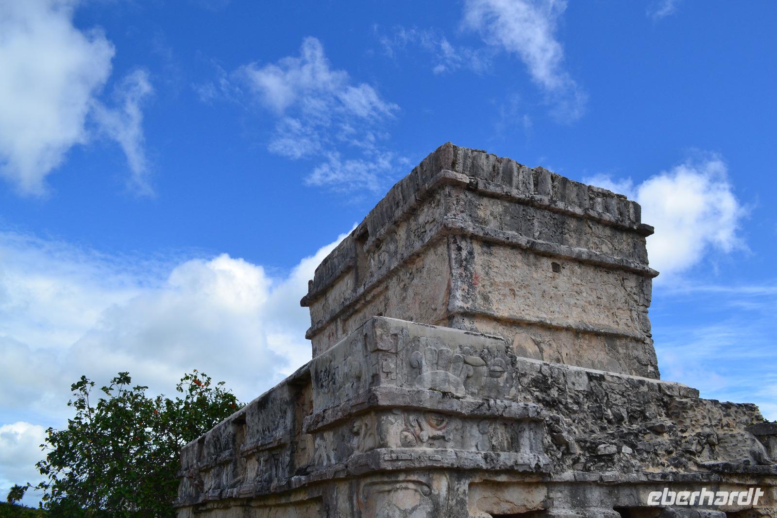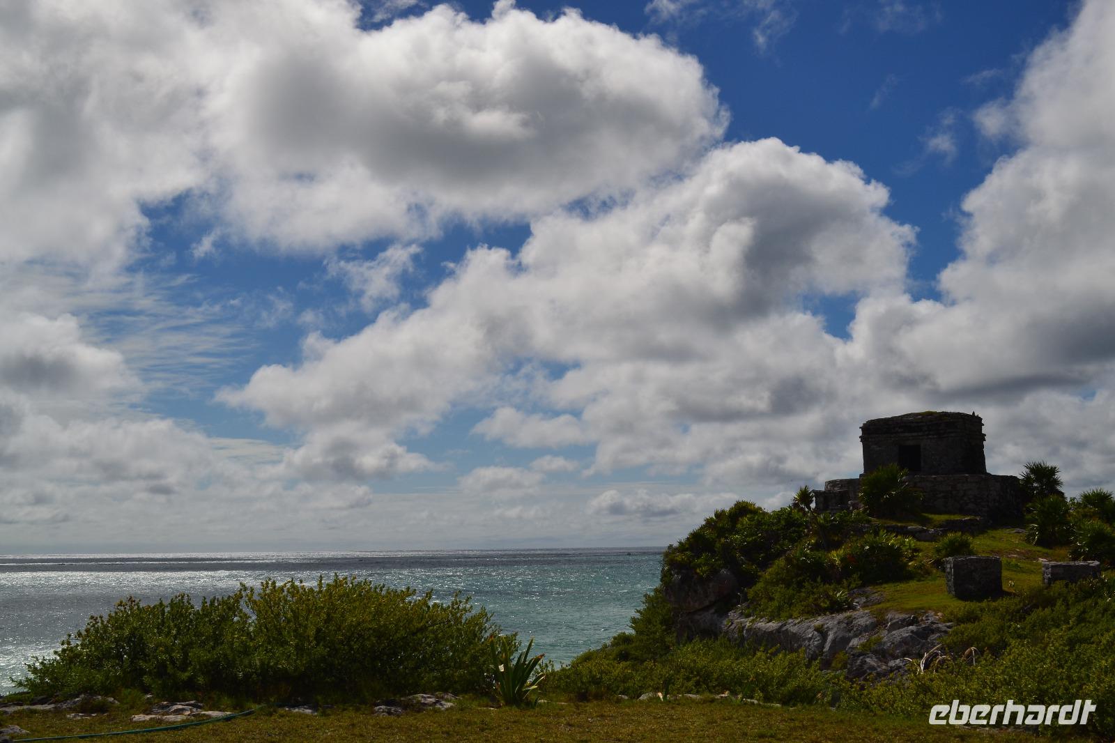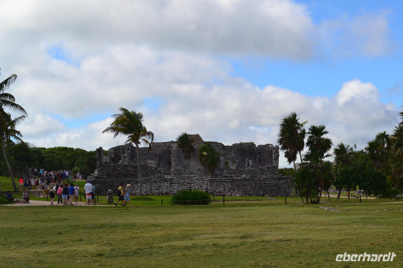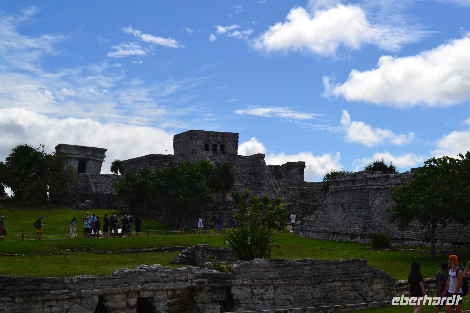 Zu einer humanen Zeit, nämlich 8 Uhr gingen wir gemeinsam von Bord und trafen im Shopping Center außerhalb des Kreuzfahrt Terminals auf unseren heutigen Reiseleiter Viktor. Er lebte in seinen jungen Jahren 8 Jahre lang in der Nähe von Ölbronn und beherschte dementsprechend unsere Sprache sehr gut. Sein erster Besuch in Deutschland war zur Eröffnung des Dönerladens von seinem Onkel in den 80 er Jahren in Berlin Kreuzberg. Zunächst liefen wir ca. 20 Minuten von dem großen Kreuzfahrt Anleger zu den öffentlichen Fähren. Übrigens können entlang der kleinen Insel Cozumel 8 Kreuzfahrtriesen gleichzeitig anlegen. Am heutigen Tag entdeckten wir 5 dieser Sorte. Nach ca. 35 Minuten erreichten wir den Hafen von Playa del Carmen am Festland Mexikos. Da es derzeit Winter in der Karibik ist, ließ der Regen nicht lang auf sich warten. Ausgerüstet mit Regenponochos und Schirmen gelangten wir nach einigen Metern zu unserem örtlichen Reisebus. Auf der kurzen 45-Minütigen Fahrt nach Tulum erzählte uns Viktor einiges von seinem Leben in Mexiko und von der Maya Kultur. Dort angekommen lachte die Sonne am Himmel bereits wieder und wir genossen den Spaziergang über die historische Stätte, welche als Besonderheit direkt am Meer gelegen ist. Dank den Erläuterungen unseres Reiseleiters konnten wir uns in das Leben der Mayas gut versetzen. Die nennenwertensten Gebäude sind der „Tempel des Herabsteigenden Gottes", der „Tempel des Windes" und der „Freskentempel". Pünktlich zur Mittagszeit und einem weiteren Regenschauer brachen wir zu unserem Mittagessen und Strandaufenthalt dem Serenity Camp auf. Nur für uns legte der Regen eine Pause ein, in welcher wir im Trockenen Essen und die Sonne, sowie den Strand genießen konnten. Als Vorspeise wurden uns Frühlingsrollen gereicht. Das Hauptgericht war ein Rindersteak mit Gemüse und das Dessert ein süßer Crêpe mit Eis. Nach dieser Stärkung hatten wir noch rund 1,5 Stunden Zeit um den Strand zum Baden und entspannen zu nutzen. Glücklicherweise hatten wir für unsere Erkundungen im freien immer Glück mit dem Wetter. Die Fährüberfahrt zurück nach Cozumel schlug dem ein oder anderen kräftig auf den Magen. Die Mein Schiff 6 legte heute eine Stunde später als geplant ab, da ein Ausflugsbus ein wenig Verspätung hatte.
