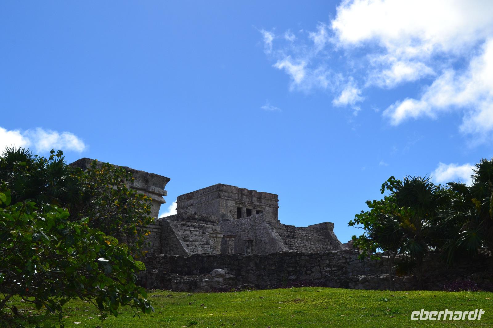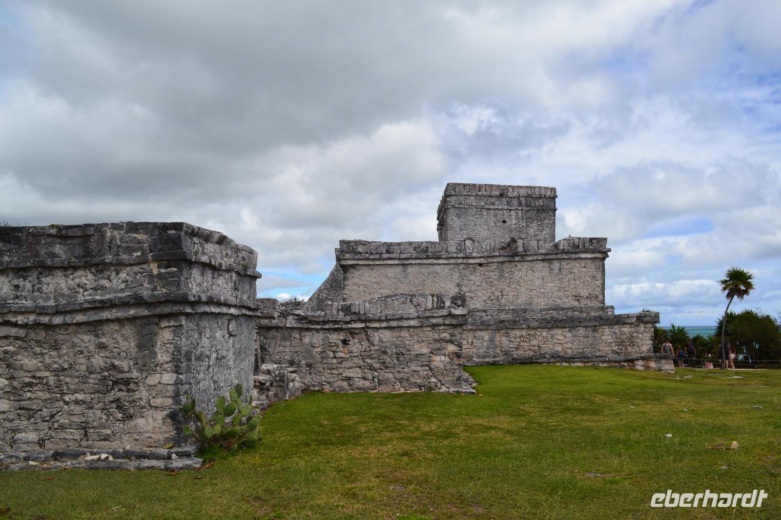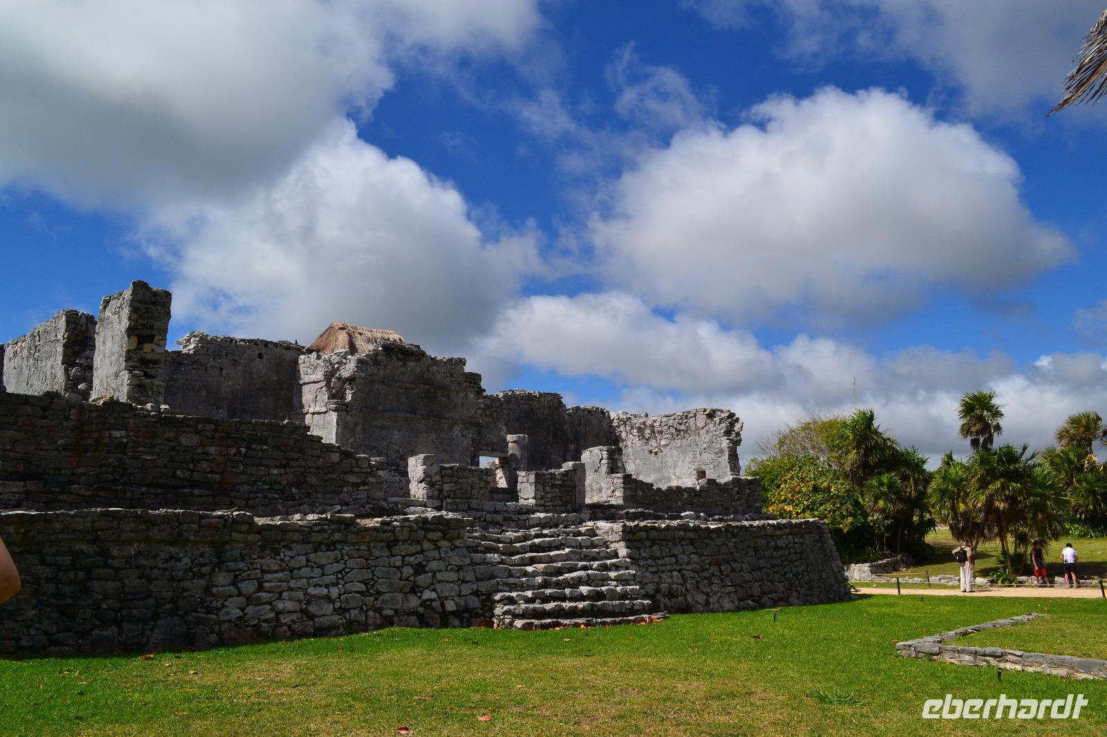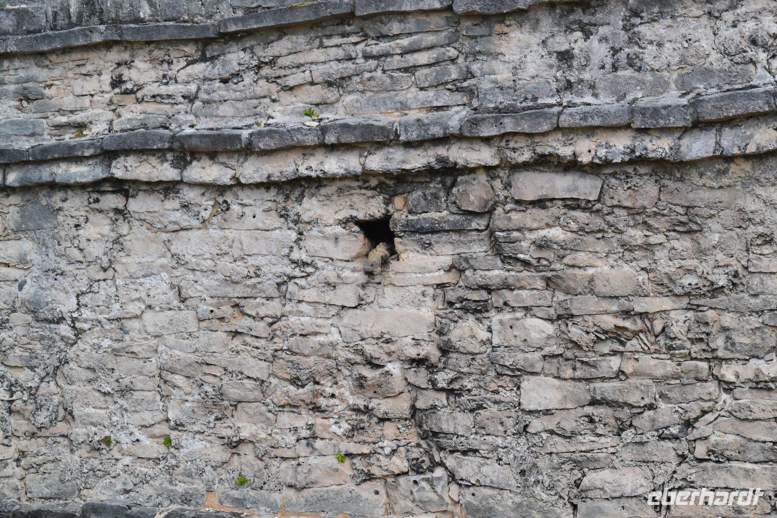 Zu einer humanen Zeit, nämlich 8 Uhr gingen wir gemeinsam von Bord und trafen im Shopping Center außerhalb des Kreuzfahrt Terminals auf unseren heutigen Reiseleiter Viktor. Er lebte in seinen jungen Jahren 8 Jahre lang in der Nähe von Ölbronn und beherschte dementsprechend unsere Sprache sehr gut. Sein erster Besuch in Deutschland war zur Eröffnung des Dönerladens von seinem Onkel in den 80 er Jahren in Berlin Kreuzberg. Zunächst liefen wir ca. 20 Minuten von dem großen Kreuzfahrt Anleger zu den öffentlichen Fähren. Übrigens können entlang der kleinen Insel Cozumel 8 Kreuzfahrtriesen gleichzeitig anlegen. Am heutigen Tag entdeckten wir 5 dieser Sorte. Nach ca. 35 Minuten erreichten wir den Hafen von Playa del Carmen am Festland Mexikos. Da es derzeit Winter in der Karibik ist, ließ der Regen nicht lang auf sich warten. Ausgerüstet mit Regenponochos und Schirmen gelangten wir nach einigen Metern zu unserem örtlichen Reisebus. Auf der kurzen 45-Minütigen Fahrt nach Tulum erzählte uns Viktor einiges von seinem Leben in Mexiko und von der Maya Kultur. Dort angekommen lachte die Sonne am Himmel bereits wieder und wir genossen den Spaziergang über die historische Stätte, welche als Besonderheit direkt am Meer gelegen ist. Dank den Erläuterungen unseres Reiseleiters konnten wir uns in das Leben der Mayas gut versetzen. Die nennenwertensten Gebäude sind der „Tempel des Herabsteigenden Gottes", der „Tempel des Windes" und der „Freskentempel". Pünktlich zur Mittagszeit und einem weiteren Regenschauer brachen wir zu unserem Mittagessen und Strandaufenthalt dem Serenity Camp auf. Nur für uns legte der Regen eine Pause ein, in welcher wir im Trockenen Essen und die Sonne, sowie den Strand genießen konnten. Als Vorspeise wurden uns Frühlingsrollen gereicht. Das Hauptgericht war ein Rindersteak mit Gemüse und das Dessert ein süßer Crêpe mit Eis. Nach dieser Stärkung hatten wir noch rund 1,5 Stunden Zeit um den Strand zum Baden und entspannen zu nutzen. Glücklicherweise hatten wir für unsere Erkundungen im freien immer Glück mit dem Wetter. Die Fährüberfahrt zurück nach Cozumel schlug dem ein oder anderen kräftig auf den Magen. Die Mein Schiff 6 legte heute eine Stunde später als geplant ab, da ein Ausflugsbus ein wenig Verspätung hatte.
