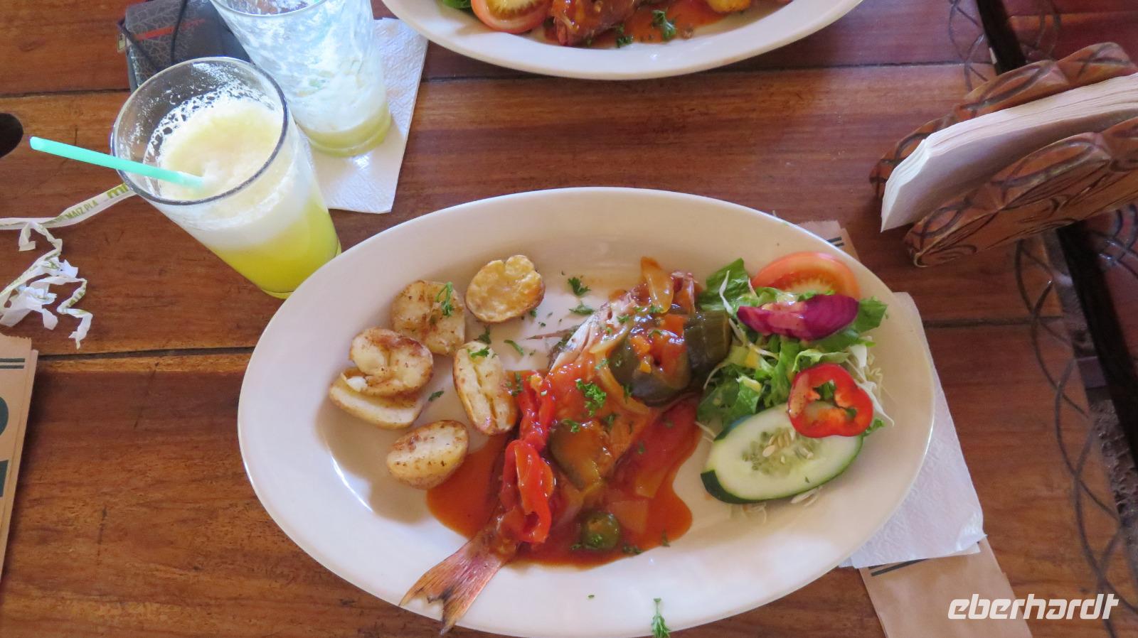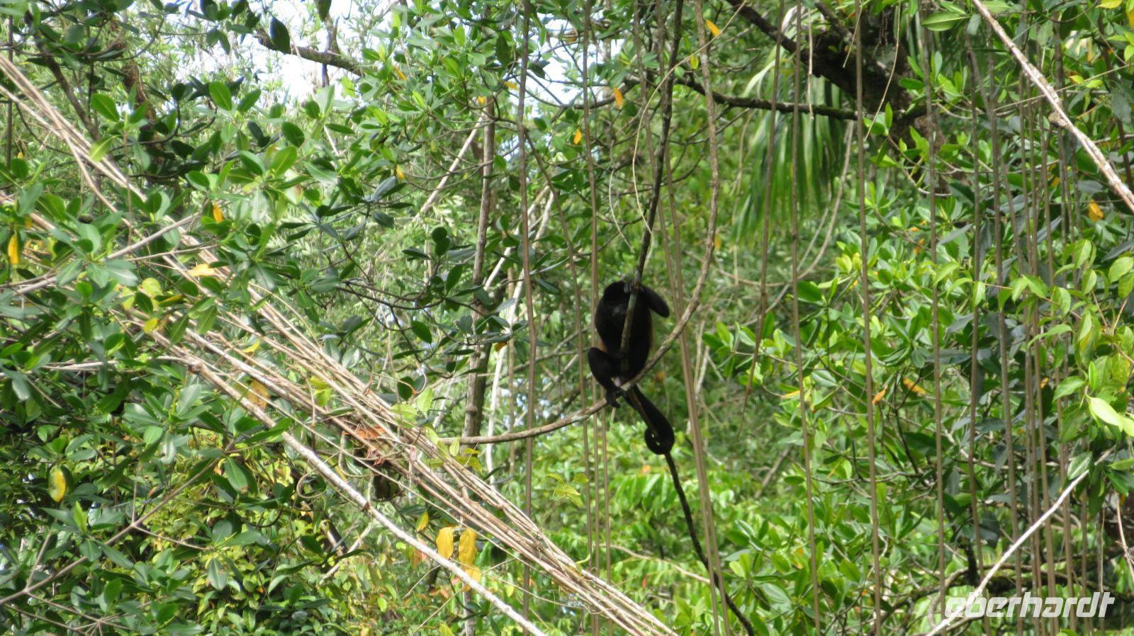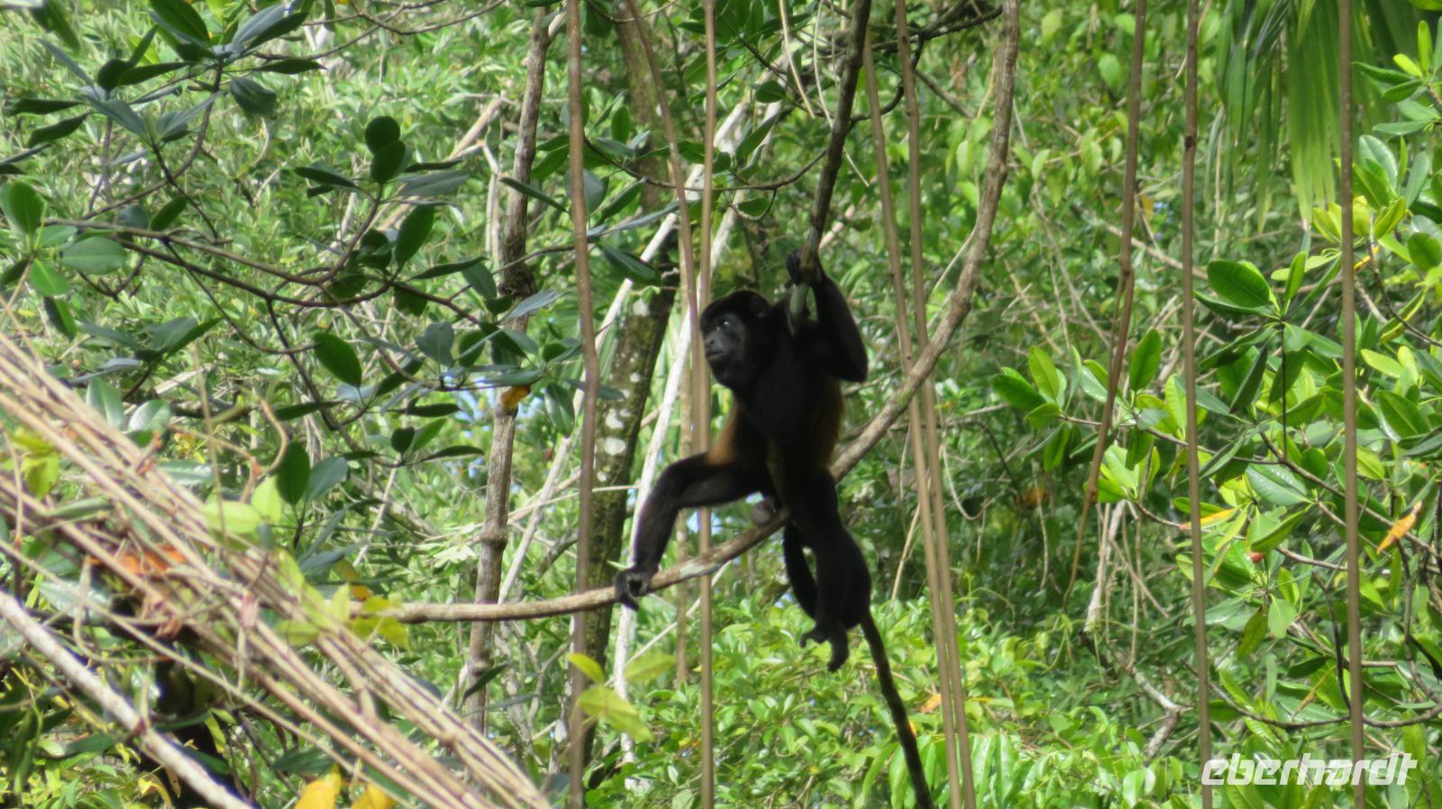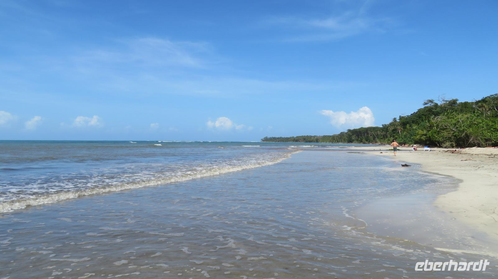 Im Anschluss an die Fahrt gibt es süße, schmackhafte Ananas. Hier würde man sich am liebsten reinlegen. Nachdem wir dann eine Ehrenrunde in Richtung Einbahnstraße gedreht haben, bringt uns der Fahrer nach Cahuita. Bevor wir unsere kleine Wanderung machen, speisen wir hier in einem kleinen einheimischen Lokal und lassen es uns gut gehen. Bei dem anschließenden Spaziergang ist es wie bei der Bootsfahrt. Unsere Guides sehen schon Tiere, da wussten die Tiere noch nicht einmal, dass sie bald dort sind. Das ist einfach super. Somit sehen wir auch hier wieder Äffchen, Faultiere, Waschbären, allerhand unterschiedliche Vögel und zwei Schlangen.