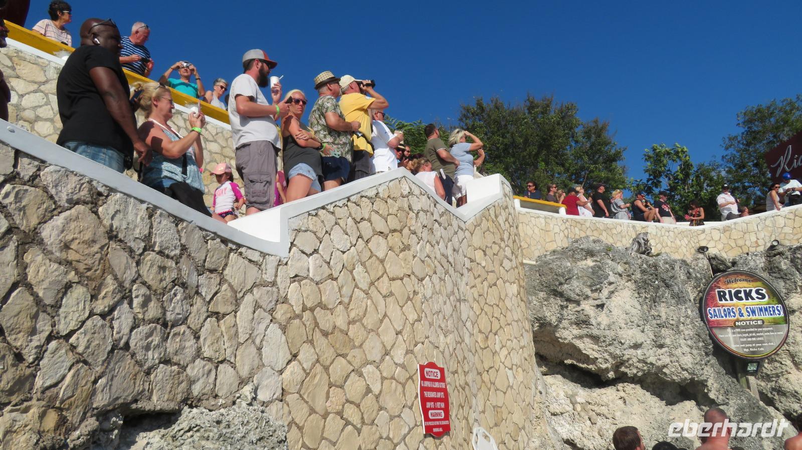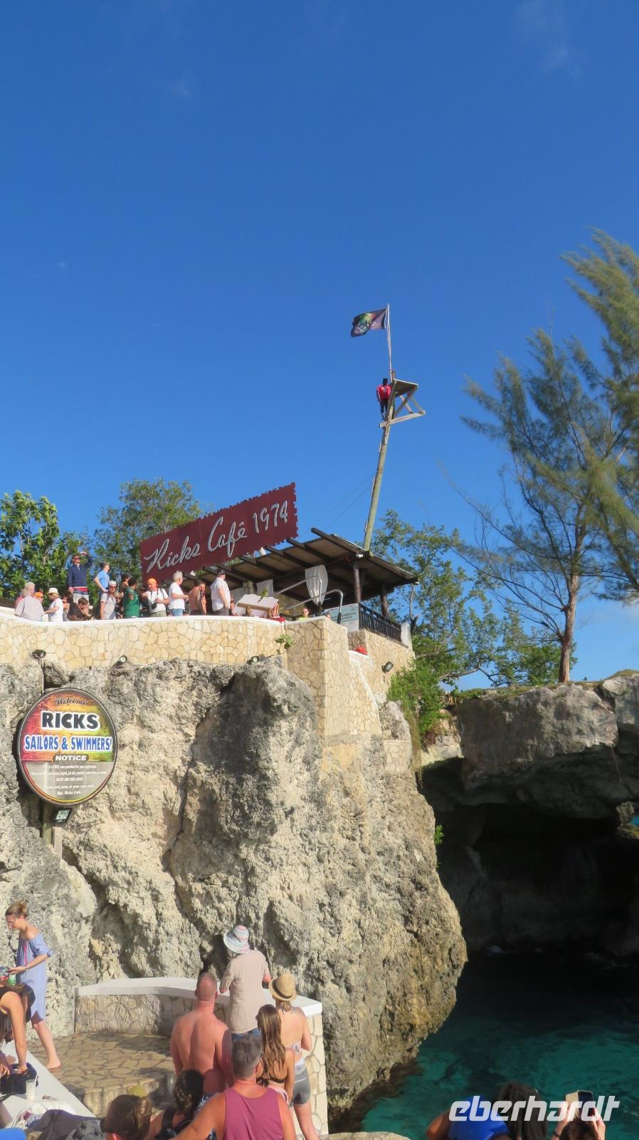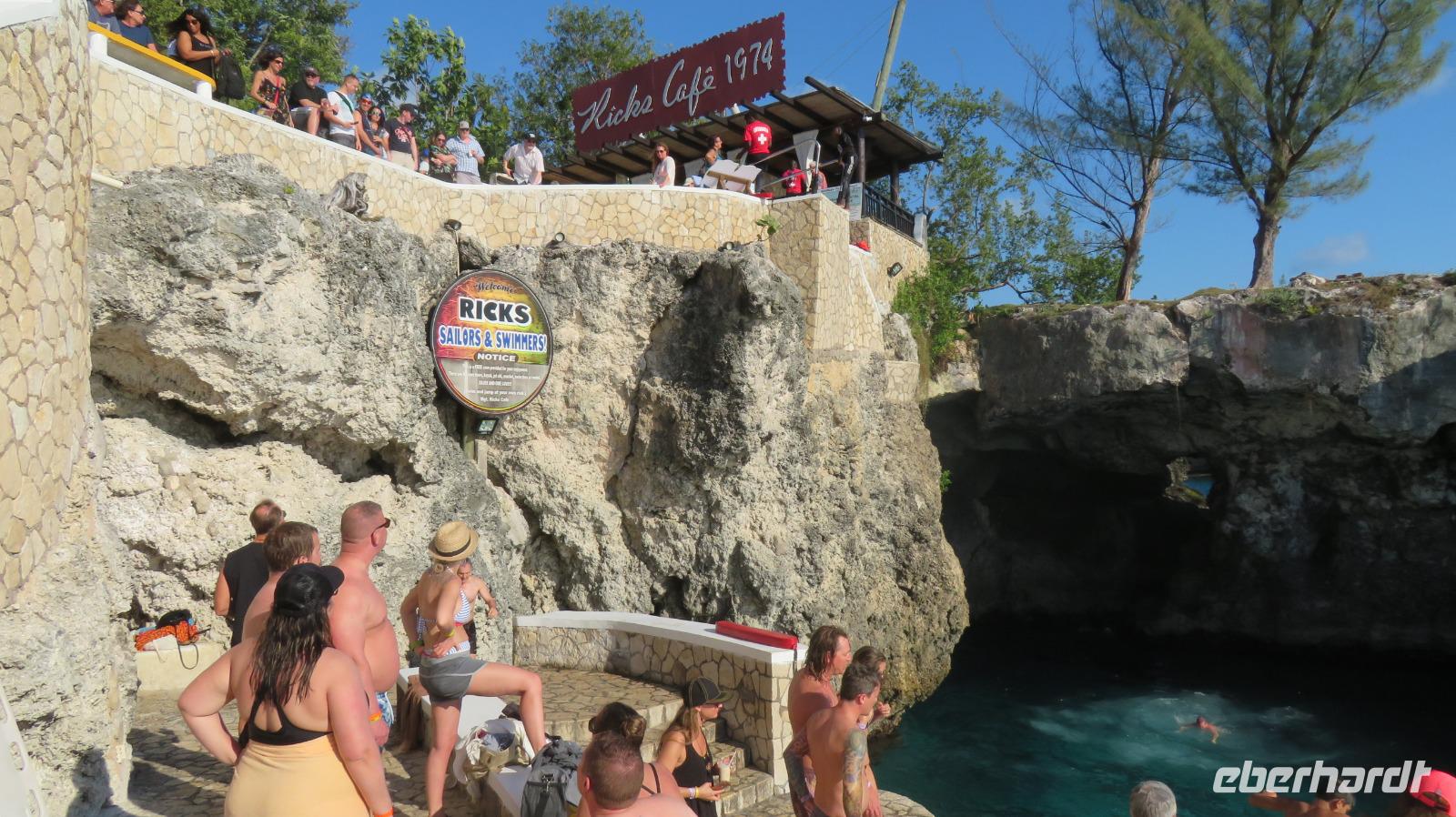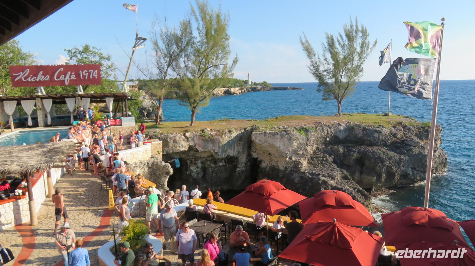 In der Nähe von Negril wird dann die Badehose ausgepackt und wir genießen die Freizeit am Strand. Zum Nachmittag geht es weiter zu der bekanntesten Bar Jamaikas, zu Rick's Cafe. Hier herrscht eine nette Atmosphäre und das Highlight sind die Klippenspringer. Wenn genügend Geld von den Gästen gesammelt wurde, springen die Artisten in die Tiefe. Das ist schon beeindruckend. Leider müssen wir vor dem Sonnenuntergang das nette Fleckchen verlassen und machen uns auf in Richtung Schiff.