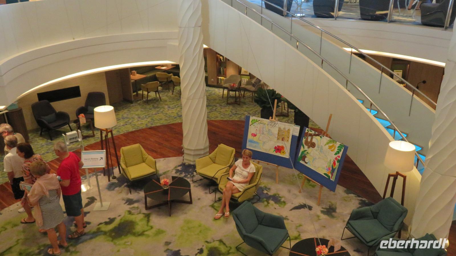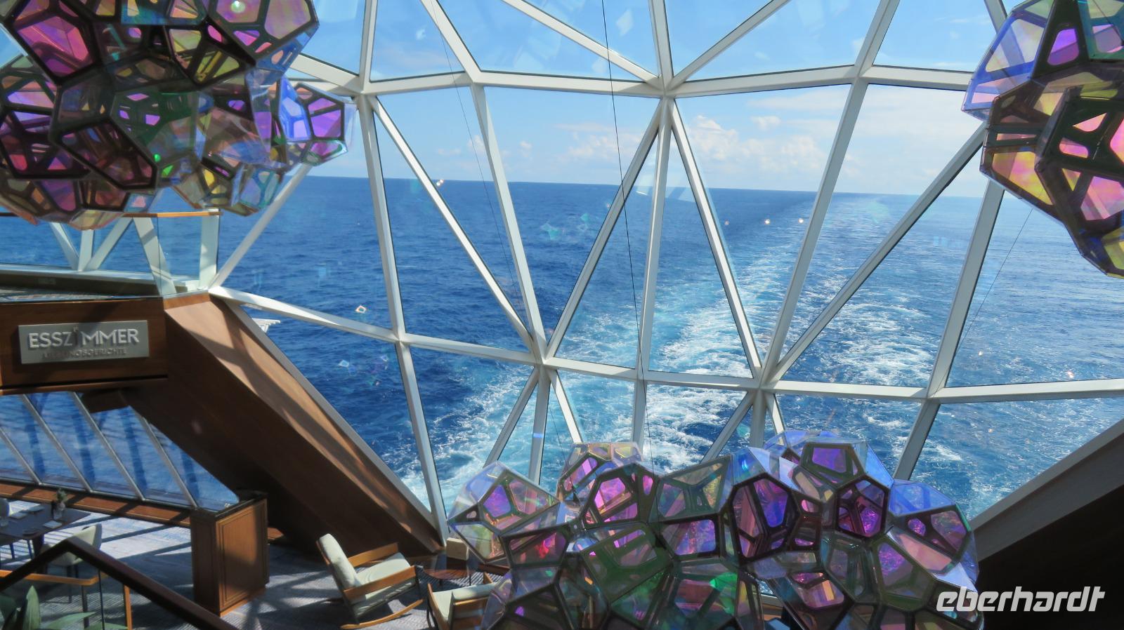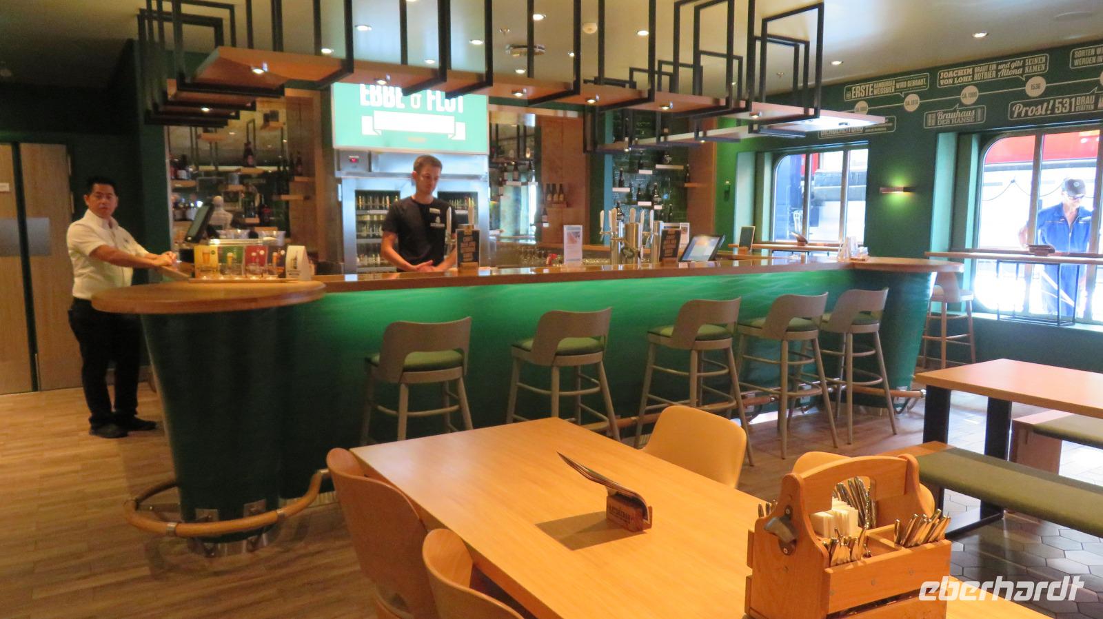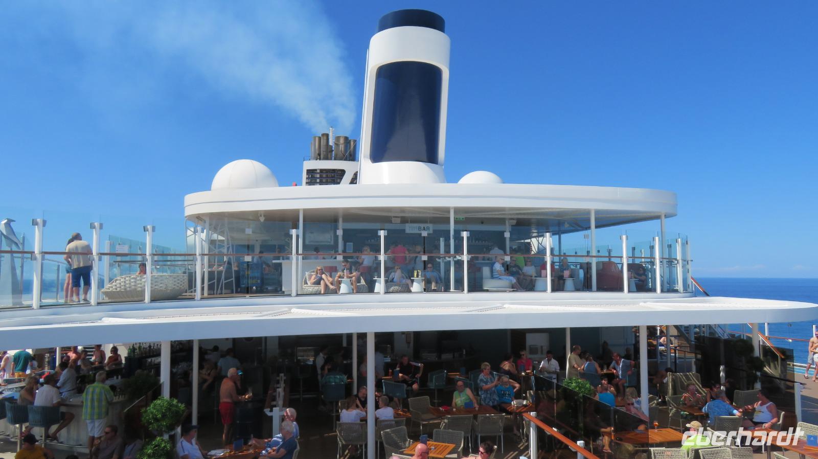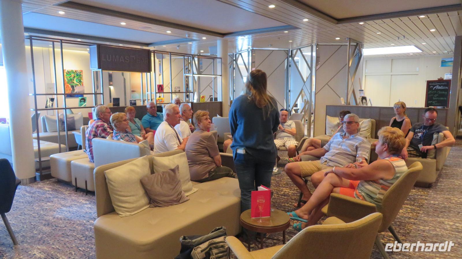 Nach der ersten ruhigen Nacht und einem ausgezeichneten Frühstück, treffen wir uns alle in der Lumus Bar und werden von Louren begrüßt. Sie arbeitet hier im Gäste Service, früher mal Rezeption, aber Gäste Service klingt natürlich viel besser. Und wie es sich für so einen Service gehört, ist dieser für die Zufriedenheit der Gäste zuständig. Und wir wird man zufrieden? Wenn man sich nicht dauernd verläuft und Klarheit darüber herrscht, wo vorn und hinten ist. Dies will Louren ändern und so kommen wir in den Genuss eines exklusiven Schiffsrundganges. Der beste Stopp auf dem Rundgang war der Halt an der Eisbar. Bei blauen Himmel und 29 Grad eine willkommene Abkühlung.