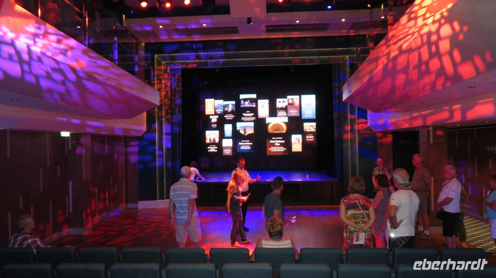 Das gibt es doch nicht. Es ist tatsächlich mal etwas stürmisch. Die letzten Tage hatte ich eher das Gefühl, wir schippern über einen großen See. Leider stand ausgerechnet heute die Revanche im großen Shuffleboard an. Daraus wird nichts, da das Außendeck gesperrt wurde. Daher siedeln wir in unsere Lumas Bar um und die nötigen Informationen für den morgigen Tag werden besprochen. Im Prinzip ist alles ganz einfach, aber erst, wenn man das System dahinter verstanden hat.