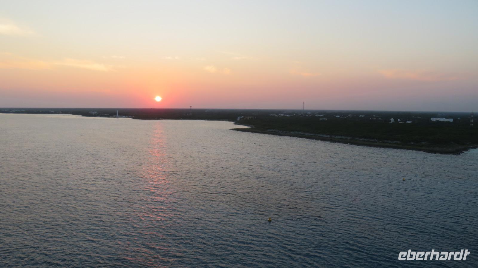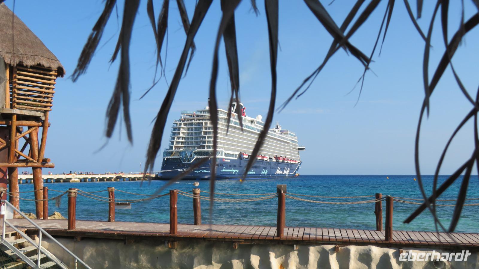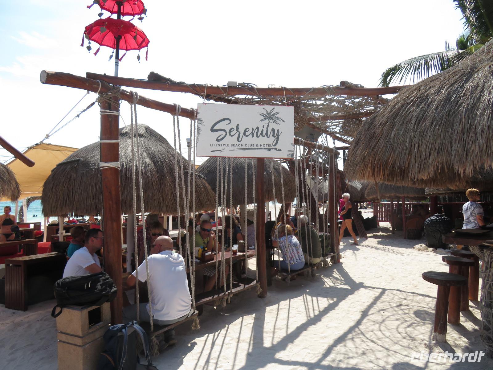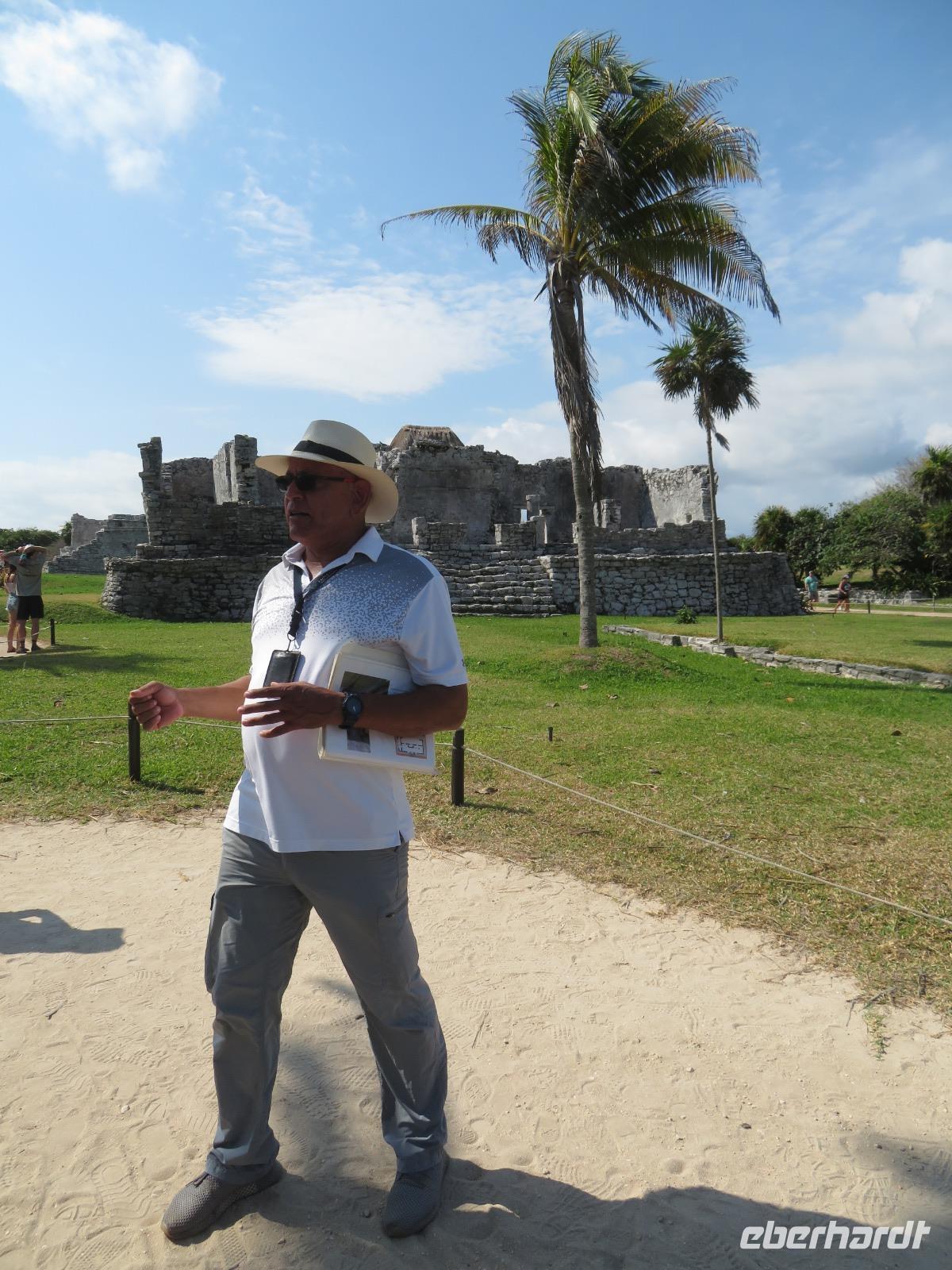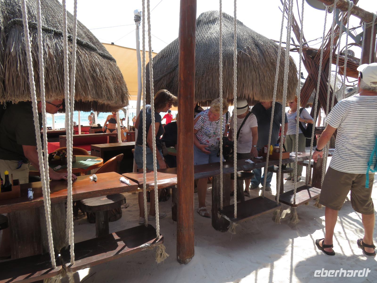 Viva la Mexico. Heute ist der Hafen vollbesetzt. Neben uns stehen noch vier weitere Schiffe und insgesamt können acht Kreuzfahrtschiffe auf der vorgelagerten Insel ankern. Wir wollen aber nicht auf der Insel bleiben und somit führt uns Julio, unser Guide für heute, zur Fähre. Nach 35 Minuten fahrt landen wir am Festland in Mexico wo wir auf unseren Deluxe Bus treffen. So viel Beinfreiheit hatte ich auch noch nie im Bus. Unser erstes Ziel ist die Maya Stadt Tulum. Hier haben die Mexikaner die Kommerzialisierung des Geländes perfektioniert. An jeder Ecke kann man seine Dollar los werden. Julio weiß aber wie der Hase läuft und führt uns zielsicher zum Bus und wenig später durch das Gelände. Die Sonne meint es wieder recht gut mit uns und so hüpfen wir von Schatten zu Schatten und lauschen den Erläuterungen von unserem Guide. Tulum zählte im 13. und 14. Jahrhundert zu den größten Städten auf der Halbinsel Yucatan. Aufgrund ihrer direkten Lage an der Riviera Maya konnte Handel über das Meer betrieben werden. Des Weiteren wurde die Stätte zur Beobachtung des Sternenhimmels benutzt und somit konnte der Maya Kalender hier ständig überprüft werden. Nachdem wir uns satt gesehen hatten, freuten wir uns alle auf das Mittagessen und das Baden im Meer. Im Serenity Camp bekommen wir leckere Frühlingsrollen, Rindersteak und einen tollen Crêpe mit Eis serviert. Wir setzten uns im Anschluss über den alten Spruch, nach dem Essen sollst du ruhen oder 1000 Schritte tun, hinweg und stürzen uns direkt in die warmen Fluten. Ach, das Leben ist doch schön. Dies hat sich vermutlich auch meine Badehose gedacht und deswegen ist sie gleich vor Ort geblieben.