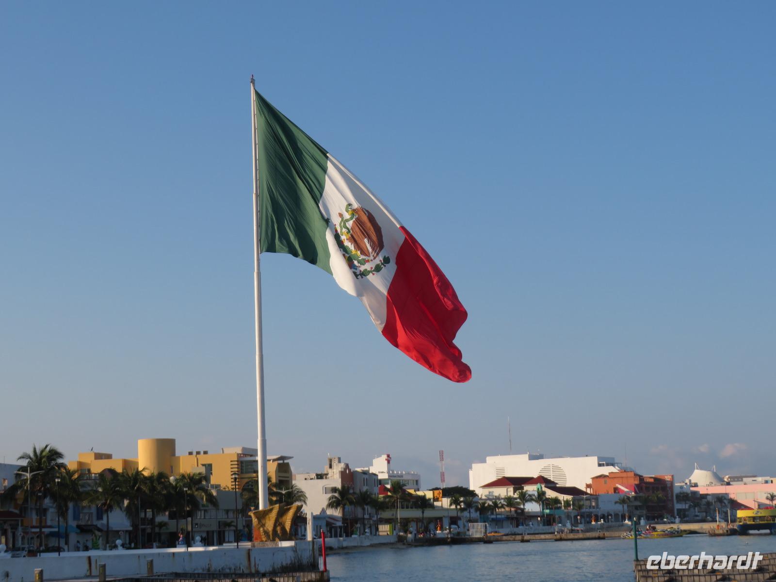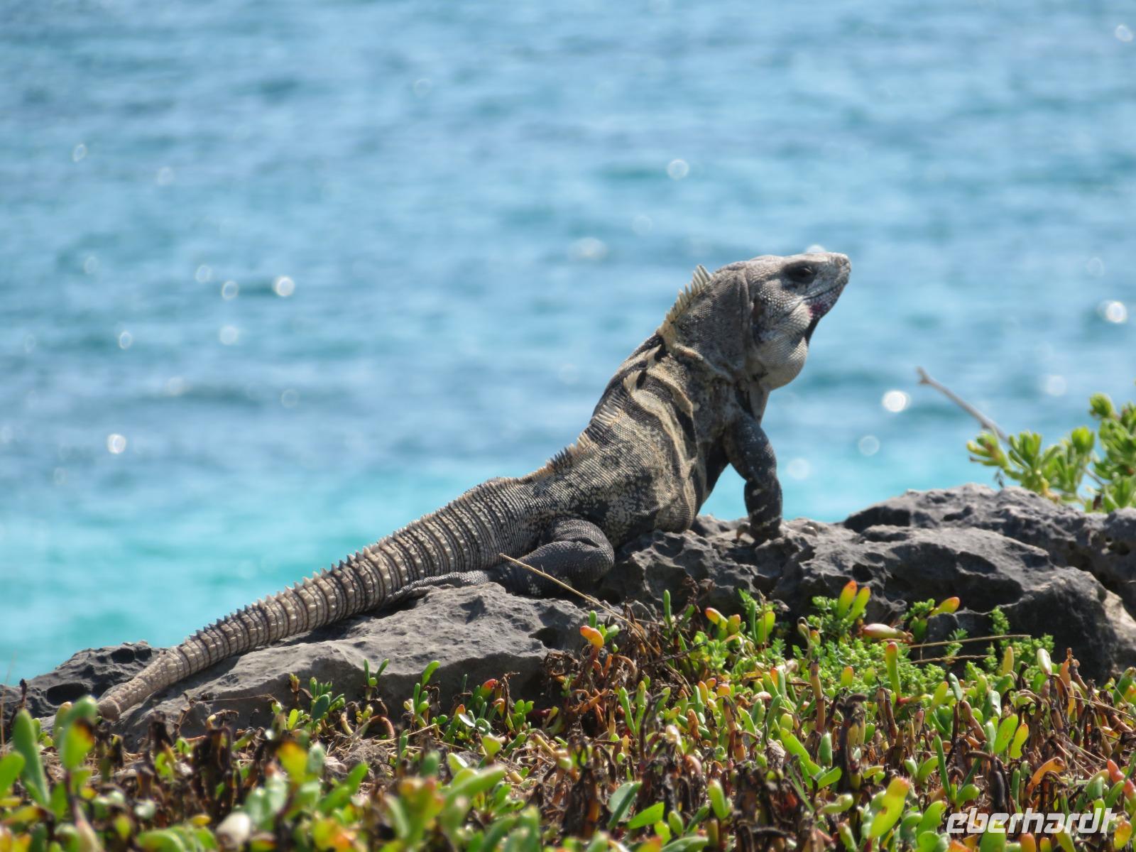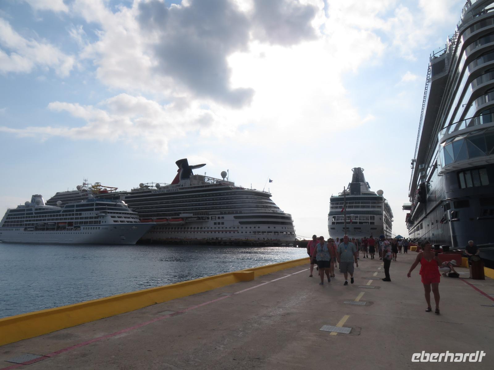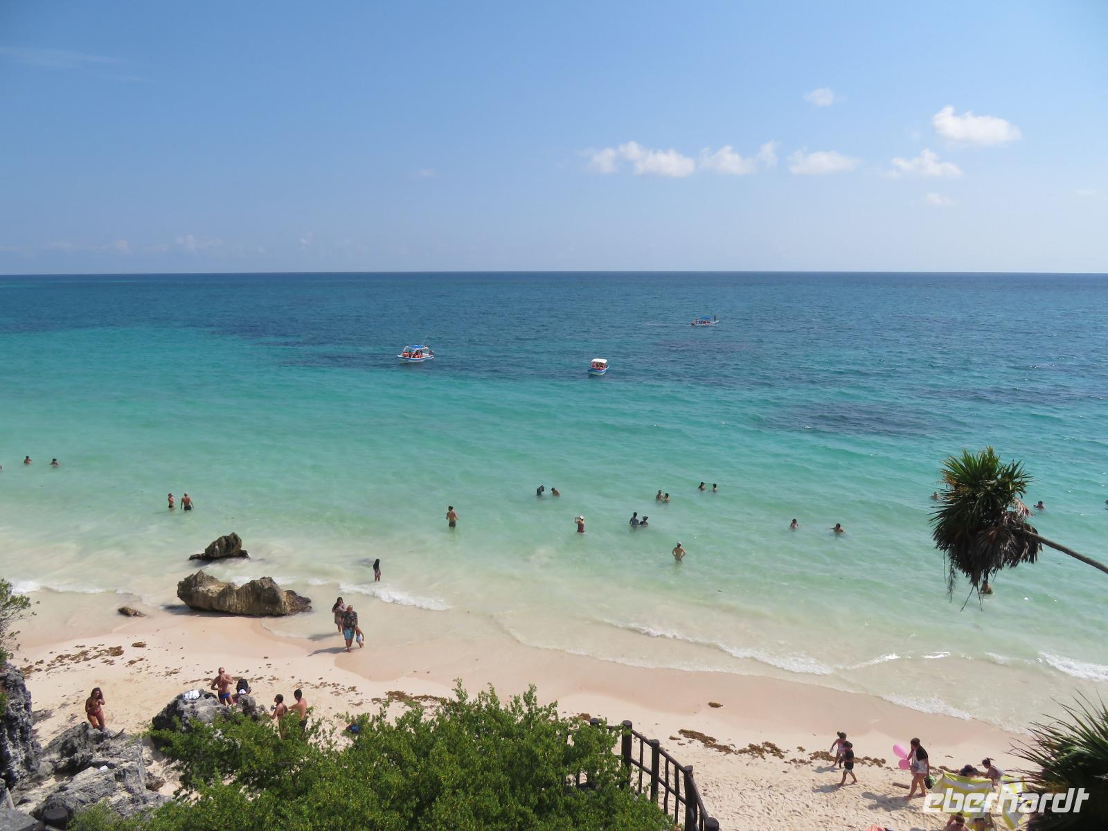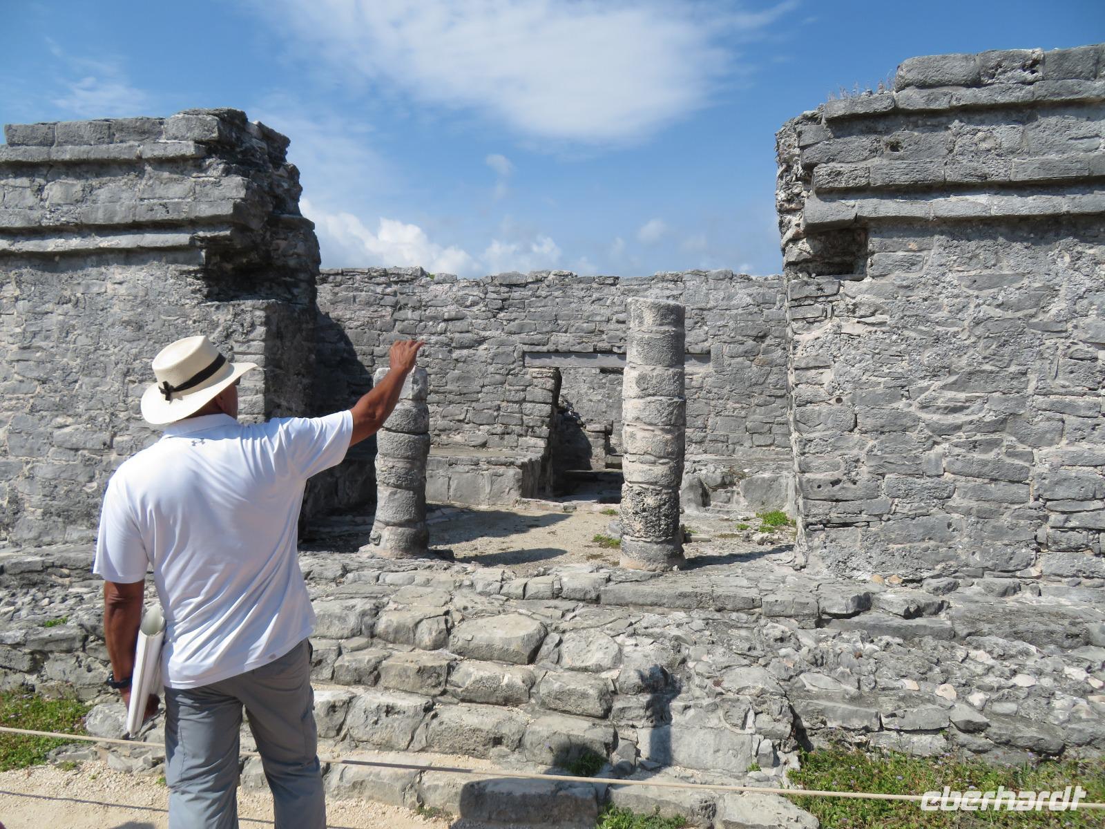 Viva la Mexico. Heute ist der Hafen vollbesetzt. Neben uns stehen noch vier weitere Schiffe und insgesamt können acht Kreuzfahrtschiffe auf der vorgelagerten Insel ankern. Wir wollen aber nicht auf der Insel bleiben und somit führt uns Julio, unser Guide für heute, zur Fähre. Nach 35 Minuten fahrt landen wir am Festland in Mexico wo wir auf unseren Deluxe Bus treffen. So viel Beinfreiheit hatte ich auch noch nie im Bus. Unser erstes Ziel ist die Maya Stadt Tulum. Hier haben die Mexikaner die Kommerzialisierung des Geländes perfektioniert. An jeder Ecke kann man seine Dollar los werden. Julio weiß aber wie der Hase läuft und führt uns zielsicher zum Bus und wenig später durch das Gelände. Die Sonne meint es wieder recht gut mit uns und so hüpfen wir von Schatten zu Schatten und lauschen den Erläuterungen von unserem Guide. Tulum zählte im 13. und 14. Jahrhundert zu den größten Städten auf der Halbinsel Yucatan. Aufgrund ihrer direkten Lage an der Riviera Maya konnte Handel über das Meer betrieben werden. Des Weiteren wurde die Stätte zur Beobachtung des Sternenhimmels benutzt und somit konnte der Maya Kalender hier ständig überprüft werden. Nachdem wir uns satt gesehen hatten, freuten wir uns alle auf das Mittagessen und das Baden im Meer. Im Serenity Camp bekommen wir leckere Frühlingsrollen, Rindersteak und einen tollen Crêpe mit Eis serviert. Wir setzten uns im Anschluss über den alten Spruch, nach dem Essen sollst du ruhen oder 1000 Schritte tun, hinweg und stürzen uns direkt in die warmen Fluten. Ach, das Leben ist doch schön. Dies hat sich vermutlich auch meine Badehose gedacht und deswegen ist sie gleich vor Ort geblieben.
