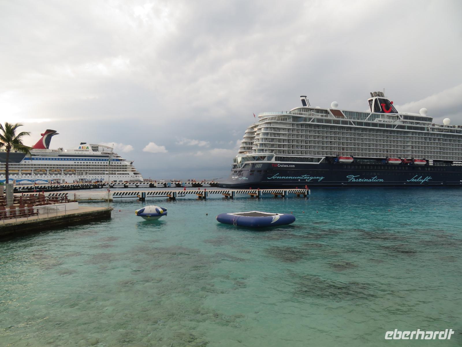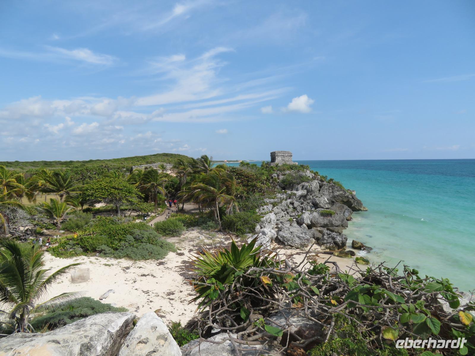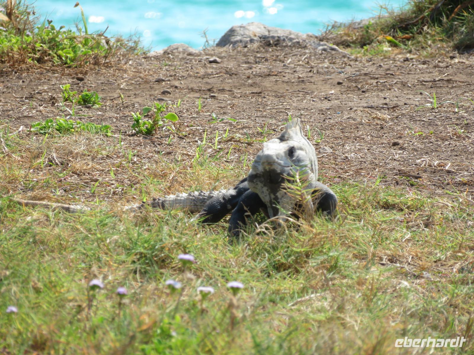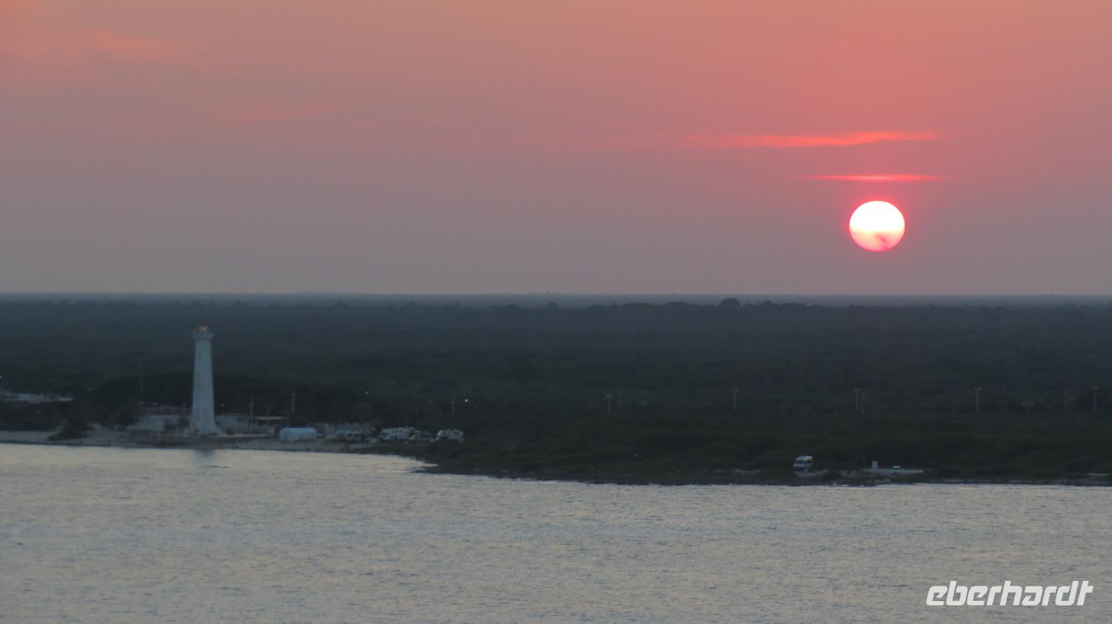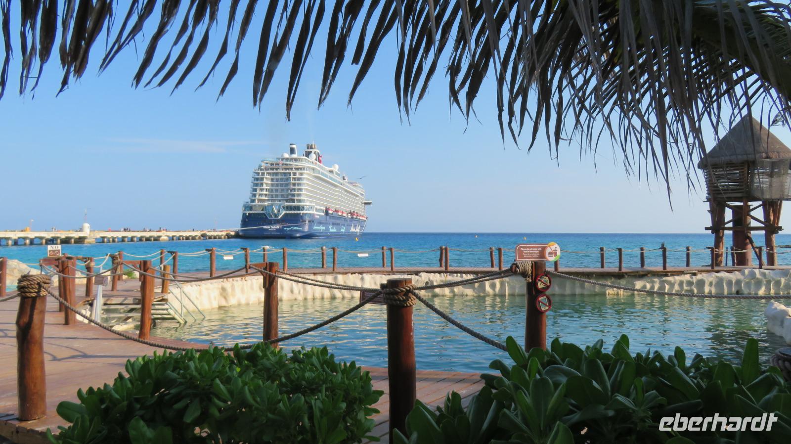 Viva la Mexico. Heute ist der Hafen vollbesetzt. Neben uns stehen noch vier weitere Schiffe und insgesamt können acht Kreuzfahrtschiffe auf der vorgelagerten Insel ankern. Wir wollen aber nicht auf der Insel bleiben und somit führt uns Julio, unser Guide für heute, zur Fähre. Nach 35 Minuten fahrt landen wir am Festland in Mexico wo wir auf unseren Deluxe Bus treffen. So viel Beinfreiheit hatte ich auch noch nie im Bus. Unser erstes Ziel ist die Maya Stadt Tulum. Hier haben die Mexikaner die Kommerzialisierung des Geländes perfektioniert. An jeder Ecke kann man seine Dollar los werden. Julio weiß aber wie der Hase läuft und führt uns zielsicher zum Bus und wenig später durch das Gelände. Die Sonne meint es wieder recht gut mit uns und so hüpfen wir von Schatten zu Schatten und lauschen den Erläuterungen von unserem Guide. Tulum zählte im 13. und 14. Jahrhundert zu den größten Städten auf der Halbinsel Yucatan. Aufgrund ihrer direkten Lage an der Riviera Maya konnte Handel über das Meer betrieben werden. Des Weiteren wurde die Stätte zur Beobachtung des Sternenhimmels benutzt und somit konnte der Maya Kalender hier ständig überprüft werden. Nachdem wir uns satt gesehen hatten, freuten wir uns alle auf das Mittagessen und das Baden im Meer. Im Serenity Camp bekommen wir leckere Frühlingsrollen, Rindersteak und einen tollen Crêpe mit Eis serviert. Wir setzten uns im Anschluss über den alten Spruch, nach dem Essen sollst du ruhen oder 1000 Schritte tun, hinweg und stürzen uns direkt in die warmen Fluten. Ach, das Leben ist doch schön. Dies hat sich vermutlich auch meine Badehose gedacht und deswegen ist sie gleich vor Ort geblieben.