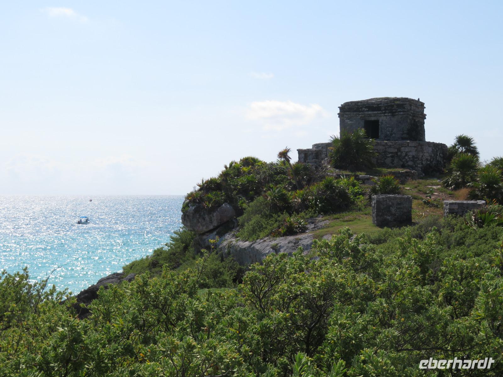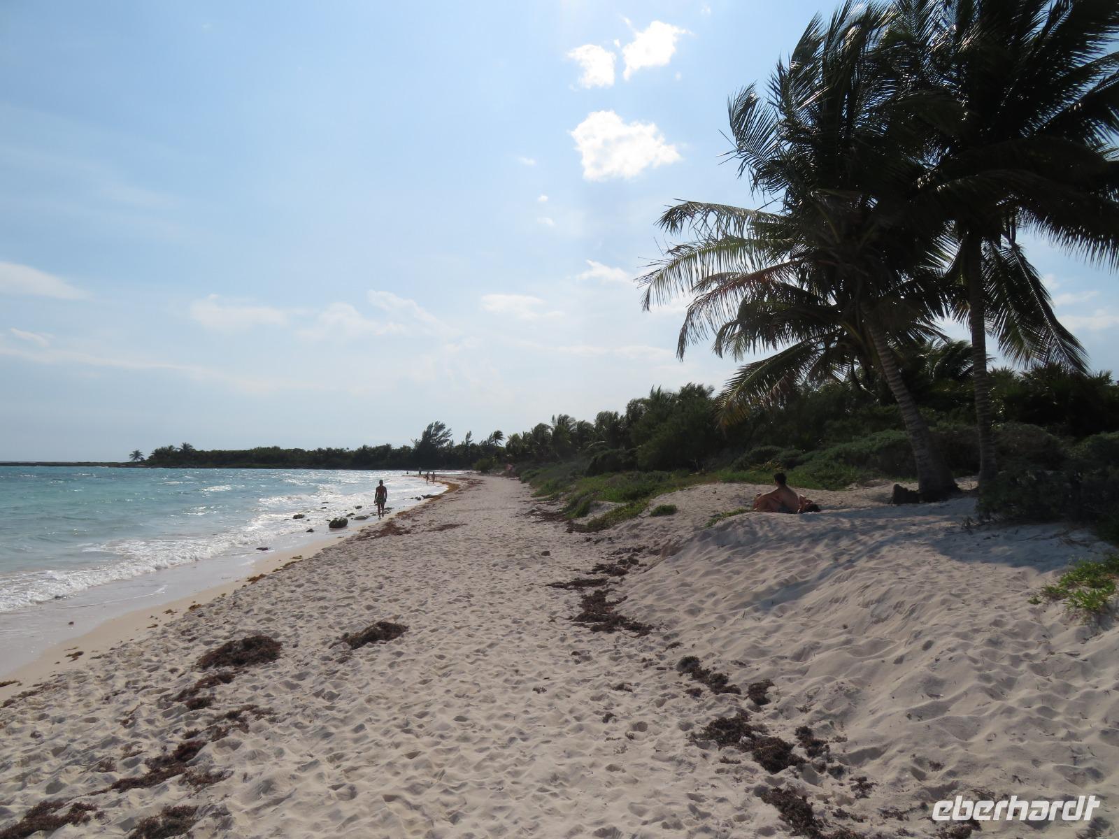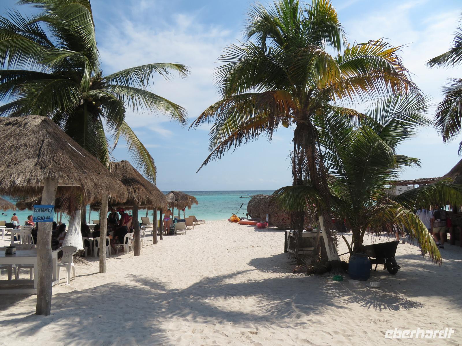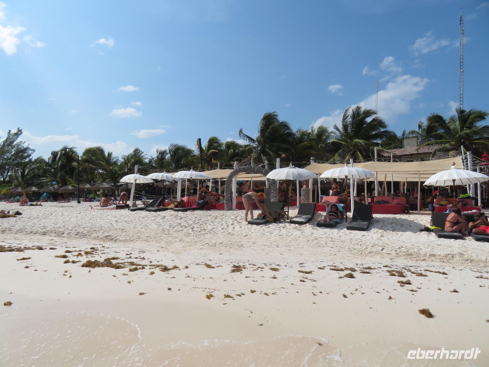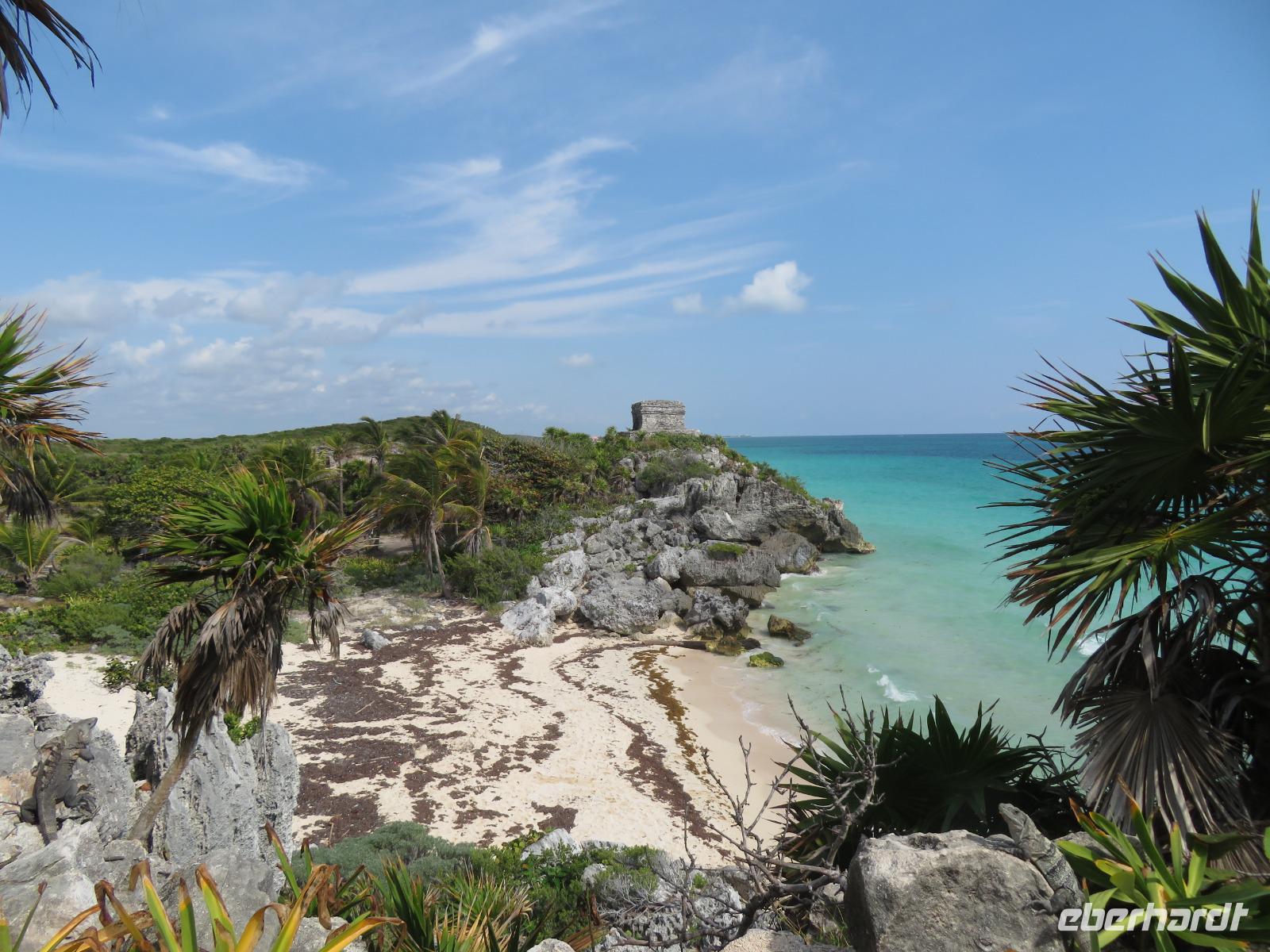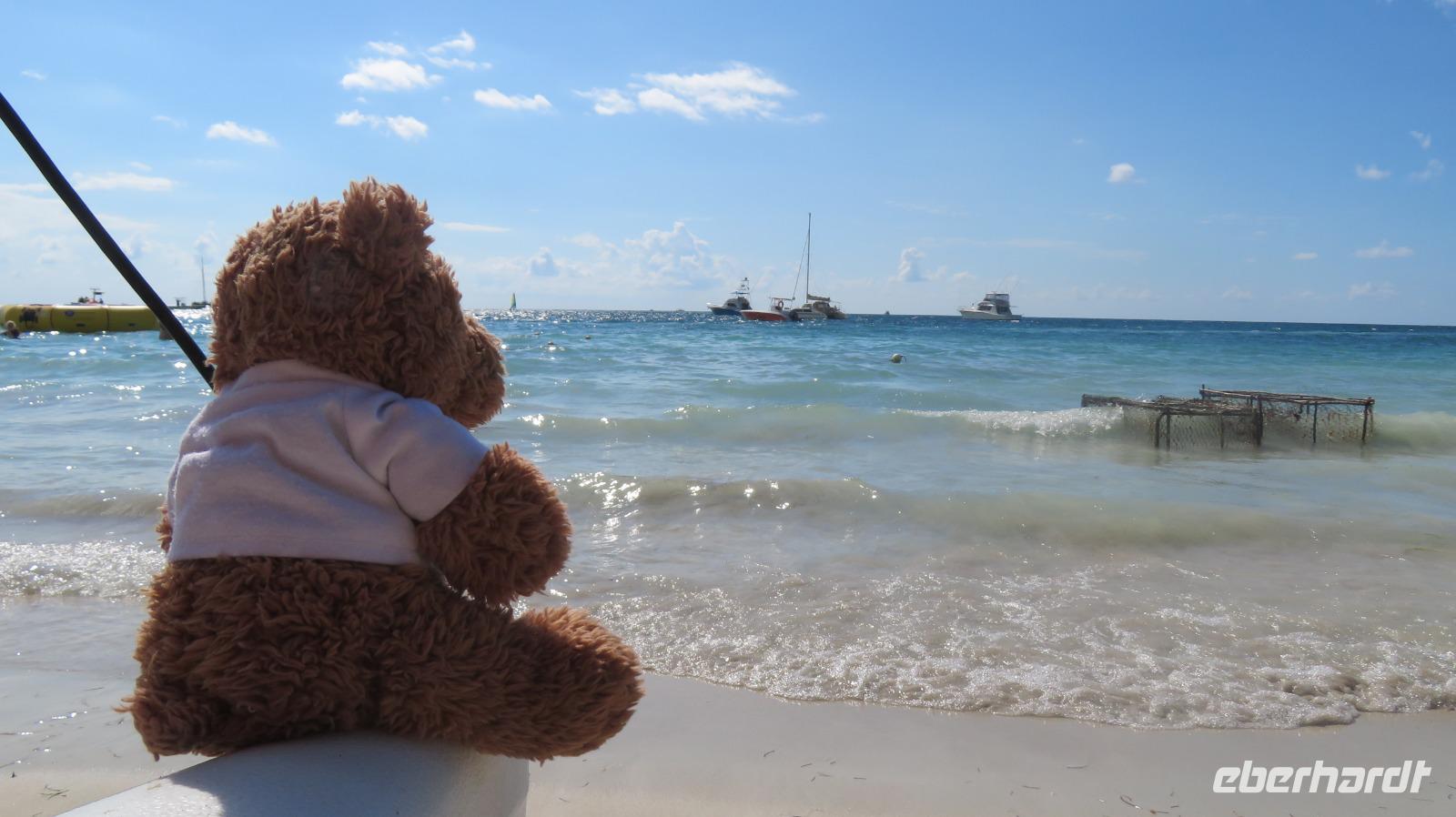 Viva la Mexico. Heute ist der Hafen vollbesetzt. Neben uns stehen noch vier weitere Schiffe und insgesamt können acht Kreuzfahrtschiffe auf der vorgelagerten Insel ankern. Wir wollen aber nicht auf der Insel bleiben und somit führt uns Julio, unser Guide für heute, zur Fähre. Nach 35 Minuten fahrt landen wir am Festland in Mexico wo wir auf unseren Deluxe Bus treffen. So viel Beinfreiheit hatte ich auch noch nie im Bus. Unser erstes Ziel ist die Maya Stadt Tulum. Hier haben die Mexikaner die Kommerzialisierung des Geländes perfektioniert. An jeder Ecke kann man seine Dollar los werden. Julio weiß aber wie der Hase läuft und führt uns zielsicher zum Bus und wenig später durch das Gelände. Die Sonne meint es wieder recht gut mit uns und so hüpfen wir von Schatten zu Schatten und lauschen den Erläuterungen von unserem Guide. Tulum zählte im 13. und 14. Jahrhundert zu den größten Städten auf der Halbinsel Yucatan. Aufgrund ihrer direkten Lage an der Riviera Maya konnte Handel über das Meer betrieben werden. Des Weiteren wurde die Stätte zur Beobachtung des Sternenhimmels benutzt und somit konnte der Maya Kalender hier ständig überprüft werden. Nachdem wir uns satt gesehen hatten, freuten wir uns alle auf das Mittagessen und das Baden im Meer. Im Serenity Camp bekommen wir leckere Frühlingsrollen, Rindersteak und einen tollen Crêpe mit Eis serviert. Wir setzten uns im Anschluss über den alten Spruch, nach dem Essen sollst du ruhen oder 1000 Schritte tun, hinweg und stürzen uns direkt in die warmen Fluten. Ach, das Leben ist doch schön. Dies hat sich vermutlich auch meine Badehose gedacht und deswegen ist sie gleich vor Ort geblieben.