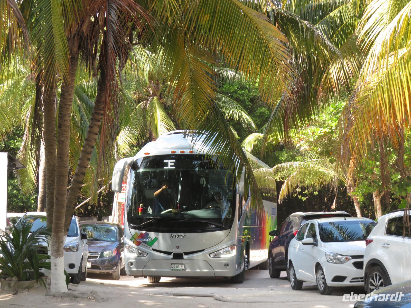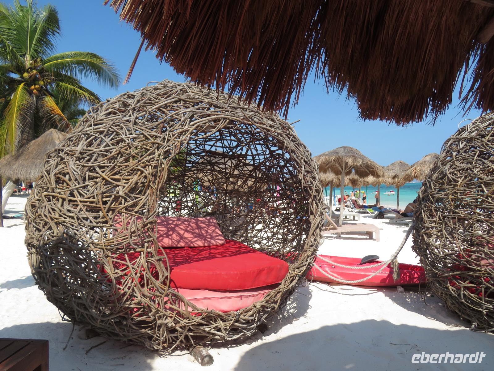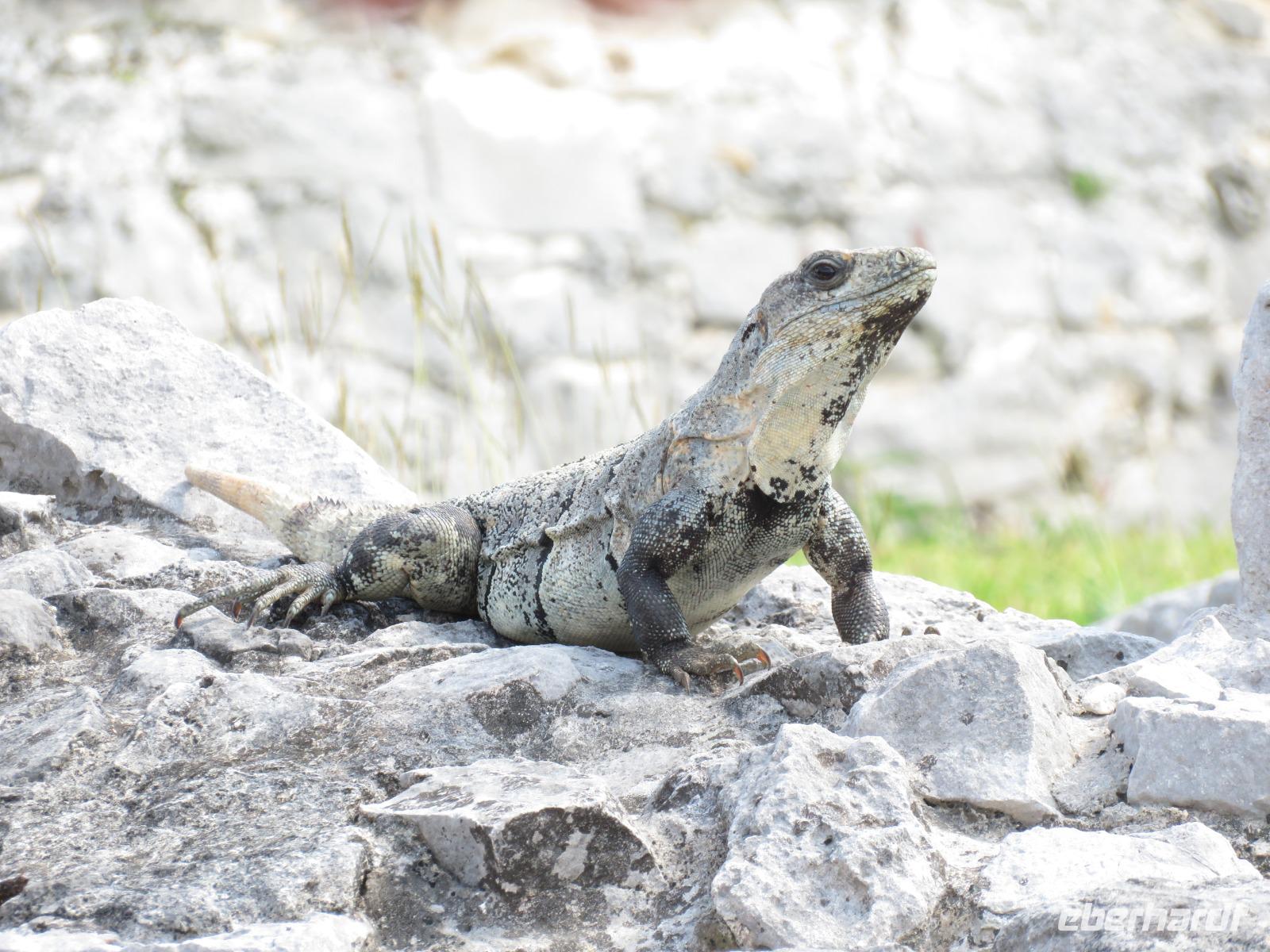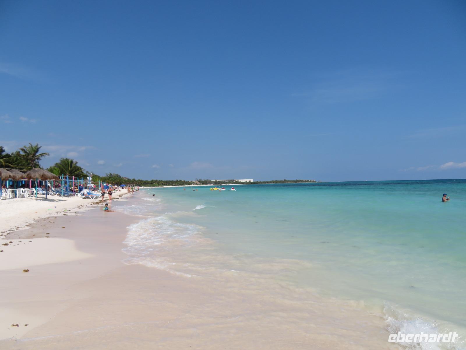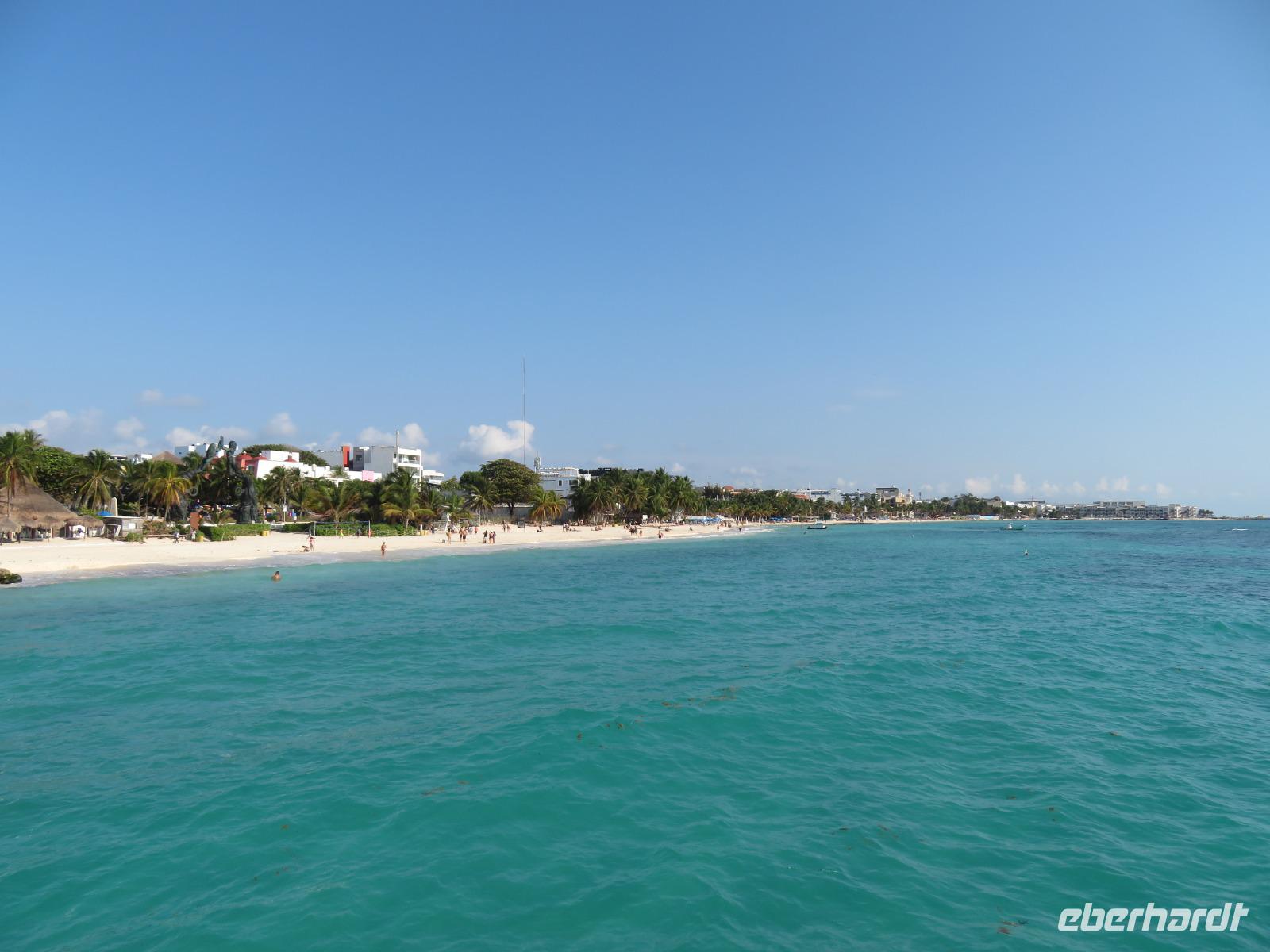 Viva la Mexico. Heute ist der Hafen vollbesetzt. Neben uns stehen noch vier weitere Schiffe und insgesamt können acht Kreuzfahrtschiffe auf der vorgelagerten Insel ankern. Wir wollen aber nicht auf der Insel bleiben und somit führt uns Julio, unser Guide für heute, zur Fähre. Nach 35 Minuten fahrt landen wir am Festland in Mexico wo wir auf unseren Deluxe Bus treffen. So viel Beinfreiheit hatte ich auch noch nie im Bus. Unser erstes Ziel ist die Maya Stadt Tulum. Hier haben die Mexikaner die Kommerzialisierung des Geländes perfektioniert. An jeder Ecke kann man seine Dollar los werden. Julio weiß aber wie der Hase läuft und führt uns zielsicher zum Bus und wenig später durch das Gelände. Die Sonne meint es wieder recht gut mit uns und so hüpfen wir von Schatten zu Schatten und lauschen den Erläuterungen von unserem Guide. Tulum zählte im 13. und 14. Jahrhundert zu den größten Städten auf der Halbinsel Yucatan. Aufgrund ihrer direkten Lage an der Riviera Maya konnte Handel über das Meer betrieben werden. Des Weiteren wurde die Stätte zur Beobachtung des Sternenhimmels benutzt und somit konnte der Maya Kalender hier ständig überprüft werden. Nachdem wir uns satt gesehen hatten, freuten wir uns alle auf das Mittagessen und das Baden im Meer. Im Serenity Camp bekommen wir leckere Frühlingsrollen, Rindersteak und einen tollen Crêpe mit Eis serviert. Wir setzten uns im Anschluss über den alten Spruch, nach dem Essen sollst du ruhen oder 1000 Schritte tun, hinweg und stürzen uns direkt in die warmen Fluten. Ach, das Leben ist doch schön. Dies hat sich vermutlich auch meine Badehose gedacht und deswegen ist sie gleich vor Ort geblieben.