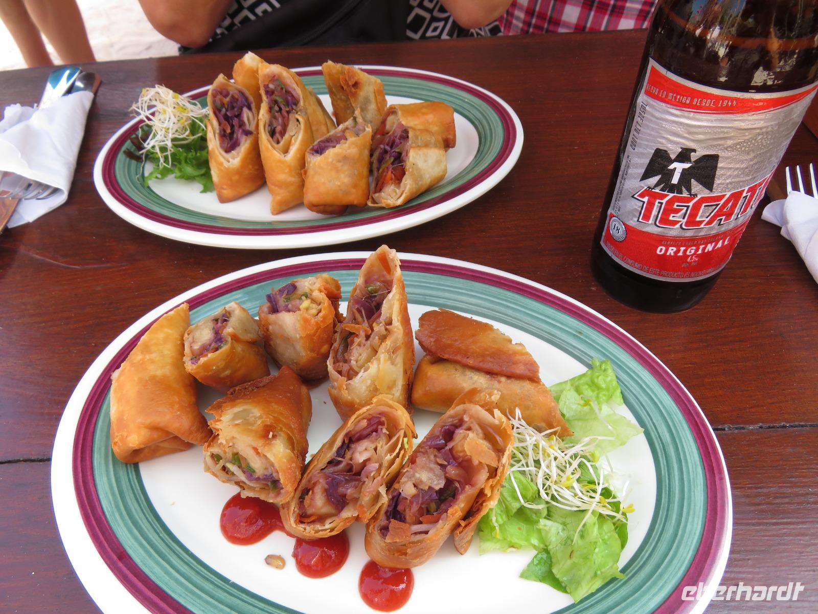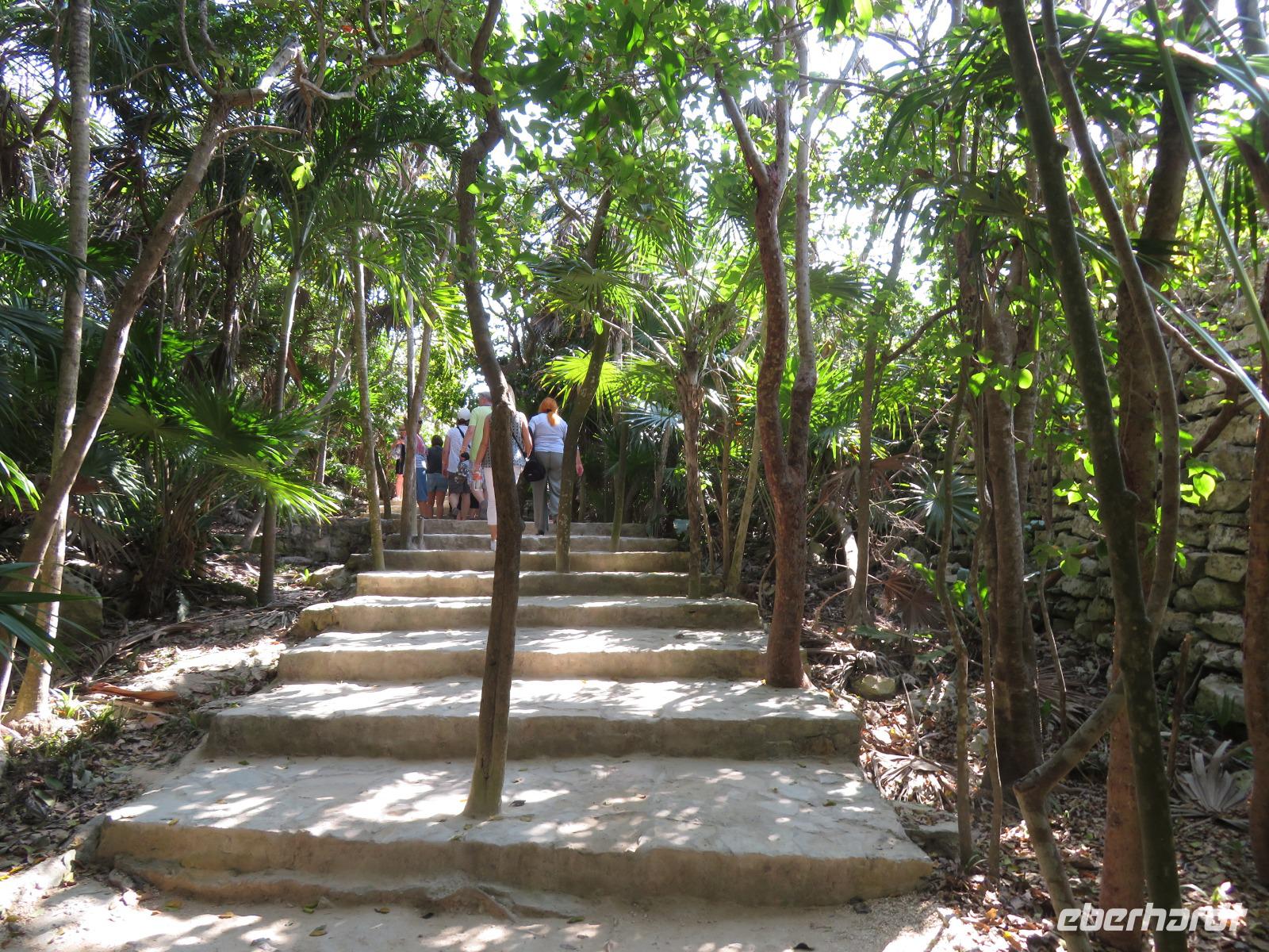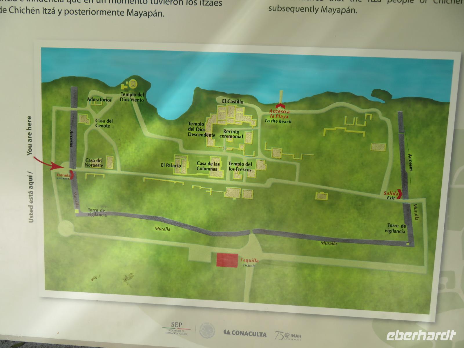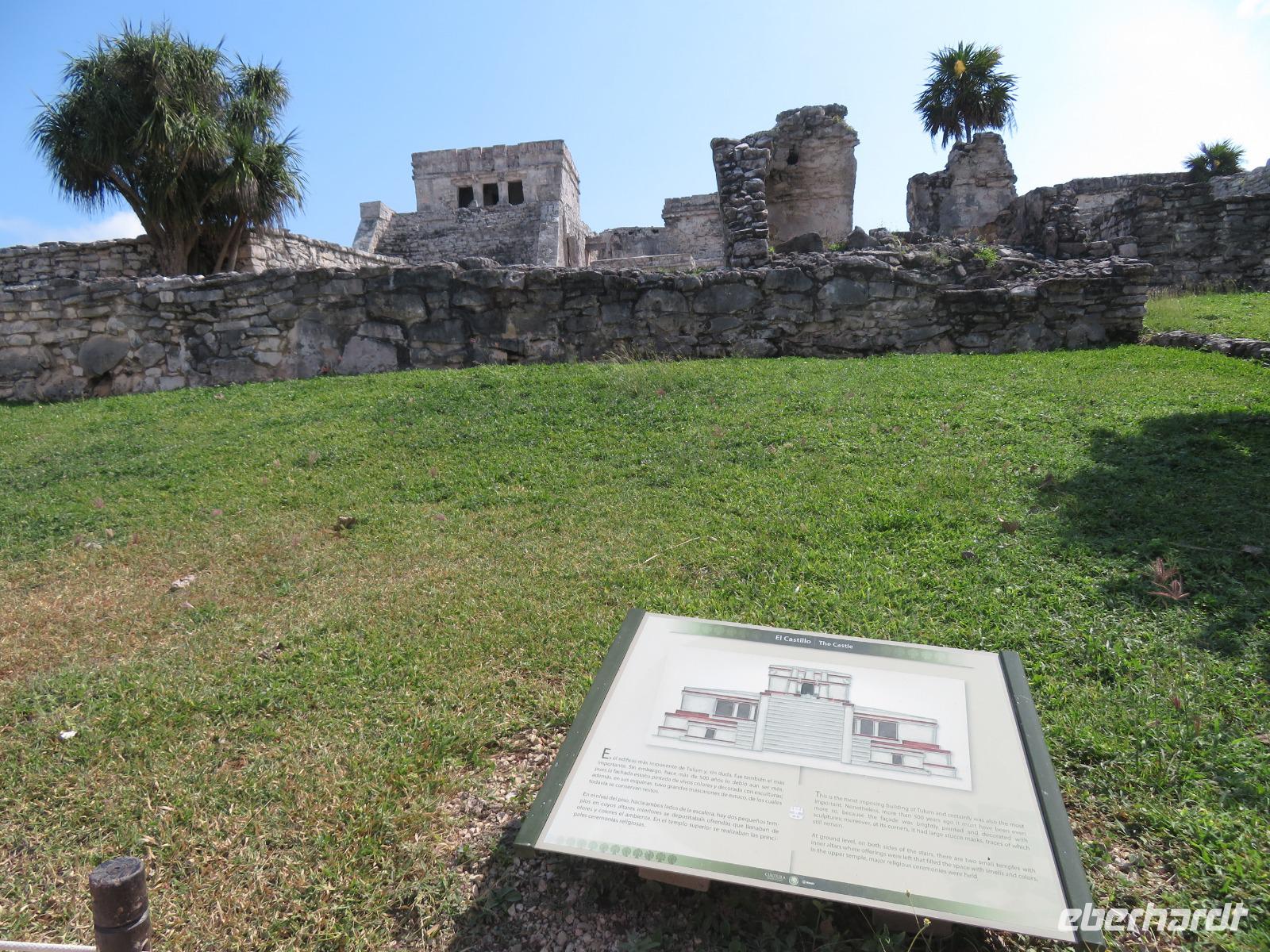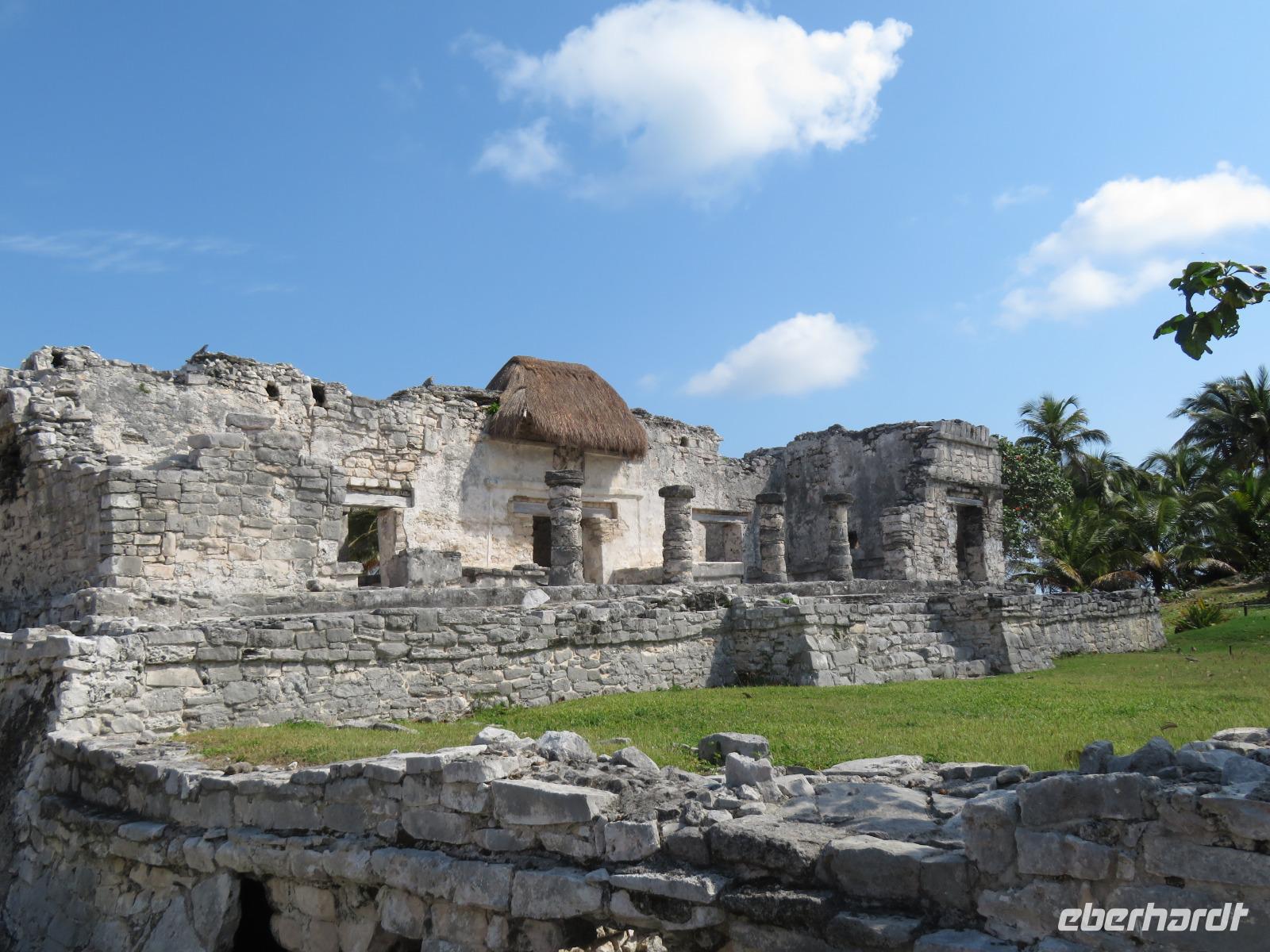 Viva la Mexico. Heute ist der Hafen vollbesetzt. Neben uns stehen noch vier weitere Schiffe und insgesamt können acht Kreuzfahrtschiffe auf der vorgelagerten Insel ankern. Wir wollen aber nicht auf der Insel bleiben und somit führt uns Julio, unser Guide für heute, zur Fähre. Nach 35 Minuten fahrt landen wir am Festland in Mexico wo wir auf unseren Deluxe Bus treffen. So viel Beinfreiheit hatte ich auch noch nie im Bus. Unser erstes Ziel ist die Maya Stadt Tulum. Hier haben die Mexikaner die Kommerzialisierung des Geländes perfektioniert. An jeder Ecke kann man seine Dollar los werden. Julio weiß aber wie der Hase läuft und führt uns zielsicher zum Bus und wenig später durch das Gelände. Die Sonne meint es wieder recht gut mit uns und so hüpfen wir von Schatten zu Schatten und lauschen den Erläuterungen von unserem Guide. Tulum zählte im 13. und 14. Jahrhundert zu den größten Städten auf der Halbinsel Yucatan. Aufgrund ihrer direkten Lage an der Riviera Maya konnte Handel über das Meer betrieben werden. Des Weiteren wurde die Stätte zur Beobachtung des Sternenhimmels benutzt und somit konnte der Maya Kalender hier ständig überprüft werden. Nachdem wir uns satt gesehen hatten, freuten wir uns alle auf das Mittagessen und das Baden im Meer. Im Serenity Camp bekommen wir leckere Frühlingsrollen, Rindersteak und einen tollen Crêpe mit Eis serviert. Wir setzten uns im Anschluss über den alten Spruch, nach dem Essen sollst du ruhen oder 1000 Schritte tun, hinweg und stürzen uns direkt in die warmen Fluten. Ach, das Leben ist doch schön. Dies hat sich vermutlich auch meine Badehose gedacht und deswegen ist sie gleich vor Ort geblieben.