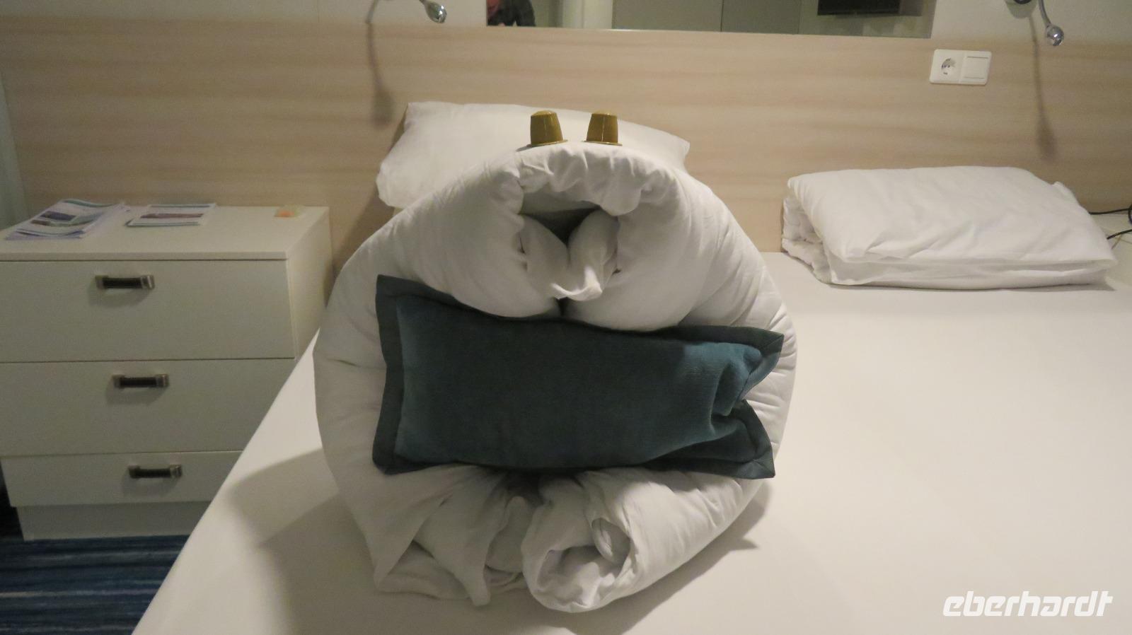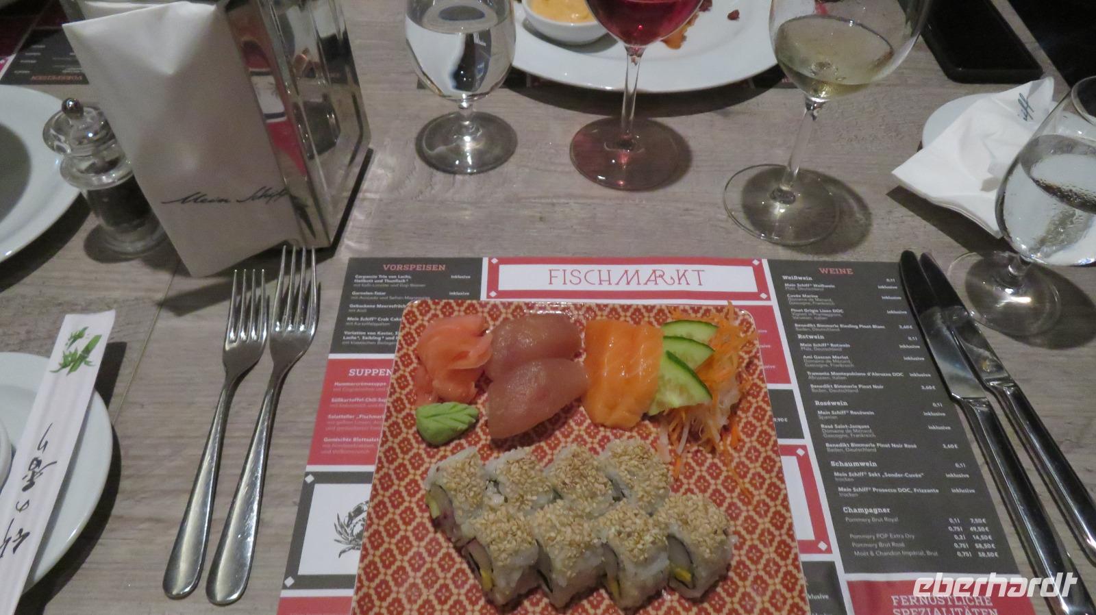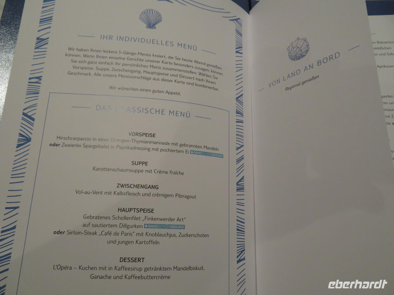 Zum Abendessen trifft sich ein großer Teil der Gruppe nochmal im Atlantik Restaurant. Da wir recht zeitig gegangen sind, haben wir zwei Kellner nur für uns und das Essen kommt in perfekten Abständen. Geschmacklich ist es wie immer sehr gut und so gehen wir satt und zufrieden ins leicht schaukelnde Bett.