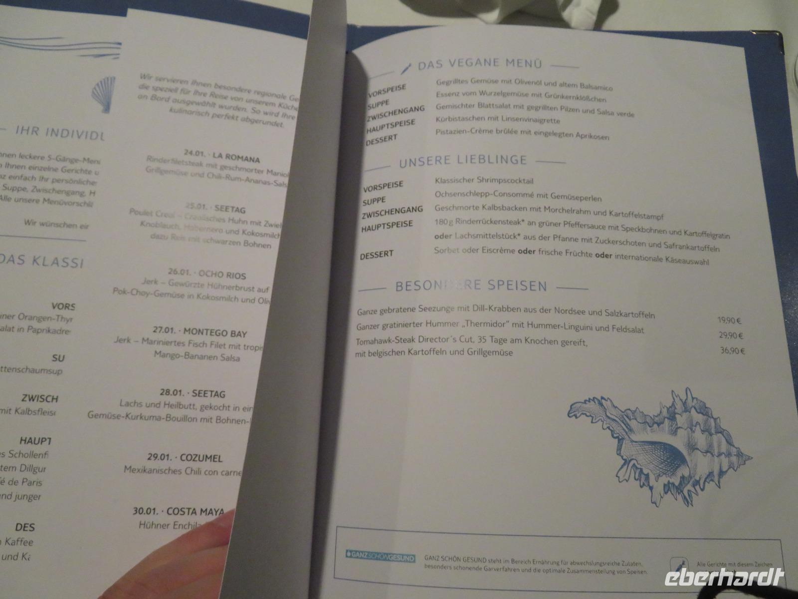 Da es sich gerade um das Thema Essen dreht, darf dieses Thema nicht zu kurz kommen. Generell ist das Essen bei einer Kreuzfahrt immer sehr gut. Auf der Mein Schiff 1 ist es nicht nur sehr gut, es ist überragend. Egal ob in den Buffet Restaurants oder den Menü Restaurants. Hier ist für jeden was dabei. Für alle die, die den Blog lesen und nicht mit mir unterwegs waren, hier eine Darstellung meines Abendessens.