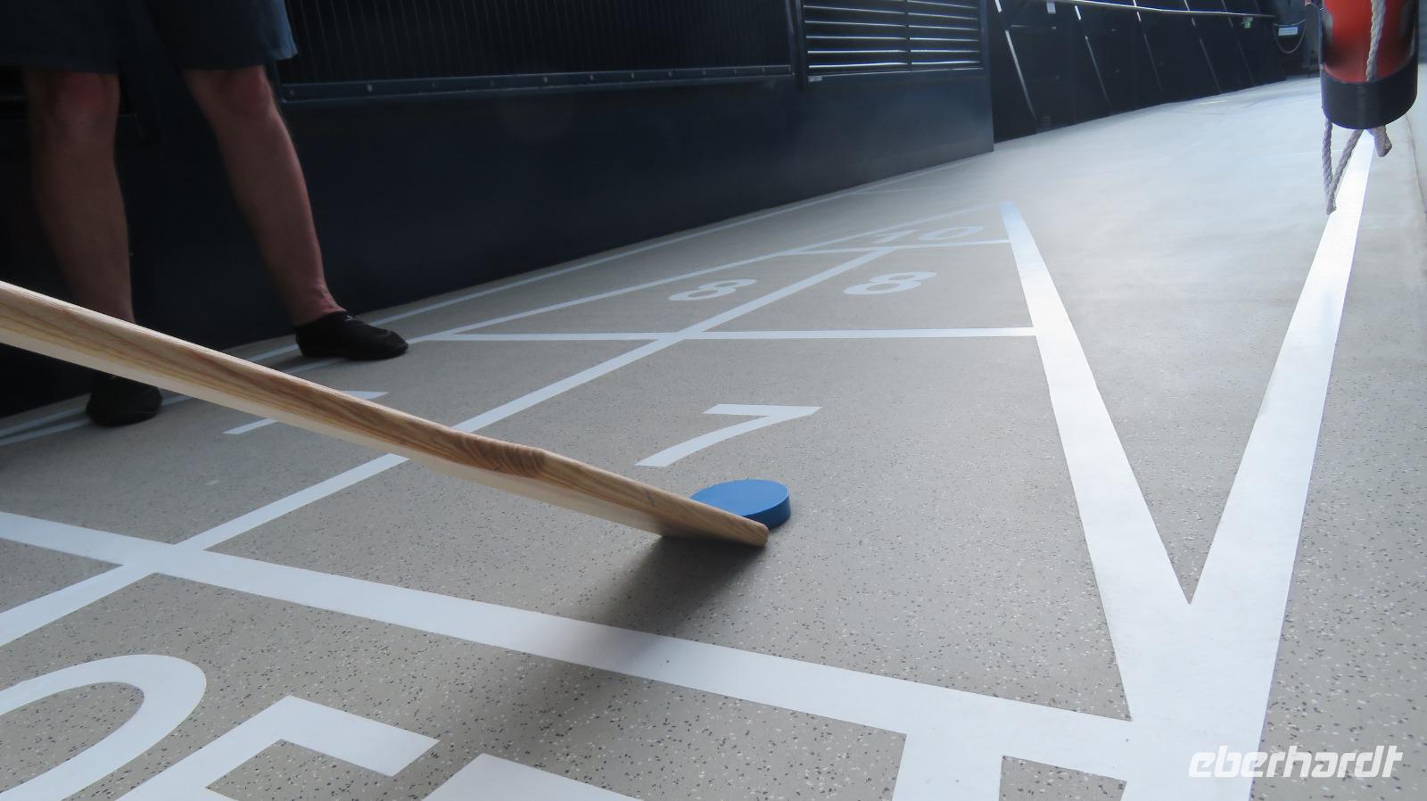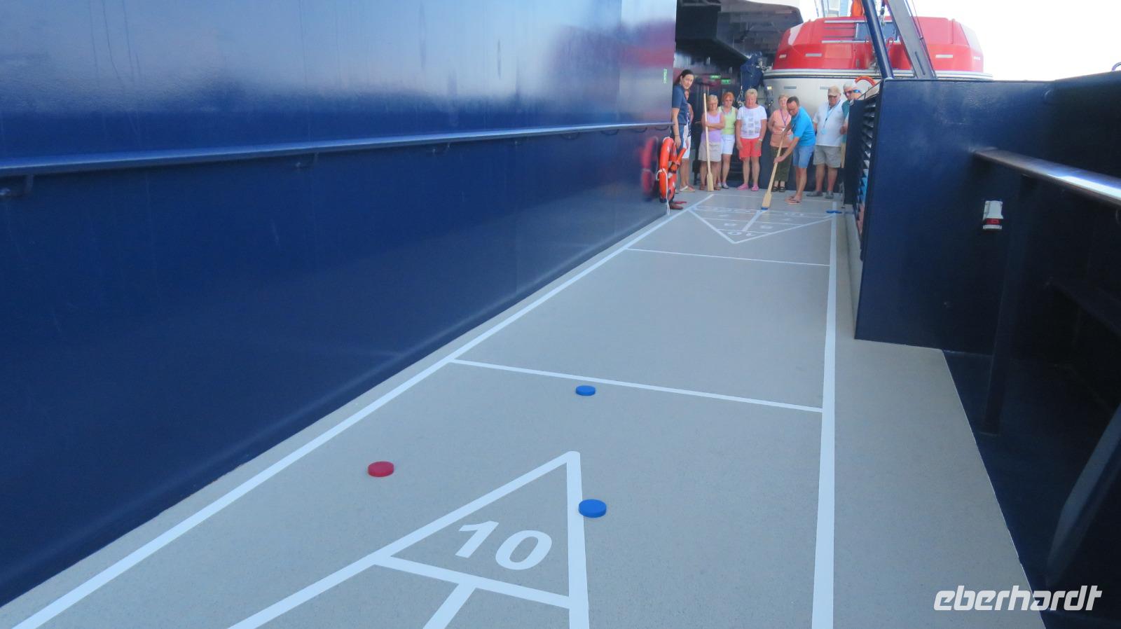 Heute ist der Tag der Tage. Nach einem individuellen Frühstück treffen zwei großartige Mannschaften aufeinander. Team Rot auf Team Blau. Besser bekannt als Mann gegen Frau. Nach einer kurzen Erläuterung der Spielregeln fliegen auch schon die ersten Scheiben über das Deck. Da wir eine exklusive Runde gebucht haben, sind wir auch unter uns und das ist einfach schön. Nach anfänglichem schwachen Start (sind vermutlich die Nerven), sausen die Scheiben fast schon wie von alleine. Das Resultat bleibt geheim, aber es gibt am letzten Seetag nochmal die Chance auf einen erneuten Sieg.