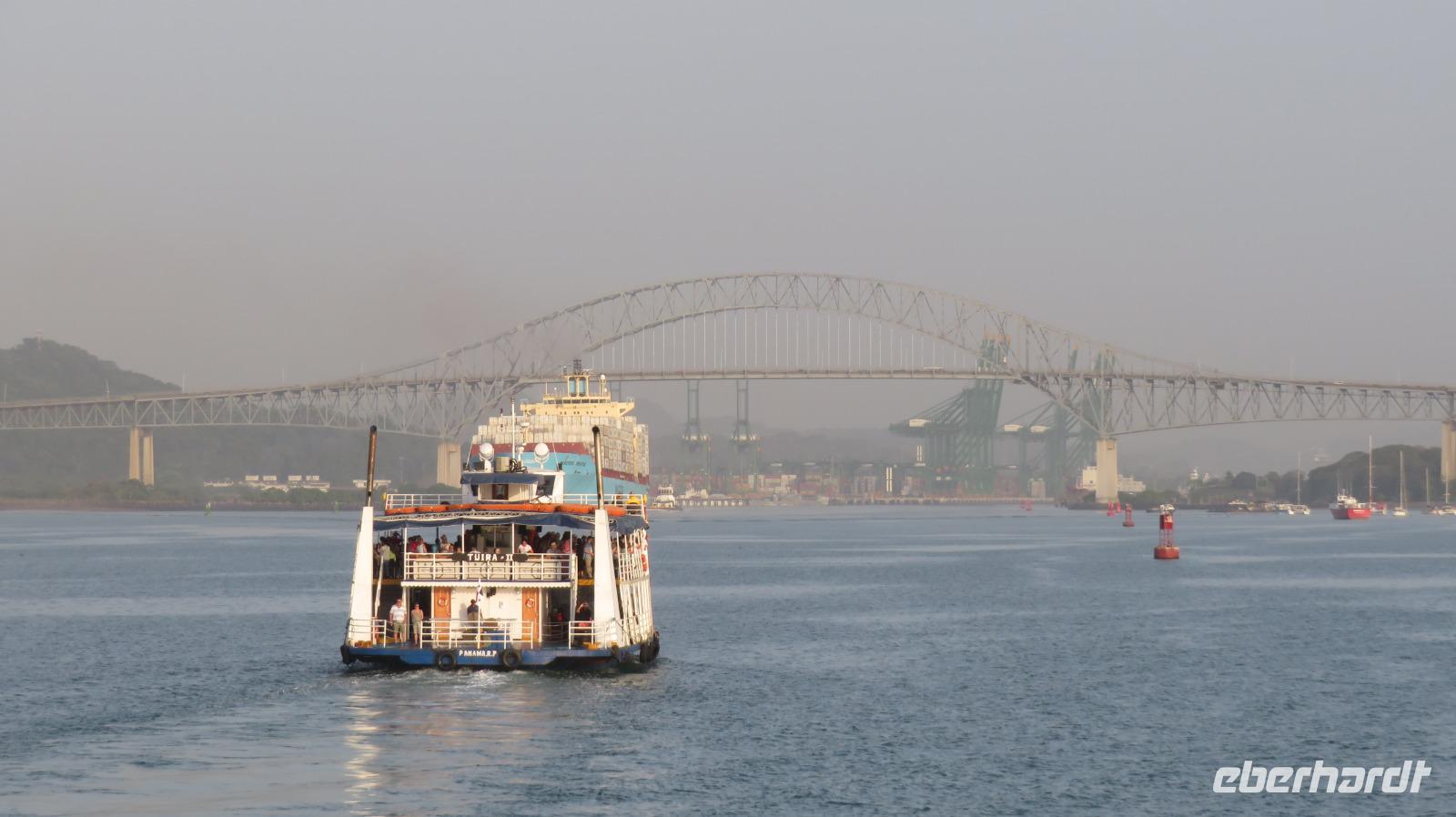 Bevor die Sonne sich heute entscheidet uns zu begrüßen, sitzen wir schon im Bus Richtung Panama Stadt. Ich weiß nicht woher unser Reiseleiter seine Motivation bezieht, aber er brüllt schon früh am Morgen eigenartiges in sein Mikro. Aber egal, heute geht es durch den Panama Kanal. Um zum Startpunkt zu kommen, nutzen wir den Bus von Colon nach Panama Stadt. Es liegen gerade einmal 80 km zwischen den beiden Städten und somit auch zwischen Pazifik und Atlantik. Die Fahrt dauert knapp 90 Minuten und beim Sonnenaufgang sind wir an unserem Ziel angekommen. Hier stehen zwei Schiffe für uns bereit und die Fahrt kann somit beginnen. Als Reiseleiterin haben wir eine ganz süße ältere Frau an Bord, die mit viel Liebe uns allerhand Geschichten über ihre neue Heimat und den Kanal erzählt. Die Geschichte hinter diesem Kanal ist einzigartig. Die erste Idee einer Verbindung kam bereits im 16. Jahrhundert auf. Danach dauerte es allerdings noch bis zum Jahr 1881, ehe die ersten Arbeiten begannen. In den folgenden Jahren wurde fleißig gebaut. Allerdings wurde die Arbeiten 7 Jahre später wiedereingestellt, da der Gesellschaft das nötige Kleingeld ausging. Im Anschluss kauften die Vereinigten Staaten das Gebiet, besetzten es und bauen den Kanal bis zur Eröffnung 1914 aus. Aufgrund des 1. Weltkriegs wurde die offizielle Eröffnung erst im Jahr 1920 nachgeholt.