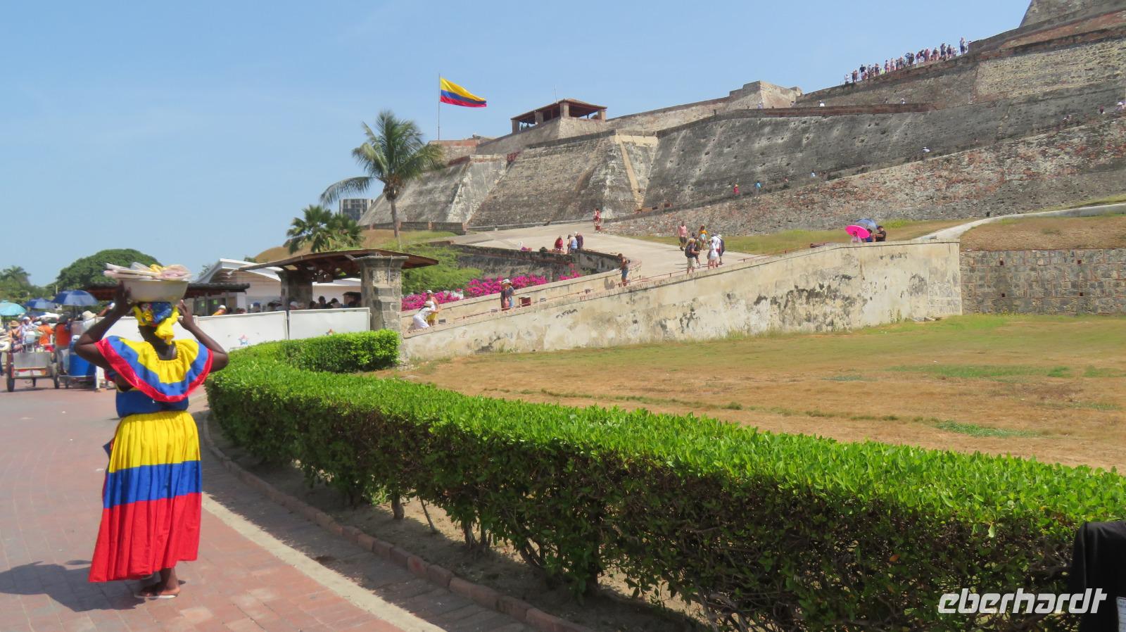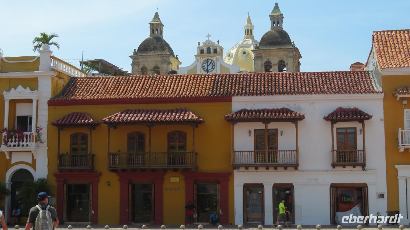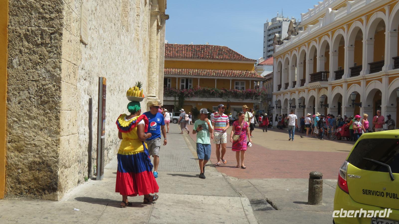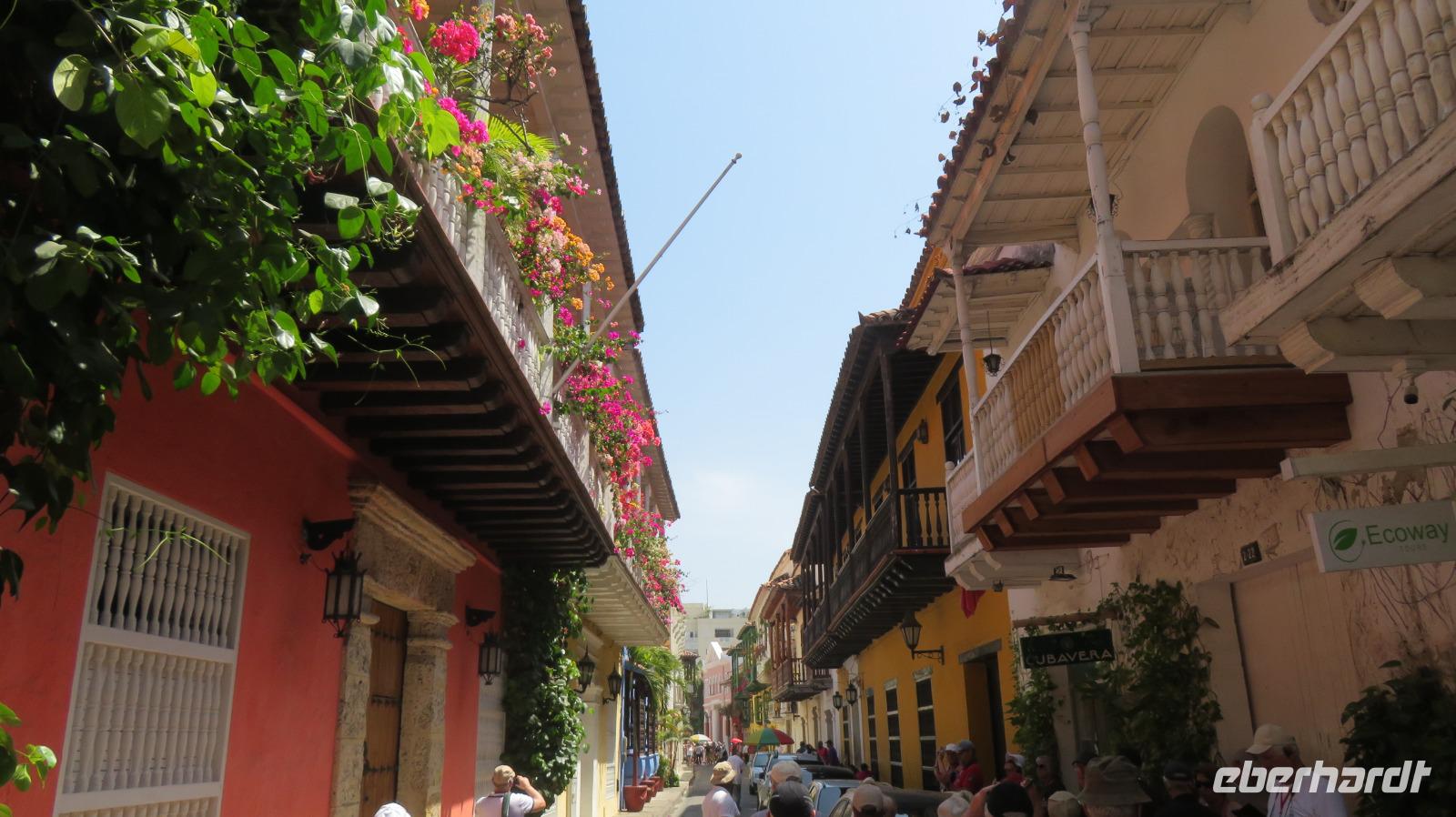 Das letzte neue Land auf unserer Kreuzfahrt ist Kolumbien mit der Hafenstadt Cartagena. Ein Teil der Gruppe unternimmt heute mit mir den Stadtrundgang durch Cartagena. Als erstes fahren wir mit dem Bus zum San Felipe Kastell. Das Meisterwerk spanischer Baukunst ist eine imposante Festung aus dem 16. Jahrhundert. Nicht weniger imposant sind die fliegenden Händler, die von allen Seiten uns etwas verkaufen wollen. Bevor wir am Parque de la Marina den Bus verlassen und zu einem rund 1,5 stündigen Spaziergang aufbrechen, bekommen wir die Möglichkeit ein Andenken in den hiesigen Shops zu erwerben. Die Altstadt von Cartagena gehört seit 1984 zum UNESCO Weltkulturerbe und gehört zu den schönsten Kolonialstädten Südamerikas. Dies empfinden wir ebenso. In der Altstadt kommt uns ein alter Oldtimer entgegen, die Türen und die Balkone sind groß und hölzern und an jeder Ecke herrscht ein buntes Treiben. Wir laufen an der Santo Domingo Kirche, der Kathedrale und dem Uhrenturm vorbei, staunen über die Künste eines Malers und lauschen einer künstlerischen Darbietung.