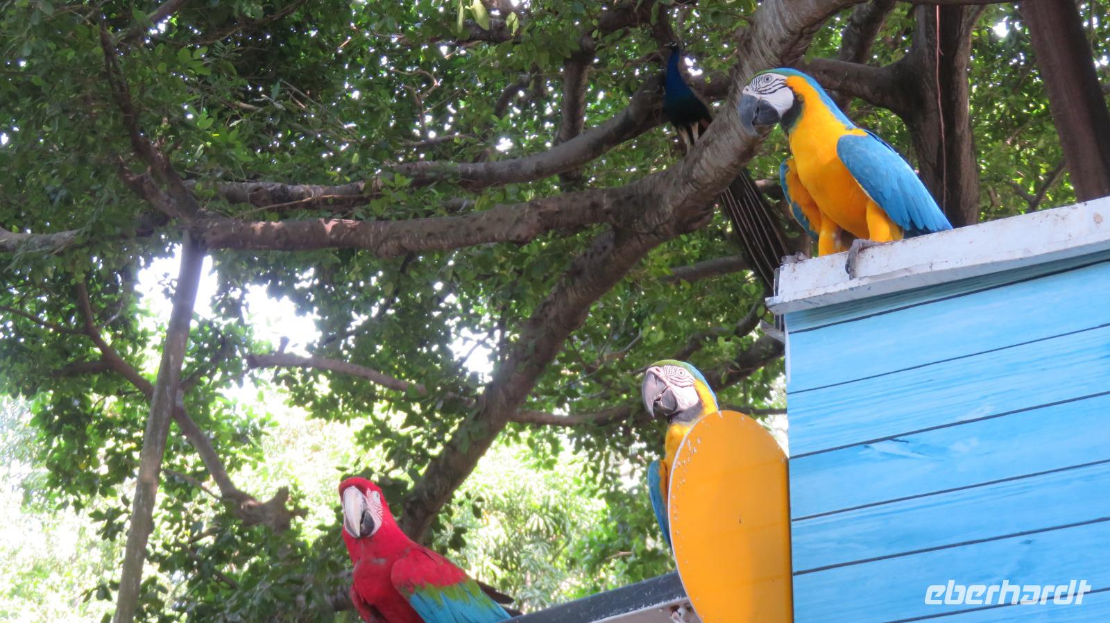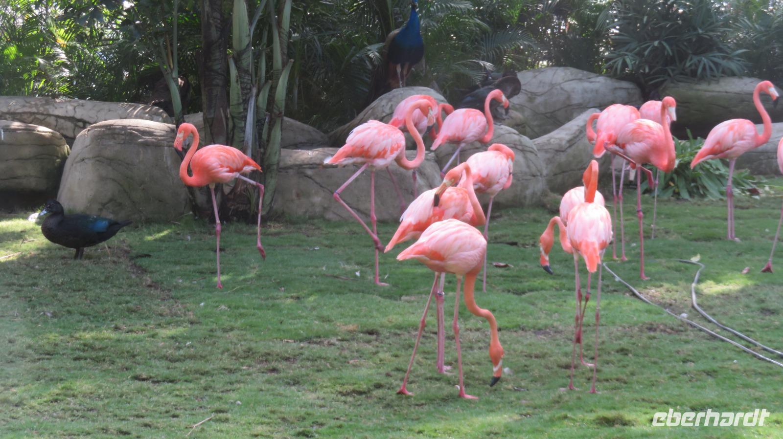 Buenos Dias sagen die Einheimischen und wir passen uns natürlich an. In der Nacht hat es ordentlich geregnet, aber jetzt scheint die Sonne und so schlendern wir über die weitläufige Anlage zum Frühstück. Kurz vor dem Restaurant traue ich meinen Augen nicht. Hier stehen tatsächlich Flamingos. So wie es aussieht, leiten sie den Tag ebenso mit einem Frühstück ein.