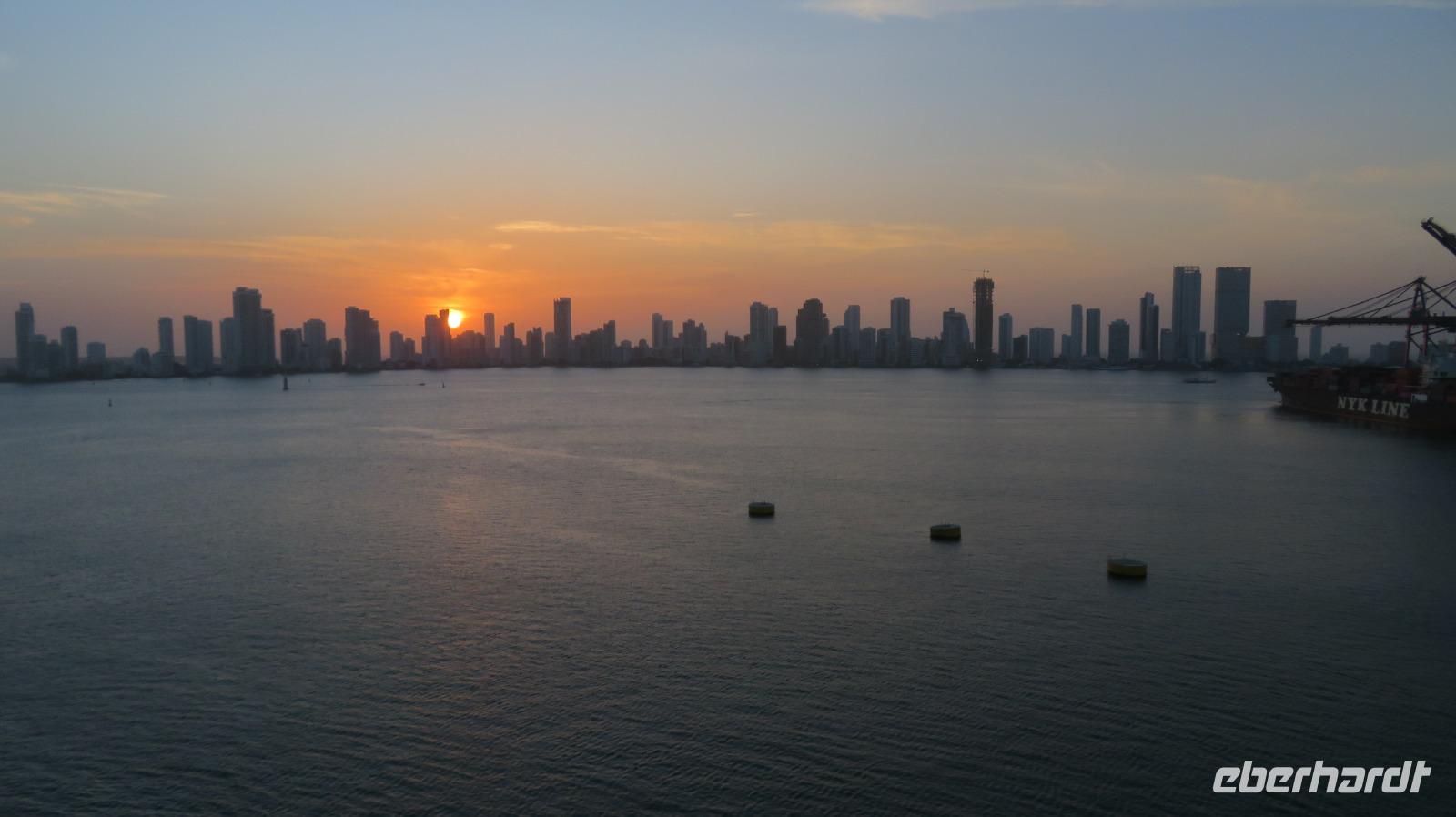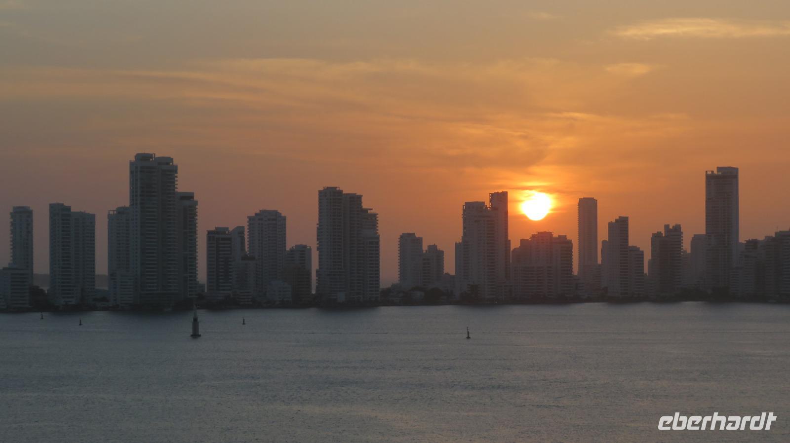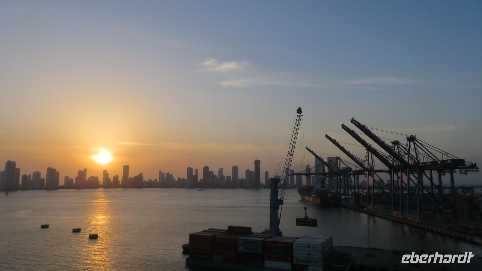 Auch das Hafengelände ist hübsch gestaltet. Neben einem kleinen Zoo sind hier auch viele freilebende Tiere zu beobachten. Die bekommen vermutlich ein so gutes Futter, dass sie gar nicht mehr woanders hin möchten. Zum Abschied aus Cartagena geht hinter den Hochhäusern die Sonne unter und wenn man dazu einen Cocktail in der Hand hält, will man gerade nirgends woanders sein.