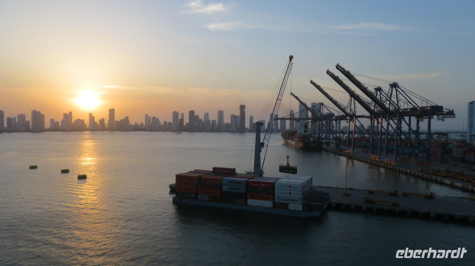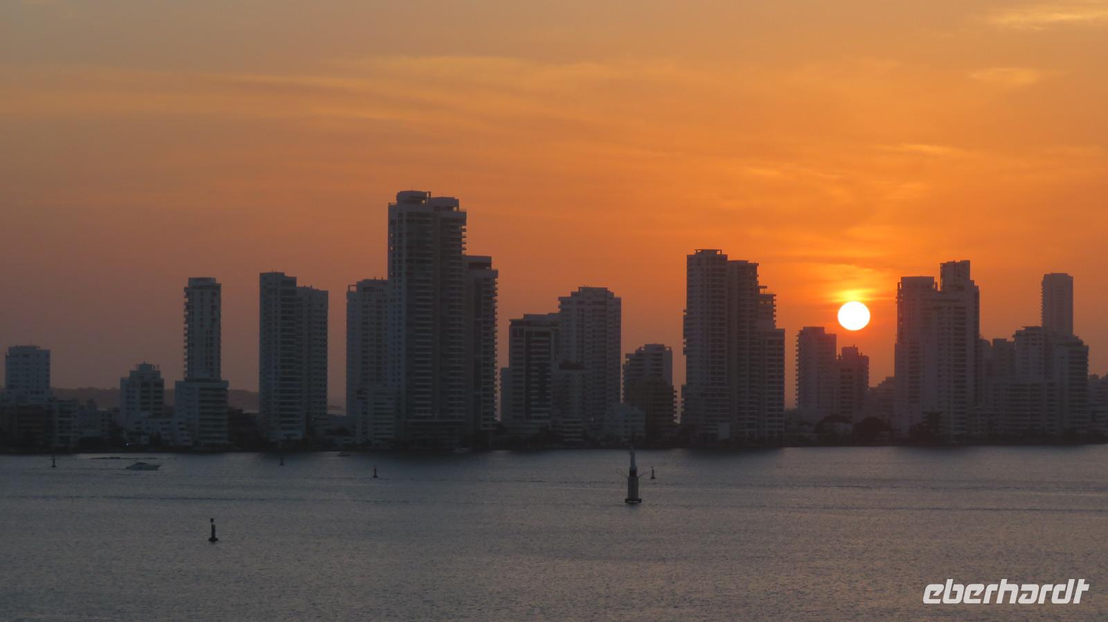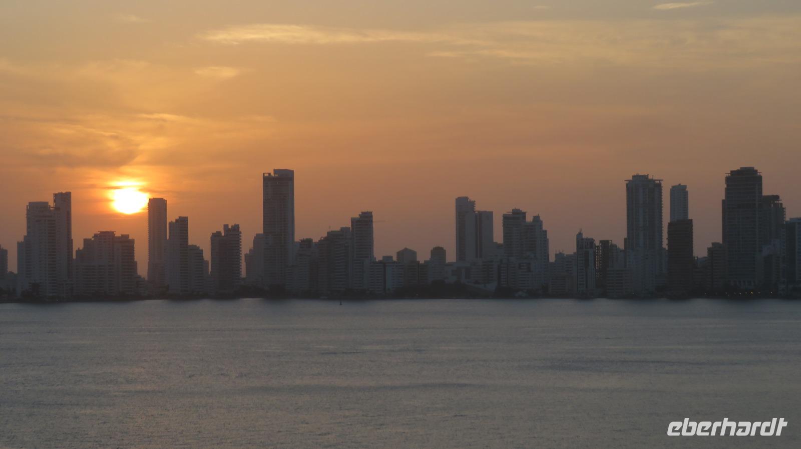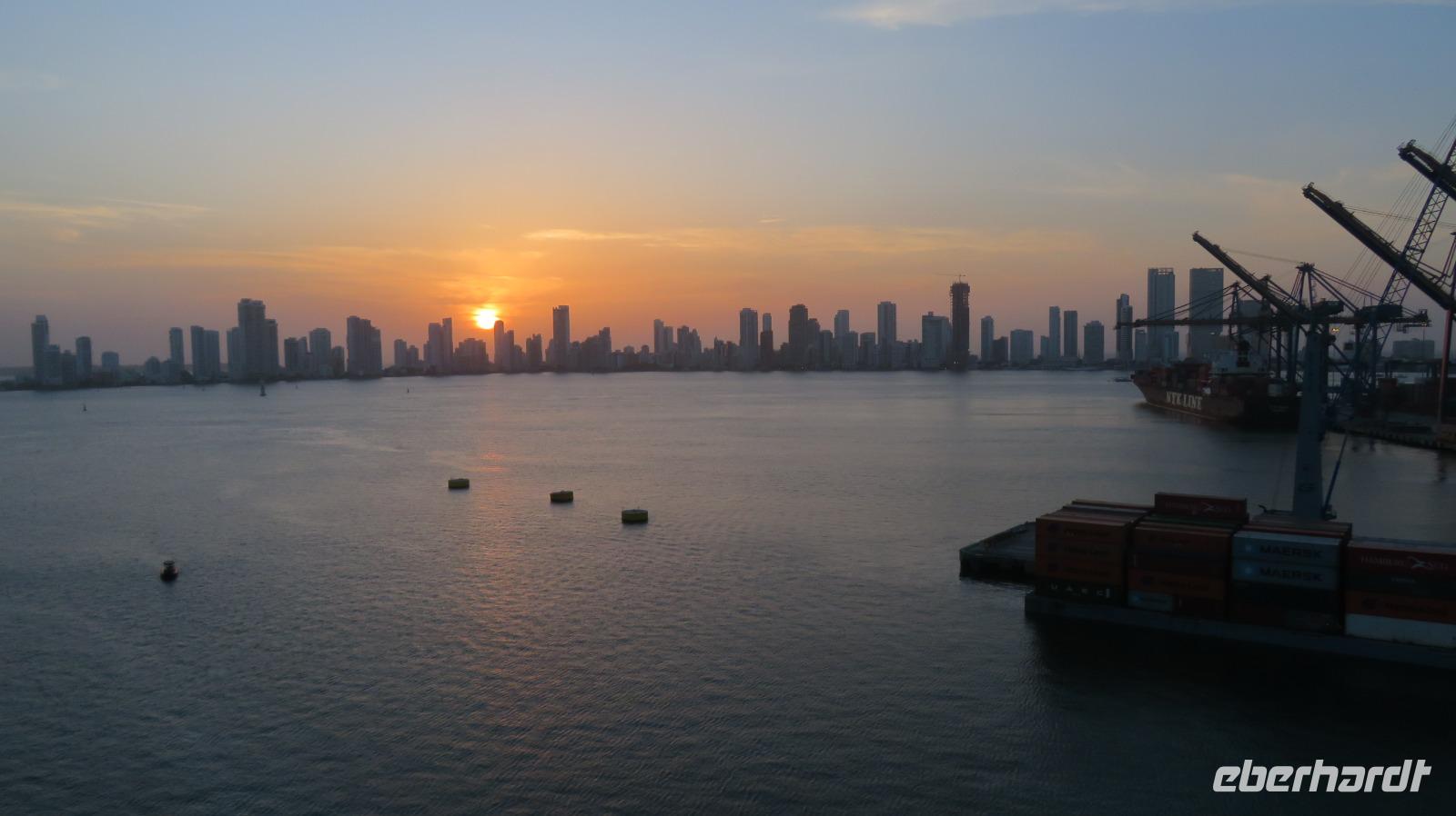 Auch das Hafengelände ist hübsch gestaltet. Neben einem kleinen Zoo sind hier auch viele freilebende Tiere zu beobachten. Die bekommen vermutlich ein so gutes Futter, dass sie gar nicht mehr woanders hin möchten. Zum Abschied aus Cartagena geht hinter den Hochhäusern die Sonne unter und wenn man dazu einen Cocktail in der Hand hält, will man gerade nirgends woanders sein.