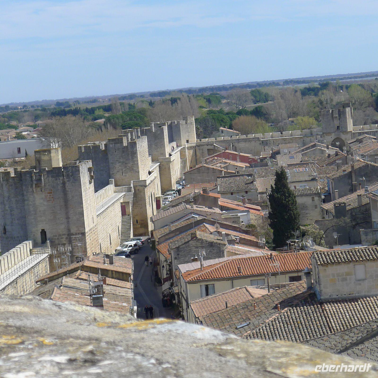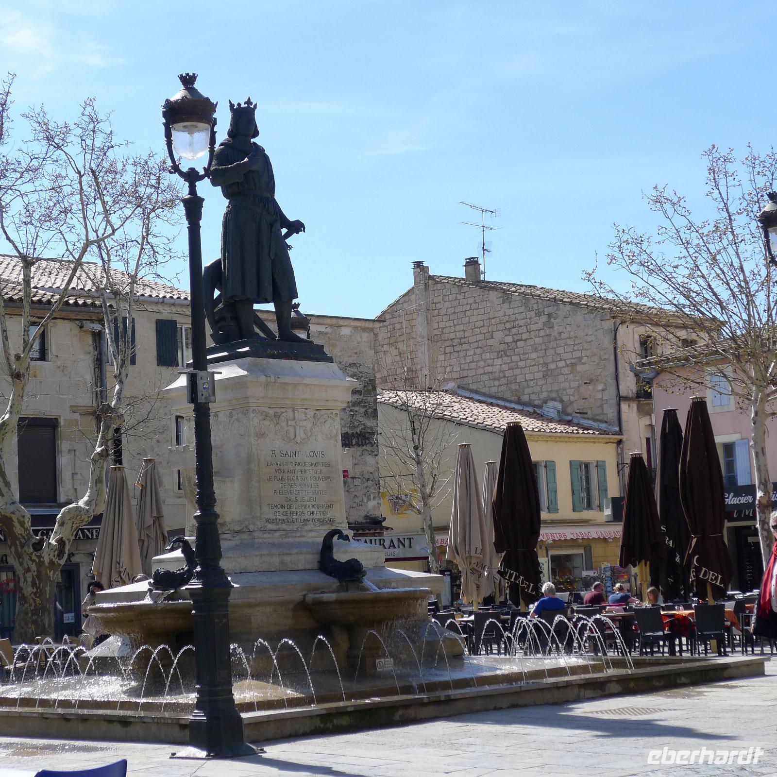 Wir durften sodann die große Herde der schwarzen Rinder und natürlich auch die weißen Pferde in Aktion erleben, nämlich bei einer ‚Triage'. So nennt man das Aussondern einiger Stiere aus der Herde für einen Kampf, vorgenommen durch die Reiter. Ein beeindruckendes Schauspiel! Nach einem Aperitif, gefolgt von einem Mittagessen mit lokalen Spezialitäten, hieß es ‚au revoir' sagen. Am Nachmittag besuchten wir Aigues Mortes, das ganz von einer Stadtmauer umschlossene Städtchen am Rande der Camargue. Die Zeit reichte für einen Spaziergang auf der alten Mauer mit Blick über die weiten weißen Salzgärten, aber auch für einen kleinen Einkaufsbummel. Manch einer der Reisegäste nahm auf der Place Saint Louis mitten im Zentrum Platz. Sie wird geschmückt von einer Statue Ludwigs, des IX., des Heiligen. Er hat Land erworben zur Gründung eines eigenen Mittelmeerhafens zur Einschiffung der Kreuzfahrer des siebten und achten Kreuzzuges. Von Platanen gesäumt ist der Platz das ‚Wohnzimmer' des Städtchens und in der verlockenden Sonne schmeckten Cafè au lait und das erste Eis der Saison besonders gut.