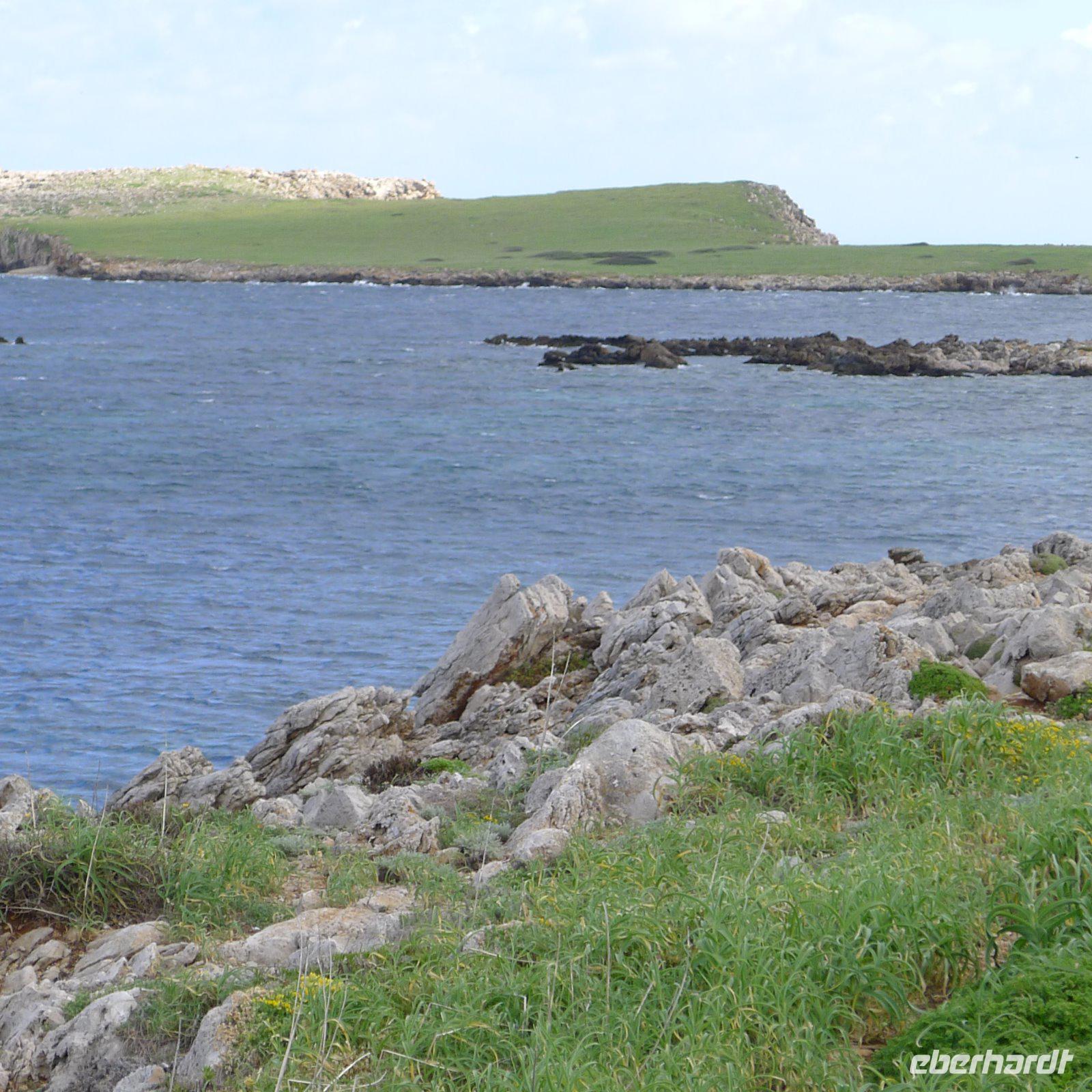 Quer durch die Insel führt uns die Straße ganz an die Westküste. Dort liegt die alte Hauptstadt Ciutadella. Die Straße führt zuerst durch eine weite Hochebene, dann durch das grüne Hügelland der Inselmitte und schließlich durch die von Trockenmauern gesäumten Felder und Wiesen des Inselwestens. Hier befinden sich auch viele Megalitdenkmale und -Gräber der frühen Bewohner Menorcas, die ja durch ihre Kunst des Steinschleuderns den Inseln ihren heutigen Namen gaben.
