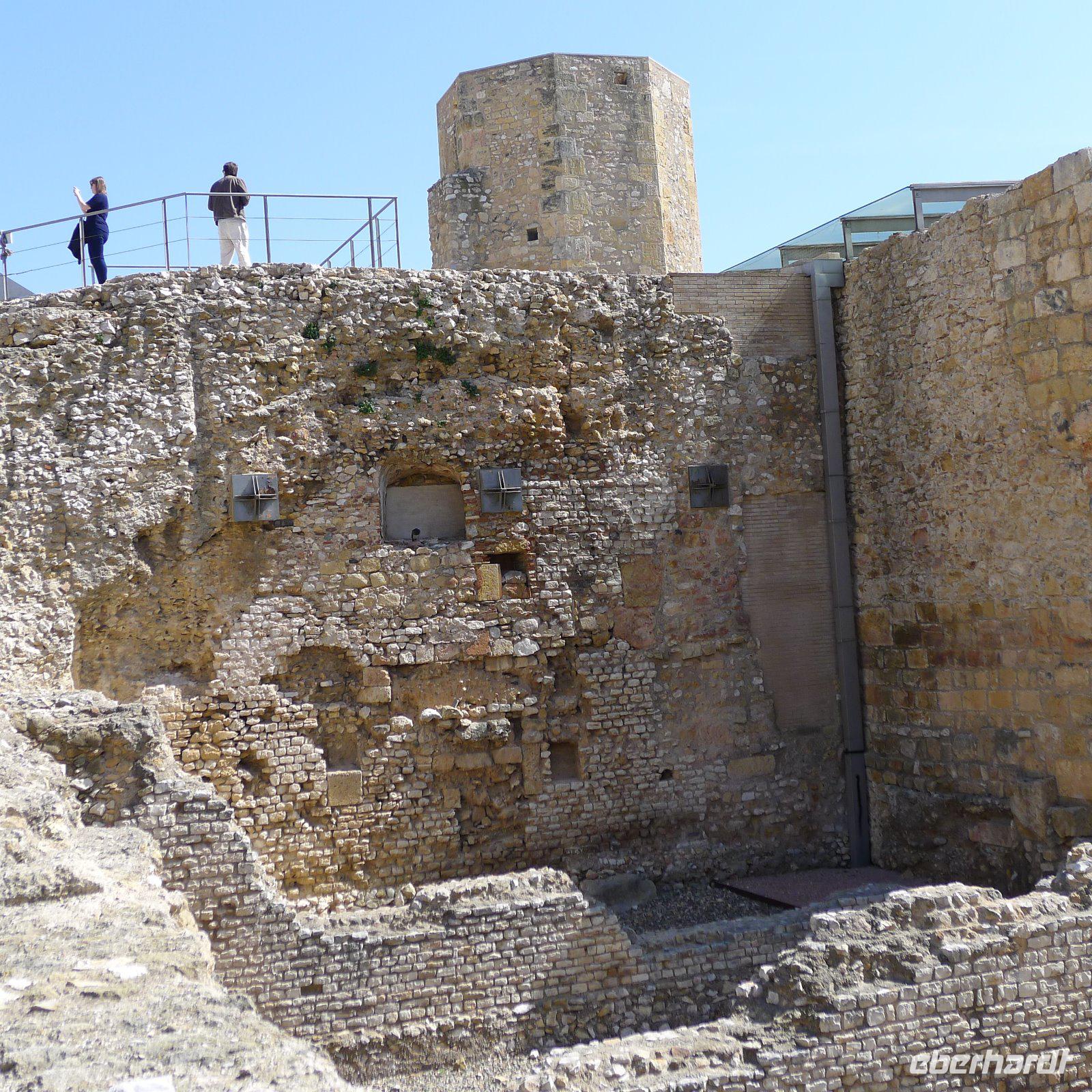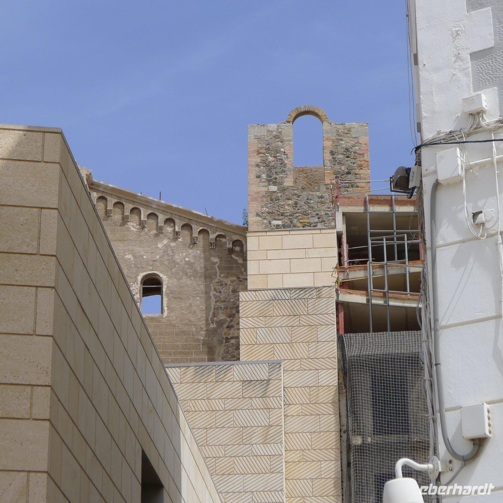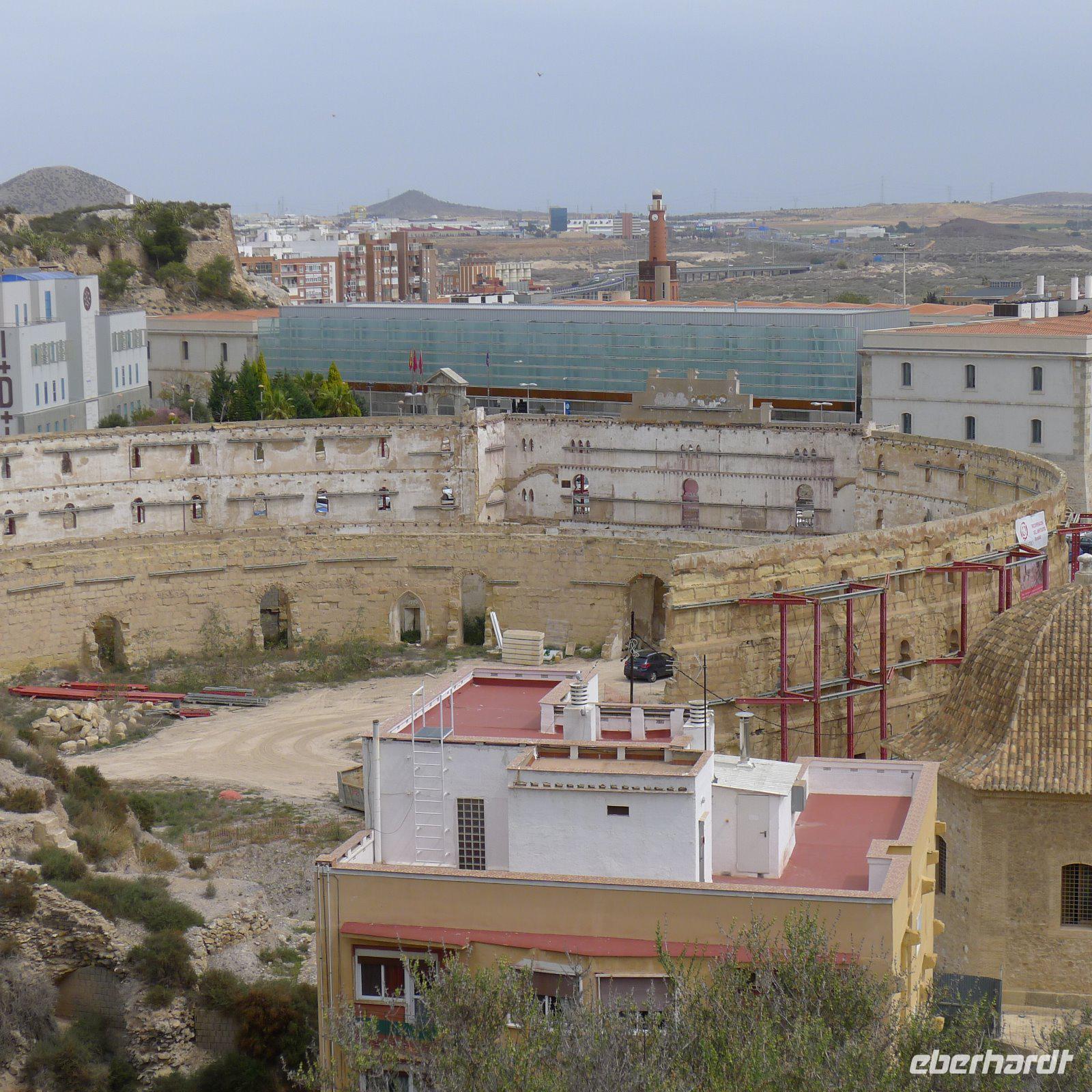 Um die Mittagszeit begaben wir uns in die Obhut Juans. Cartagena war in das gleißende Licht der Mittagssonne gehüllt und schien uns mitten in eine karge und trockene Landschaft hinein gebaut. Auf den 1. Blick erahnte man nicht, welche geschichtliche Bedeutung diese Stadt hat. Aber Juan unternahm mit uns einen Ausflug in die Geschichte und klärte uns auf. Vom Castillo de la Concepción aus konnten wir nicht nur die Stadt überblicken. Wir konnten die denkmalgeschützte Stierkampfarena, die auf den Resten des römischen Colloseums steht und auch die Reste eines alten römischen Amphitheaters bestaunen, das völlig von modernen Wohnblöcken umschlossen ist. Von hier oben hatten wir auch einen phantastischen Blick über den Hafen. Unsere MS Berlin sah neben einem der ganz großen Kreuzfahrtschiffe wie ein Spielzeug-Schiffchen aus! In den Gassen der Stadt entdeckt man zahlreiche schöne Jugendstilfassaden.