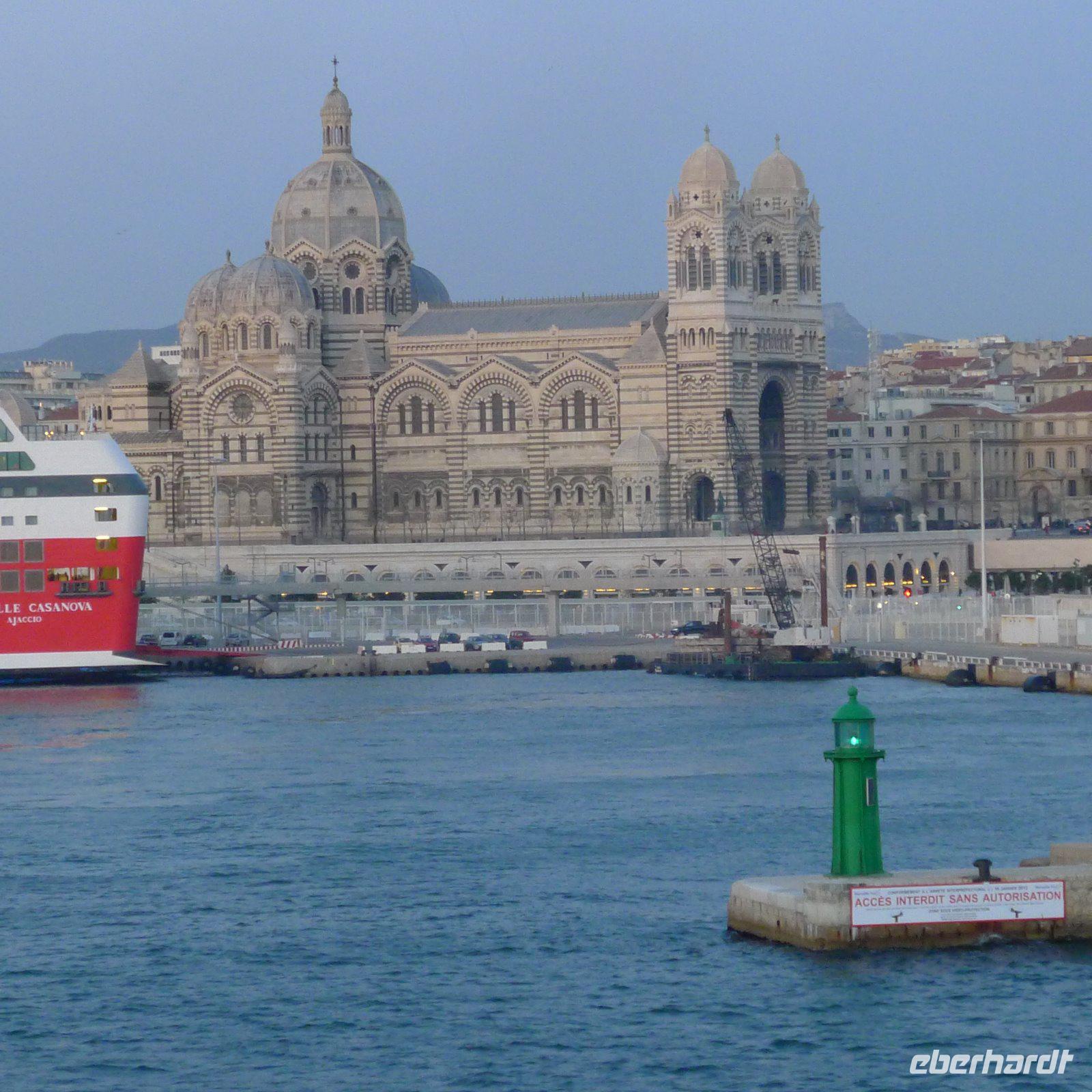 Unsere MS Berlin fuhr genau auf die Kathedrale von Marseille zu. Das ab 1852 erbaute monumentale neoromanisch-byzantinische Gotteshaus steht am Westrand der Altstadt und genau davor hat unser Schiff angelegt. Konnte man einen besseren Anlegeplatz haben? Definitiv nein! Die Cathédrale Sainte-Marie-Majeure de Marseille wird meist Cathédrale de la Major genannt. Sie ist die Bischofskirche der römisch-katholischen Erzdiözese Marseille und wir hatten sie den ganzen Tag über im Blick, mal im Licht der Morgensonne, mal in der grellen Mittagssonne und schließlich beim Auslaufen im Licht der untergehenden Sonne! Welch ein Schauspiel!
