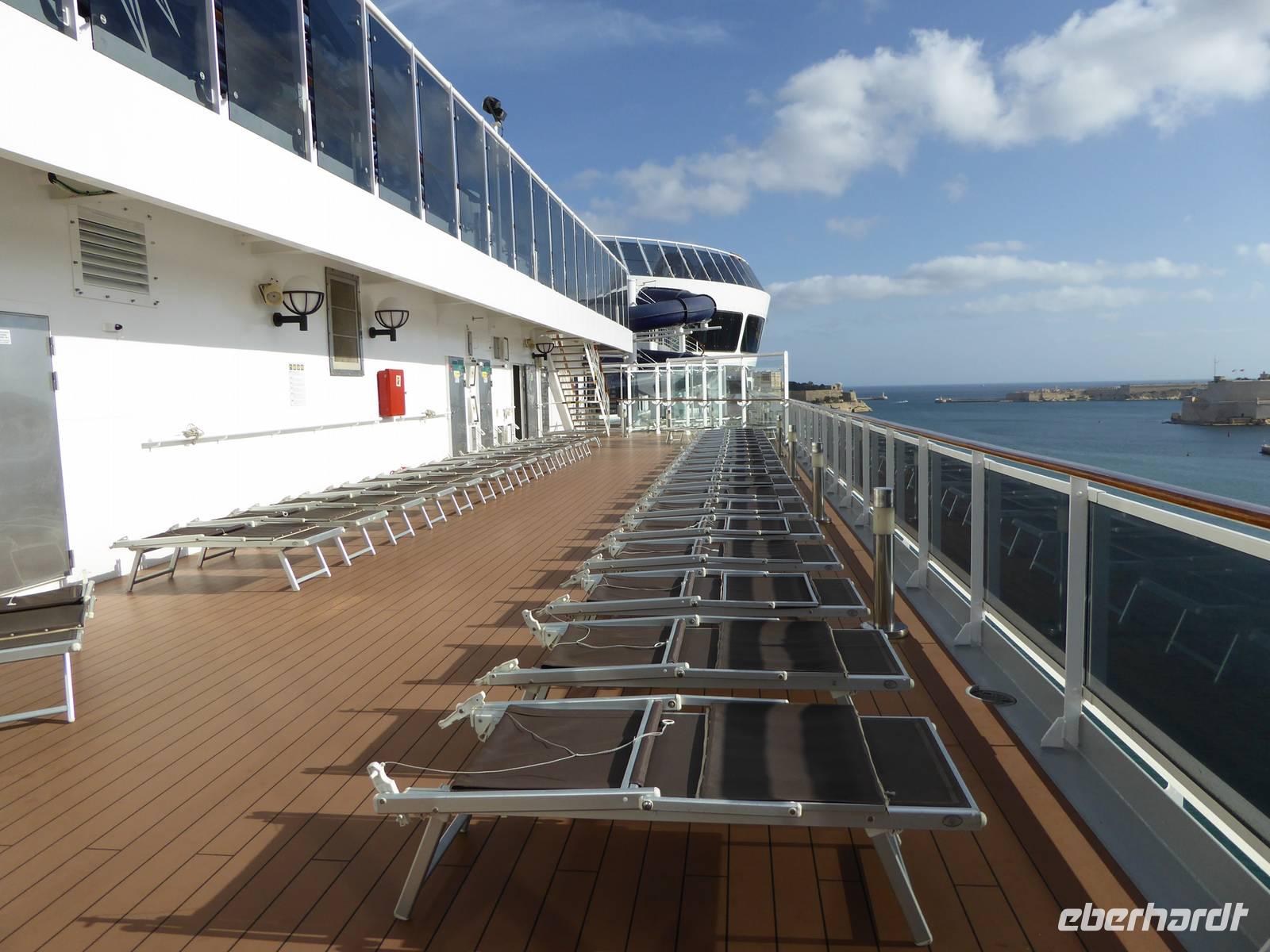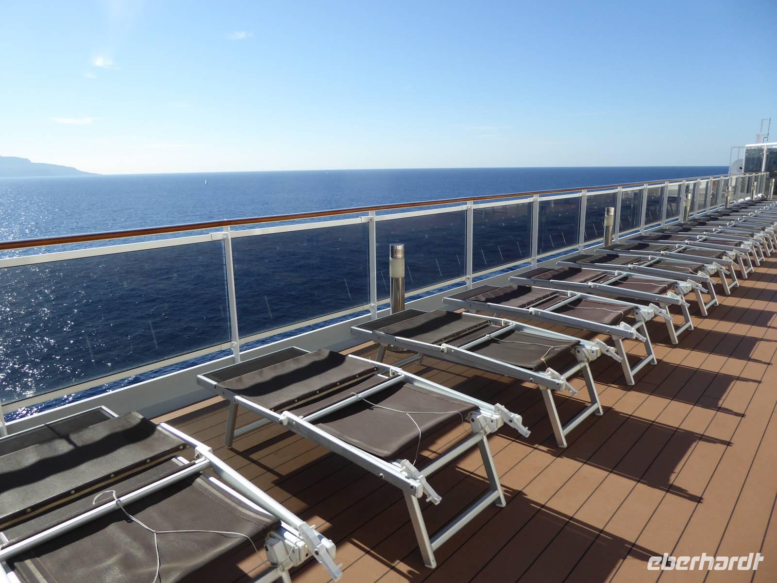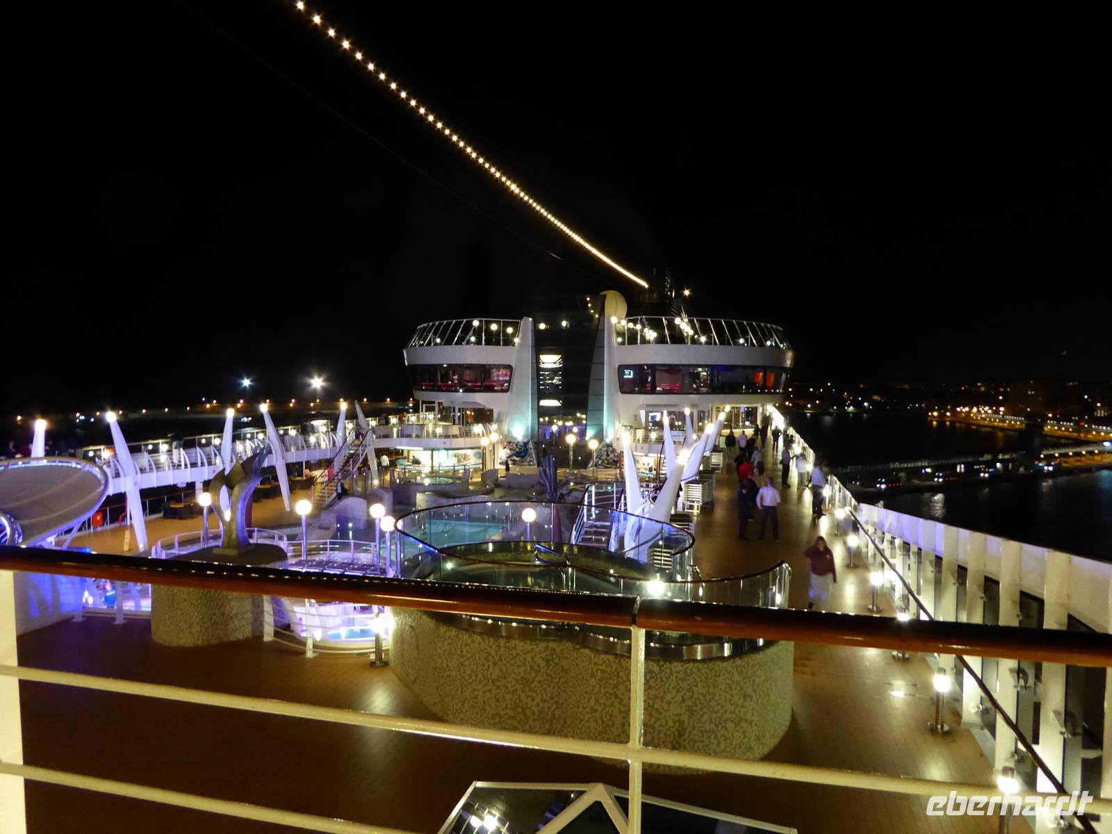 Alternativ dazu kann man auch den Tag an Bord verbringen und alle Annehmlichkeiten noch einmal genießen. Wer möchte, kann bereits um 9.15 Uhr mit den Animateuren einen Morgenspaziergang an Deck unternehmen, anschließend seine „Muskeln erwachen lassen" und sich mit Aerobic und Stretching für den Tag fit machen. Um 10.30 Uhr hat man die Wahl zum Samba Tanzunterricht zu gehen oder am Shuffleboard Turnier teil zu nehmen. Um 11.00 und 11.30 Uhr ist dann der Geist gefragt - am Aquapark wird zum Quiz eingeladen. Der Mittag gehört den kulinarischen Genüssen. In der Zanzibar bedient man sich selbst an internationaler Küche, selbst ein „ethnisches" Buffet gibt es, ansonsten klassisch: Kartoffeln in verschiedensten Zubereitungen, Gemüse, Fisch, Fleisch, Salat, Obst und Kuchen ohne Ende. Wer es etwas vornehmer mag, kann sich auch im Restaurant bedienen lassen. Nachmittags gibt es wieder ein abwechslungsreiches Animationsprogramm am Aquapark. Alternativ kann der Wellnessbereich besucht werden und man (oder frau) kann sich beim Friseur für den Abschiedsabend aufhübschen lassen. Eine weitere Alternative sind die diversen Pools und Whirlpools und hunderte Liegen, um die sich niemals an Bord ein Handtuchwettkampf entfacht, da es einfach genügend Liegen gibt.