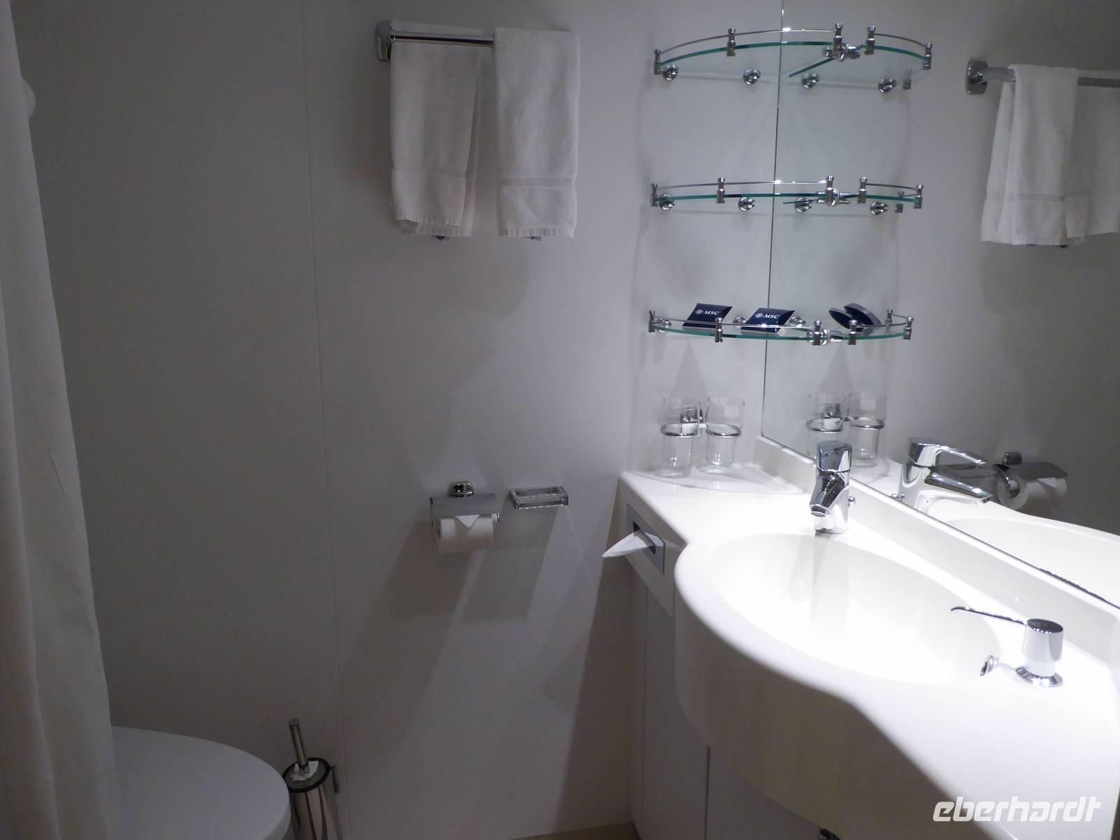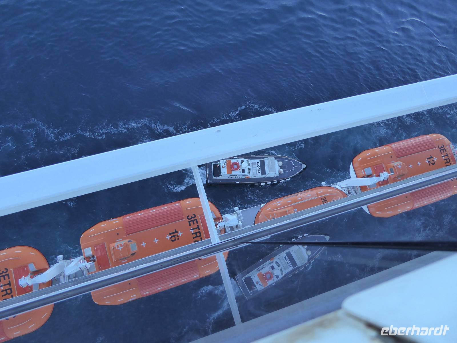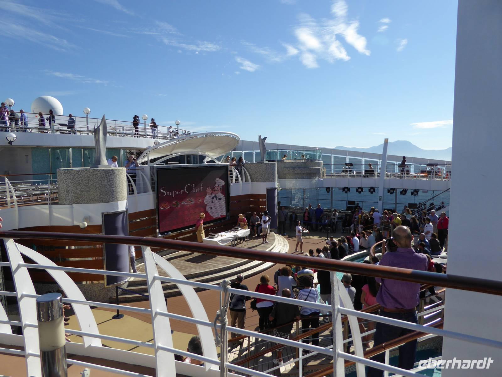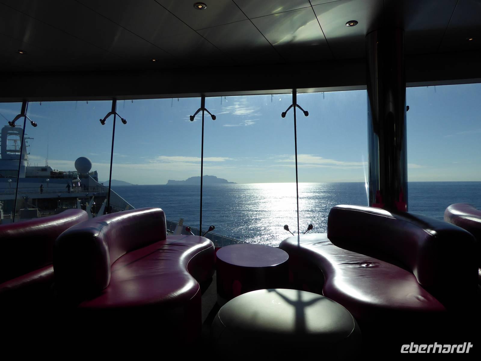 Alternativ dazu kann man auch den Tag an Bord verbringen und alle Annehmlichkeiten noch einmal genießen. Wer möchte, kann bereits um 9.15 Uhr mit den Animateuren einen Morgenspaziergang an Deck unternehmen, anschließend seine „Muskeln erwachen lassen" und sich mit Aerobic und Stretching für den Tag fit machen. Um 10.30 Uhr hat man die Wahl zum Samba Tanzunterricht zu gehen oder am Shuffleboard Turnier teil zu nehmen. Um 11.00 und 11.30 Uhr ist dann der Geist gefragt - am Aquapark wird zum Quiz eingeladen. Der Mittag gehört den kulinarischen Genüssen. In der Zanzibar bedient man sich selbst an internationaler Küche, selbst ein „ethnisches" Buffet gibt es, ansonsten klassisch: Kartoffeln in verschiedensten Zubereitungen, Gemüse, Fisch, Fleisch, Salat, Obst und Kuchen ohne Ende. Wer es etwas vornehmer mag, kann sich auch im Restaurant bedienen lassen. Nachmittags gibt es wieder ein abwechslungsreiches Animationsprogramm am Aquapark. Alternativ kann der Wellnessbereich besucht werden und man (oder frau) kann sich beim Friseur für den Abschiedsabend aufhübschen lassen. Eine weitere Alternative sind die diversen Pools und Whirlpools und hunderte Liegen, um die sich niemals an Bord ein Handtuchwettkampf entfacht, da es einfach genügend Liegen gibt.