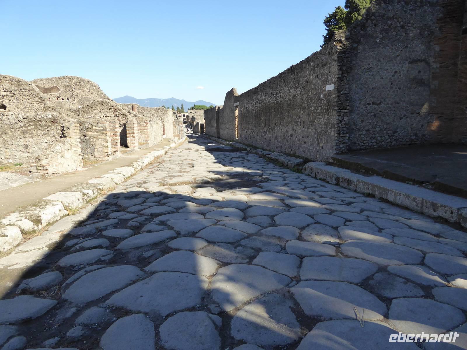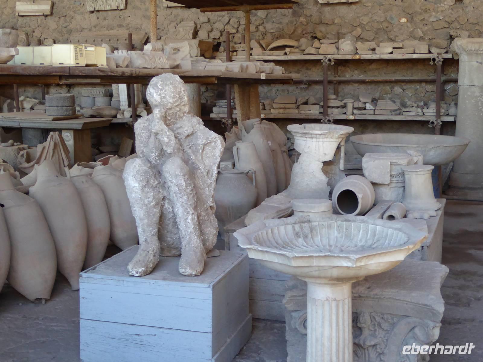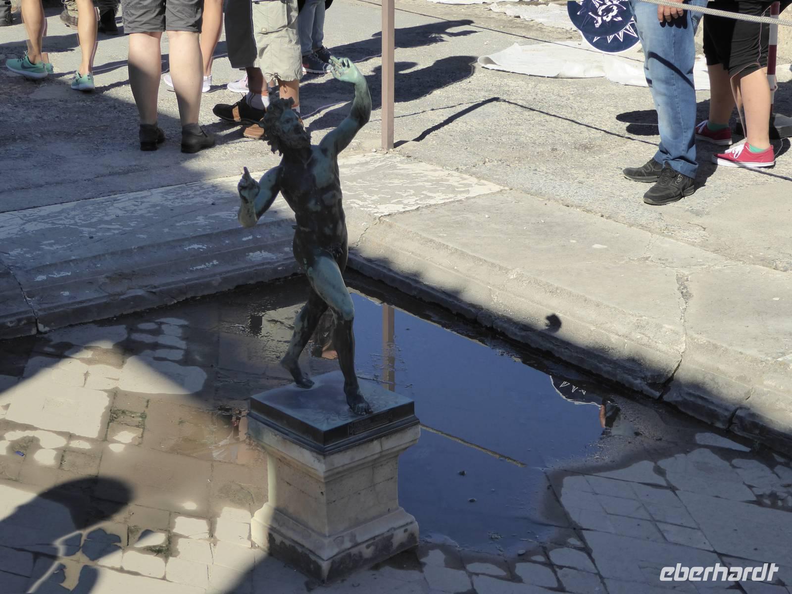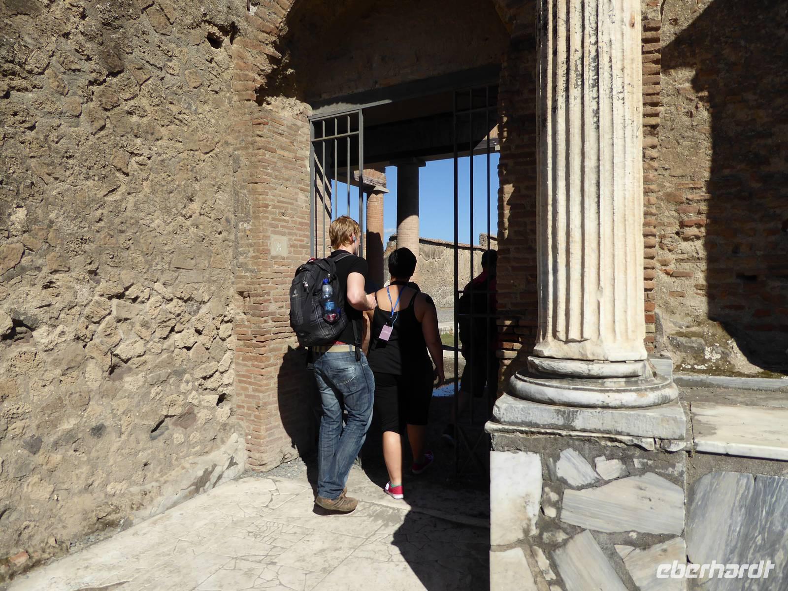 Nach einer halben Stunde Fahrt mit dem Bus erhalten alle Teilnehmer Kopfhörer, die es ermöglichen, den Guide auch auf weitere Entfernungen deutlich zu hören. Wir besichtigen die Ruinen der Stadt, in der einst blühendes Leben herrschte. Unserem Guide gelingt es, die Führung so zu gestalten, dass wir eine Vorstellung von der Stadt bekommen. Besonders faszinierend scheint für ihn das Eroscenter zu sein, denn immer wieder macht er uns darauf aufmerksam, welche Hinweise es noch heute zu dem damaligen erotischen Leben der Stadt gibt. Wir besuchen das Haus des Fauns, eine Villa aus dem zweiten Jahrhundert v. Chr., die einem Patrizier gehörte und nach einer Bronzestatue im Atrium des Hauses benannt wurde. Interessant ist auch die Bäckerei, die den Eindruck macht, als könnte sie man heute wieder in Betrieb nehmen. Zum Schluss, als alle Füße müde sind, bleibt noch Zeit, ein Souvenir zu erstehen oder ein leckeres Eis zu überhöhtem Touristenpreis zu kosten.