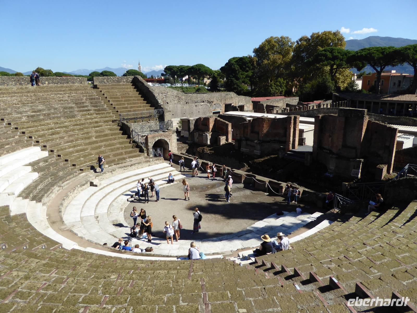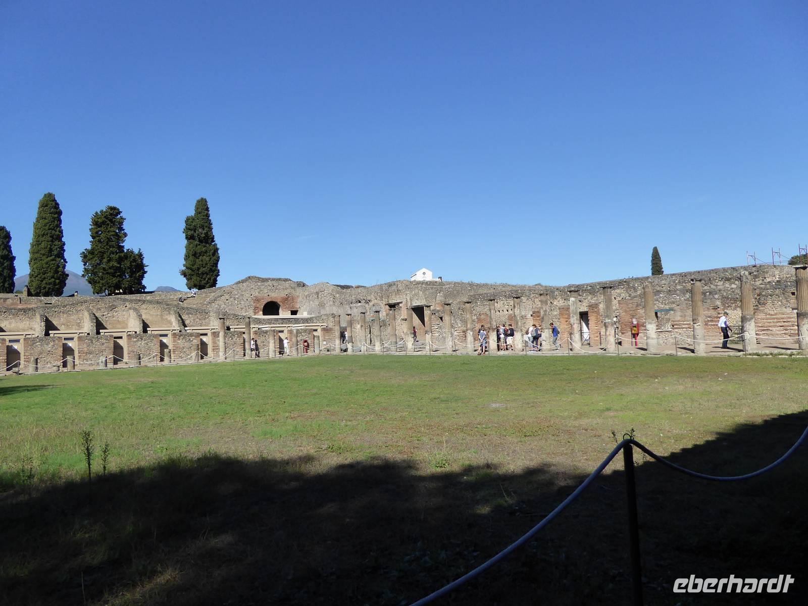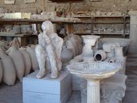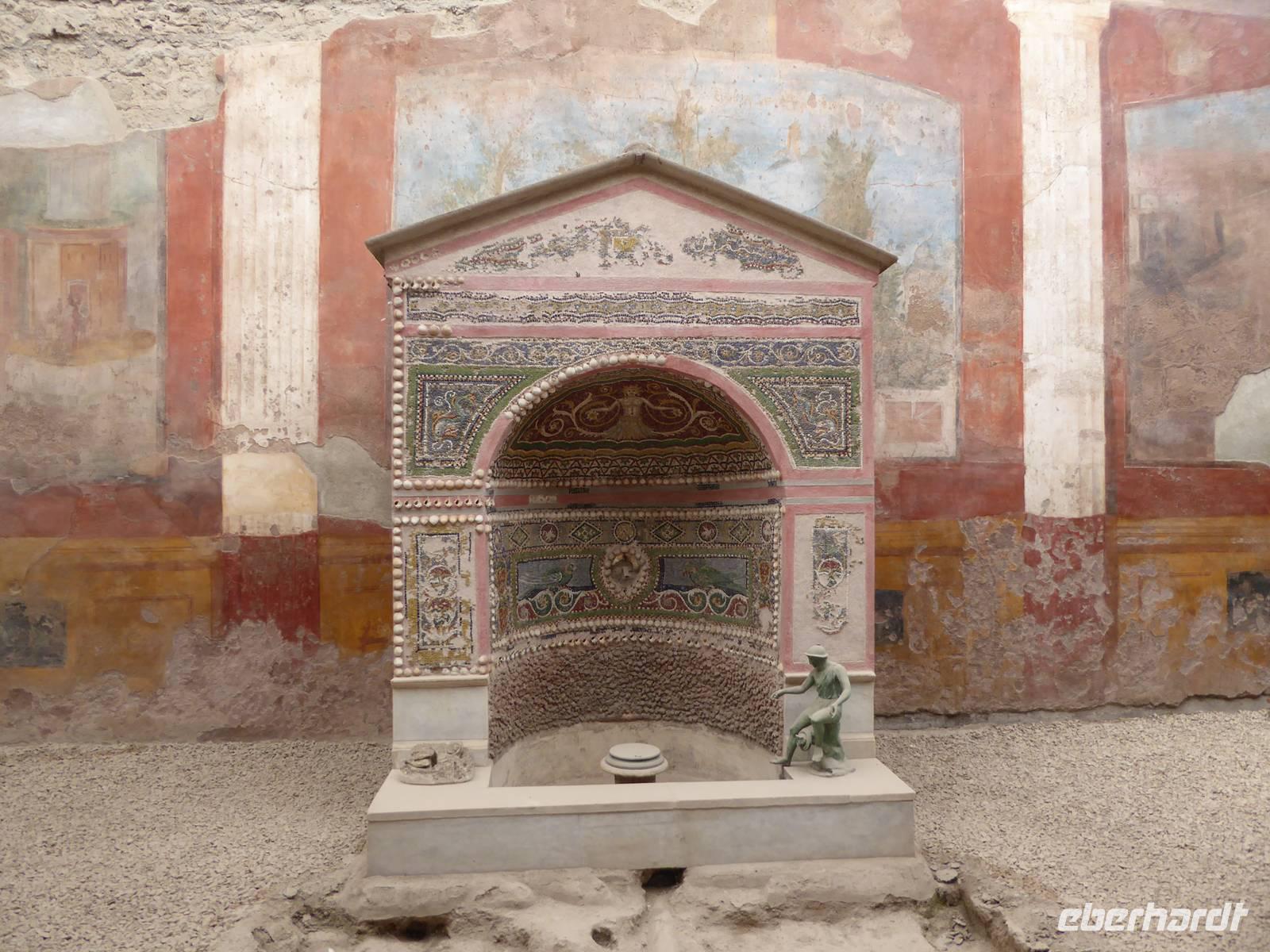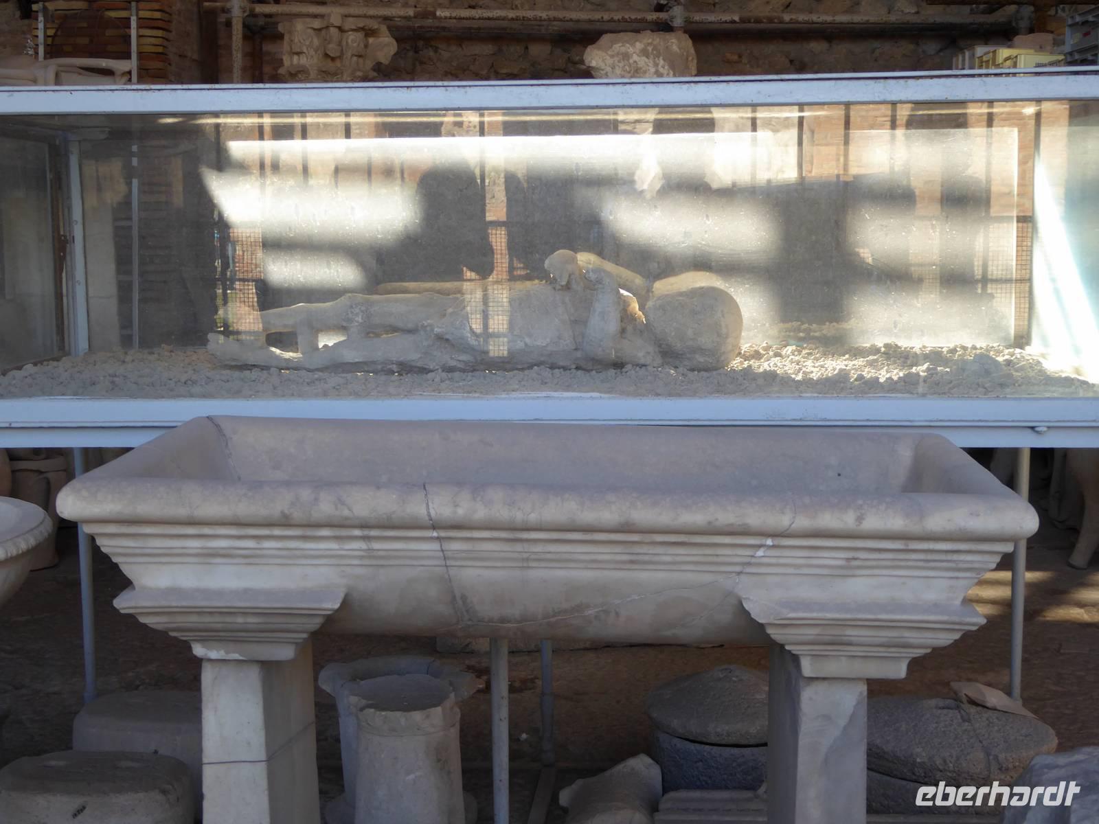 Nach einer halben Stunde Fahrt mit dem Bus erhalten alle Teilnehmer Kopfhörer, die es ermöglichen, den Guide auch auf weitere Entfernungen deutlich zu hören. Wir besichtigen die Ruinen der Stadt, in der einst blühendes Leben herrschte. Unserem Guide gelingt es, die Führung so zu gestalten, dass wir eine Vorstellung von der Stadt bekommen. Besonders faszinierend scheint für ihn das Eroscenter zu sein, denn immer wieder macht er uns darauf aufmerksam, welche Hinweise es noch heute zu dem damaligen erotischen Leben der Stadt gibt. Wir besuchen das Haus des Fauns, eine Villa aus dem zweiten Jahrhundert v. Chr., die einem Patrizier gehörte und nach einer Bronzestatue im Atrium des Hauses benannt wurde. Interessant ist auch die Bäckerei, die den Eindruck macht, als könnte sie man heute wieder in Betrieb nehmen. Zum Schluss, als alle Füße müde sind, bleibt noch Zeit, ein Souvenir zu erstehen oder ein leckeres Eis zu überhöhtem Touristenpreis zu kosten.