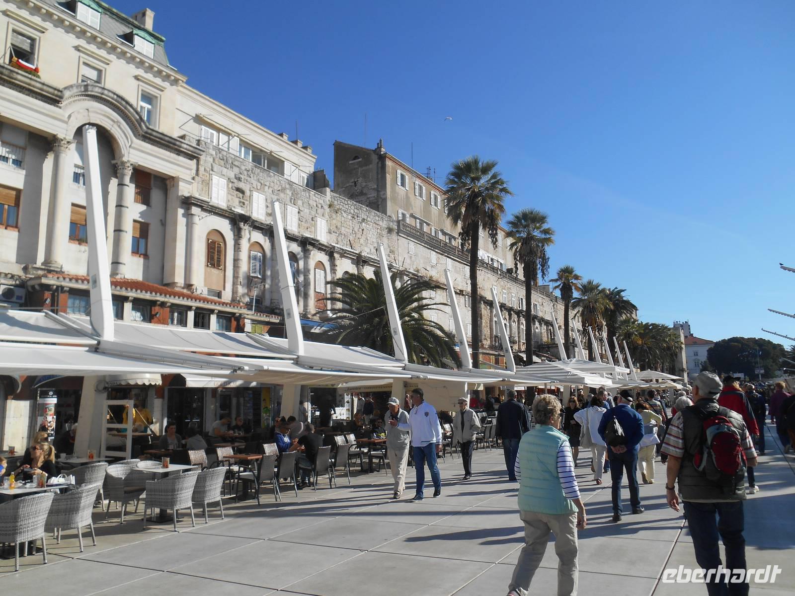 Nun stehen uns die zahlreichen Mitarbeiter des Schiffes mit Rat und Tat zur Seite, damit jeder der Gäste auch zu seinem Ausflug kommt. Unten, am Ausgang, werden wir schon von den kroatischen Reiseleitern erwartet, mit ihnen werden wir nun eine der eigentümlichsten Orte an der Adria besuchen: die Altstadt von Split.