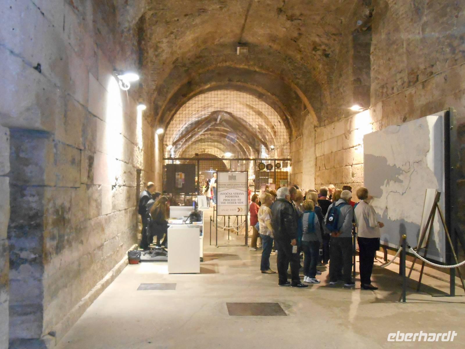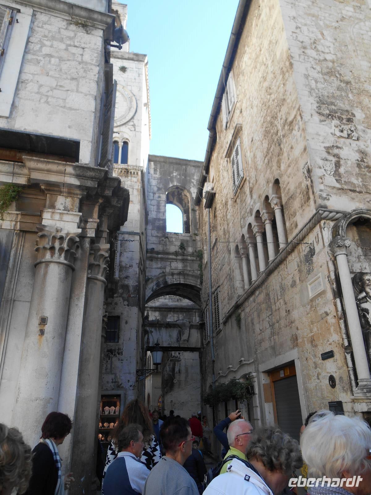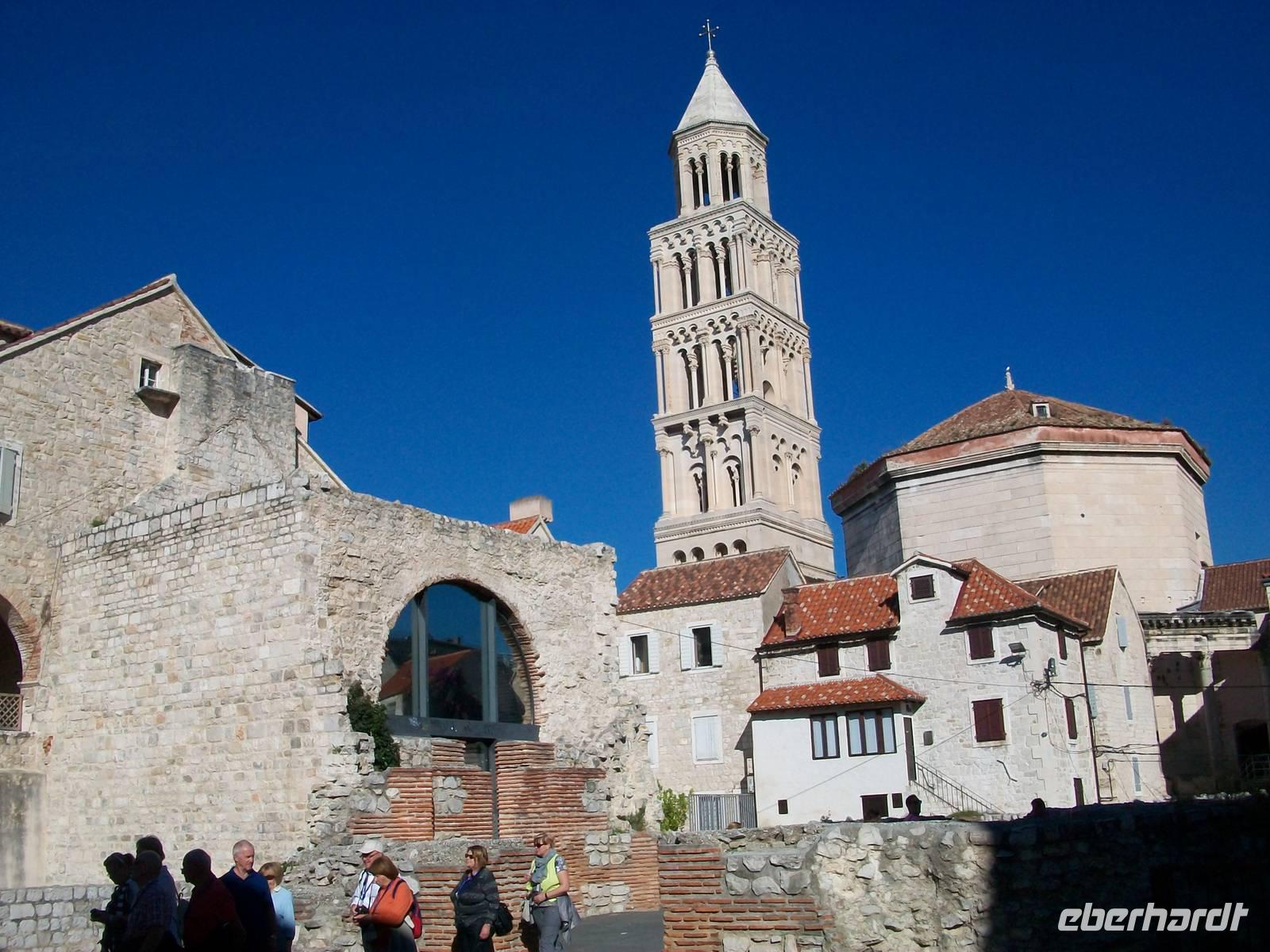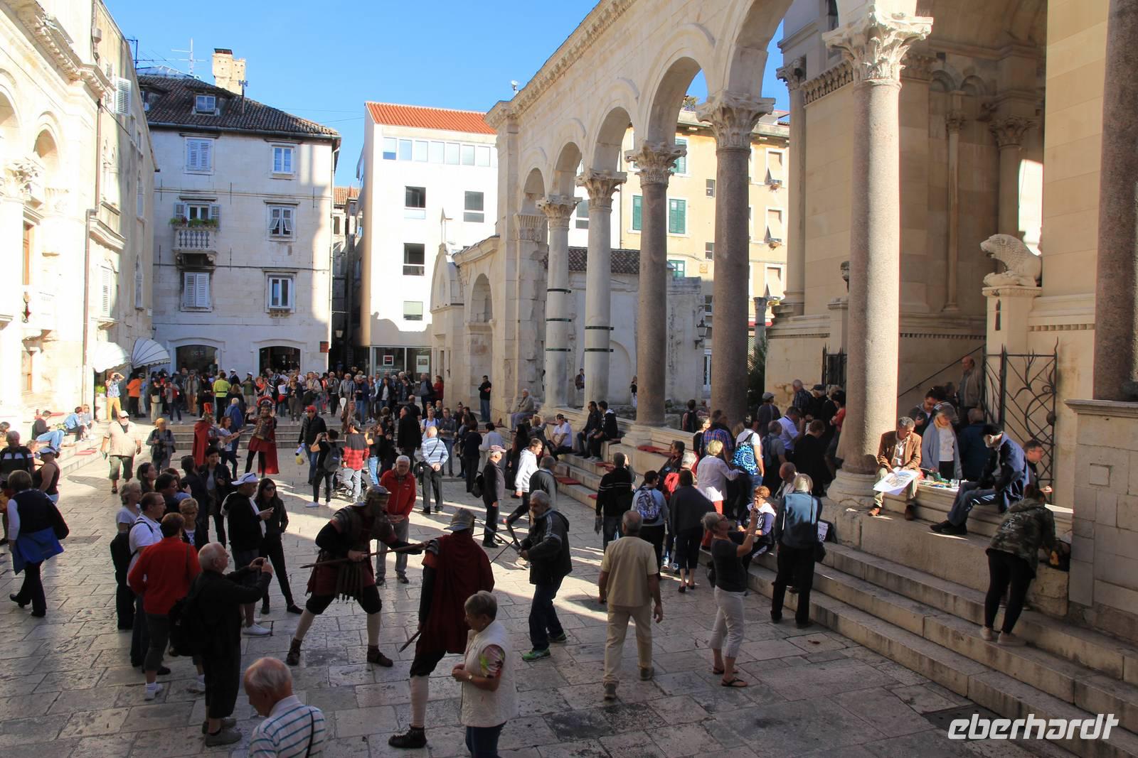 Einst sollte der Palast den Herrscher schützen; er wurde längst von Touristen aus allen Teilen dieser Welt erobert. Wir lassen uns einfach im Strom der Besucher treiben und drehen dabei die Zeit zurück. Unsere Führer nehmen uns mit auf diese Zeitreise; hier in den Kellerräumen ist noch viel aus der Römerzeit erhalten geblieben, als wir aber die steile Treppe emporsteigen, haben wir gleich Jahrhunderte übersprungen und sind im Mittelalter angelangt. Schmale Gassen kreuzen sich hier und am Platz Peristyl sind wir im Zentrum angelangt. Mächtige Säulenreihen umstehen den Platz der von der Domkirche dominiert wird; hier, an diesem schönen Ort, gibt es oft Konzerte und Opernaufführungen.