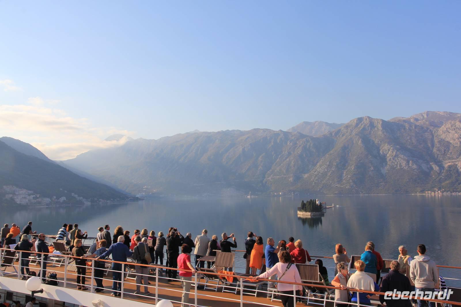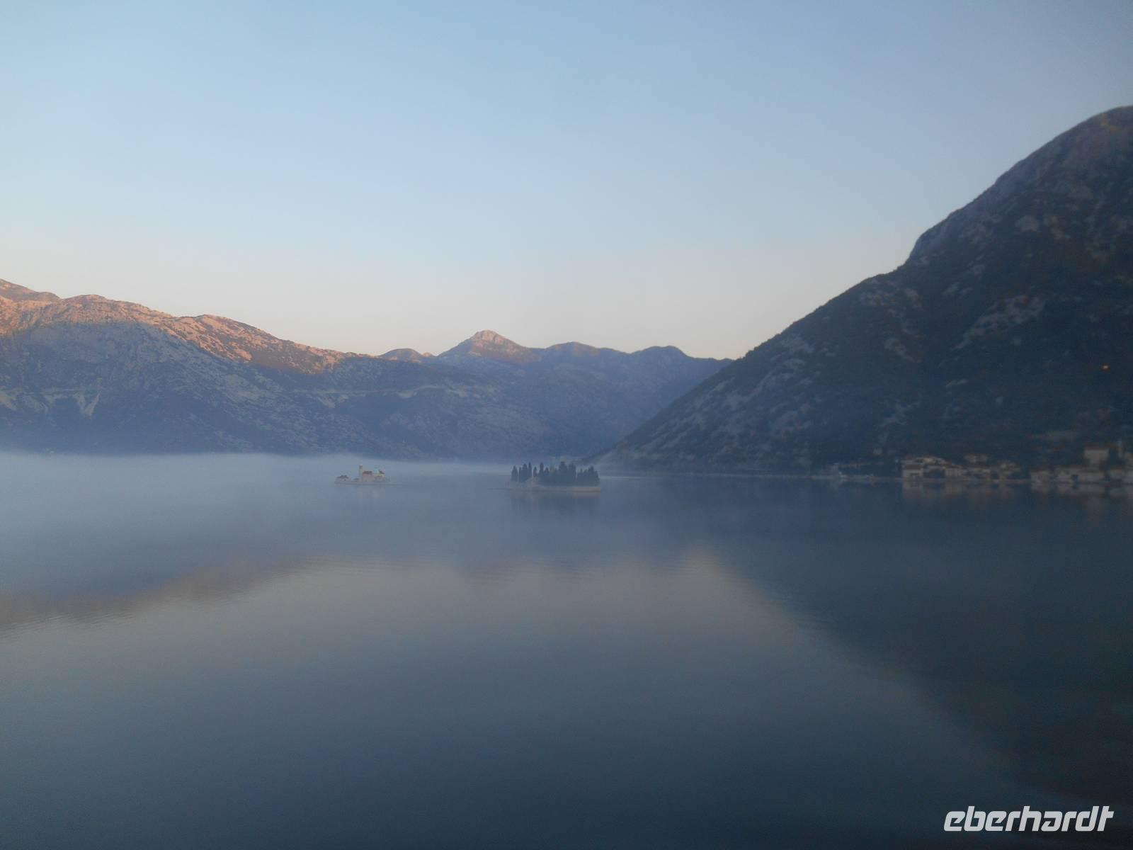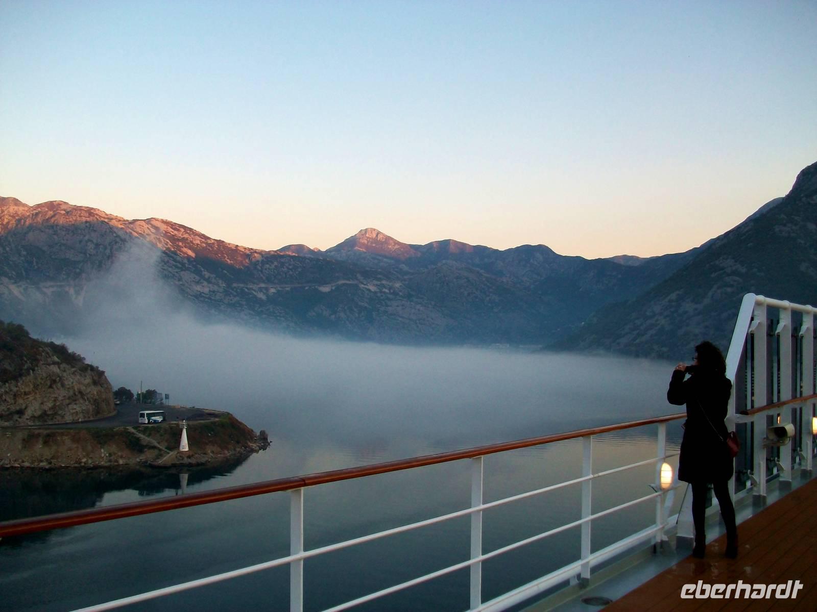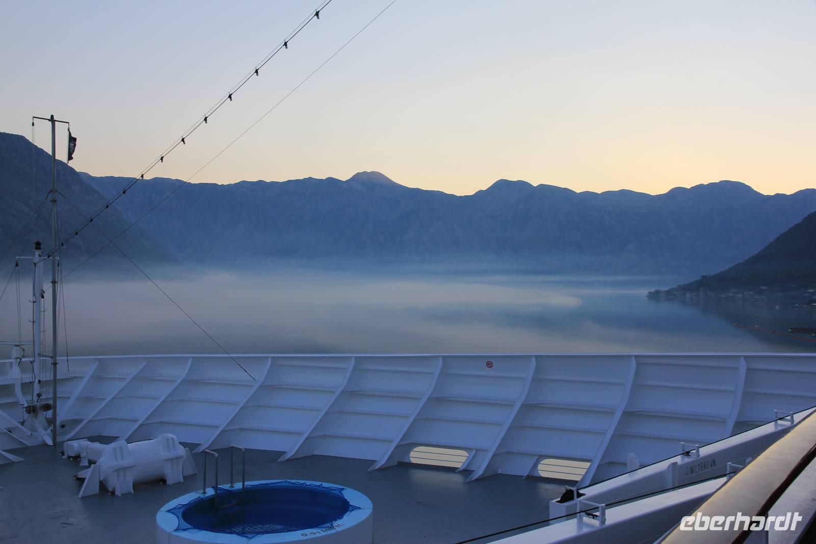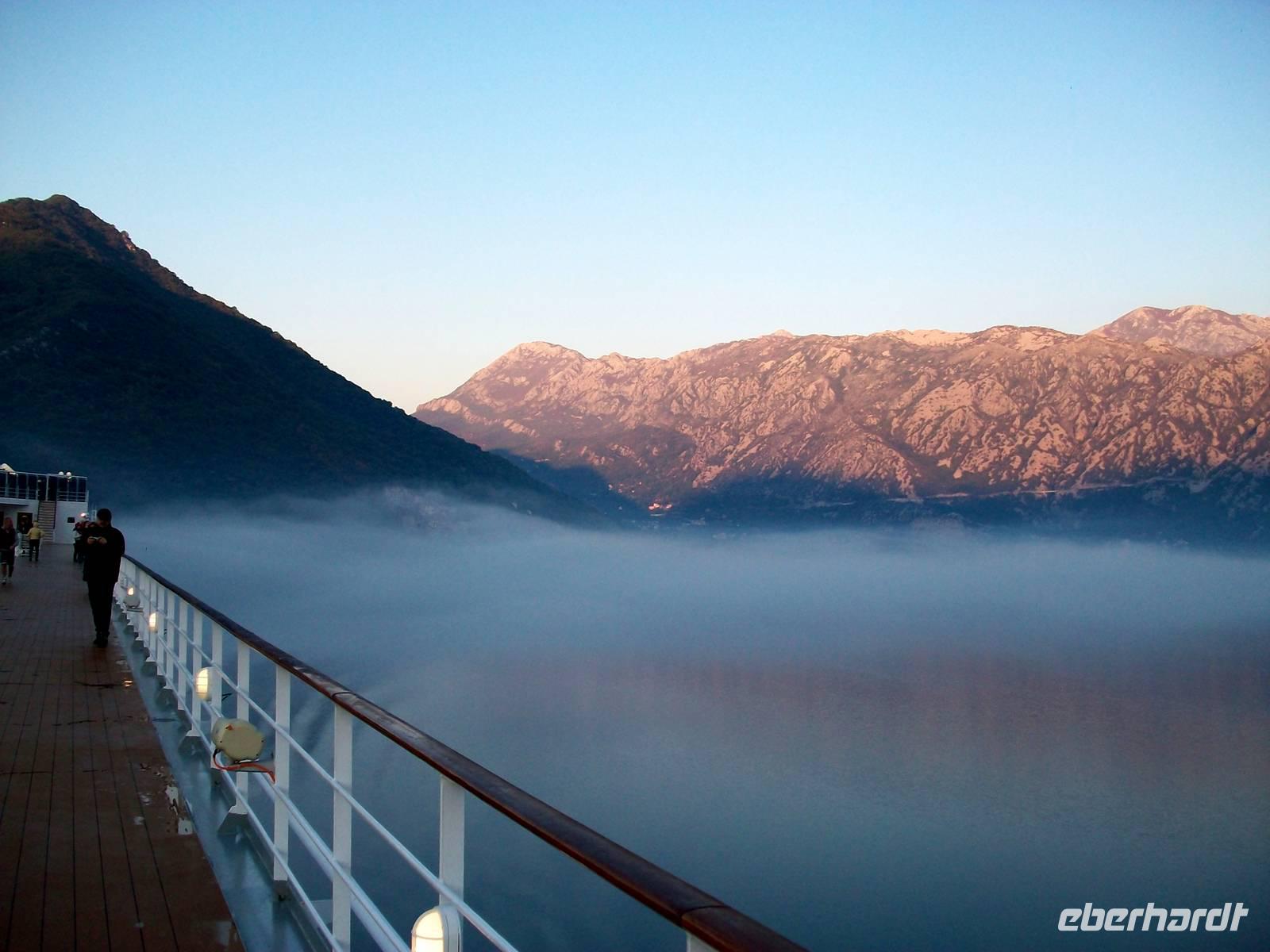 Schon am frühen Morgen laufen wir in die Bucht von Kotor ein. Das Bild, welches sich dabei dem Betrachter bietet, kann malerischer nicht sein: die oberen Spitzen der Berge werden schon von der Sonne angestrahlt, während es hier unten am Wasser noch dunkel ist. Dabei zerteilt das Schiff die Nebelschwaden, die in der Bucht liegen. Es ist eine sehr romantische Impression, die wir vom Oberdeck genießen können.