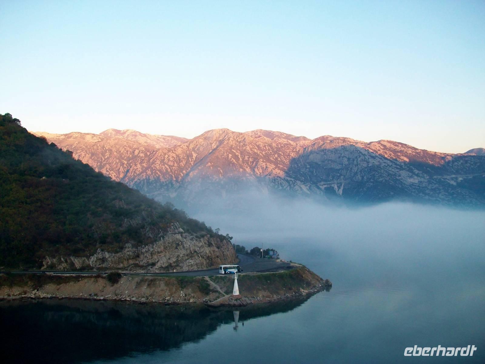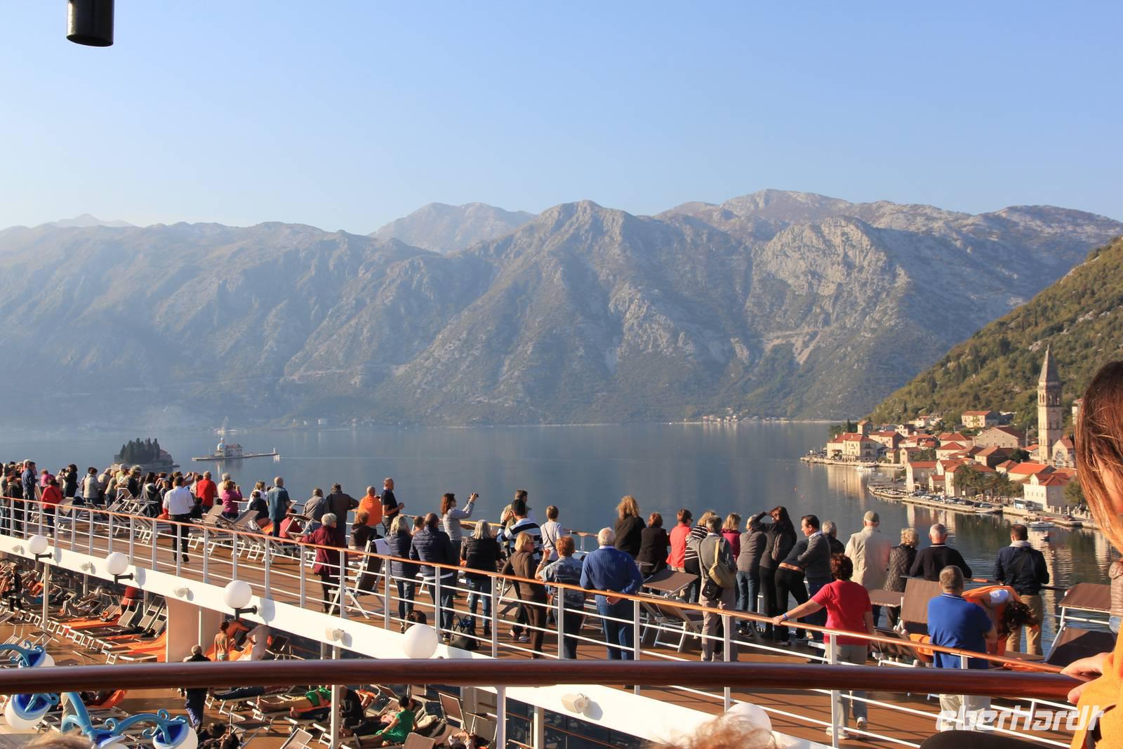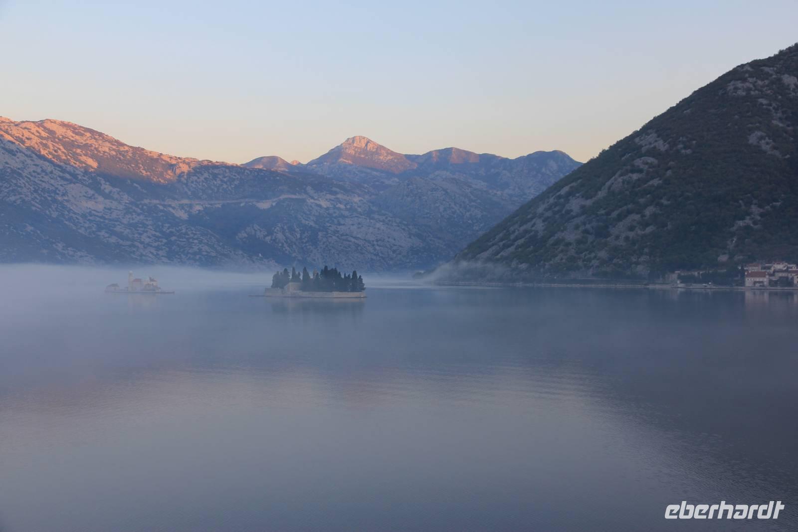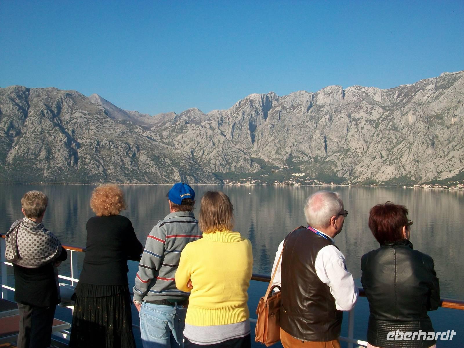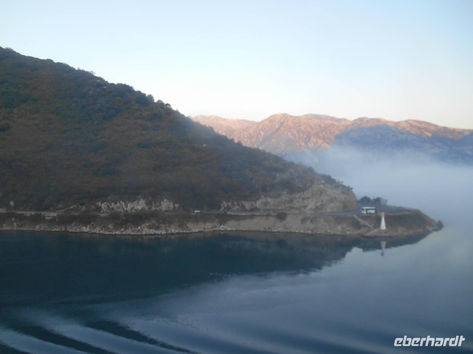 Schon am frühen Morgen laufen wir in die Bucht von Kotor ein. Das Bild, welches sich dabei dem Betrachter bietet, kann malerischer nicht sein: die oberen Spitzen der Berge werden schon von der Sonne angestrahlt, während es hier unten am Wasser noch dunkel ist. Dabei zerteilt das Schiff die Nebelschwaden, die in der Bucht liegen. Es ist eine sehr romantische Impression, die wir vom Oberdeck genießen können.
