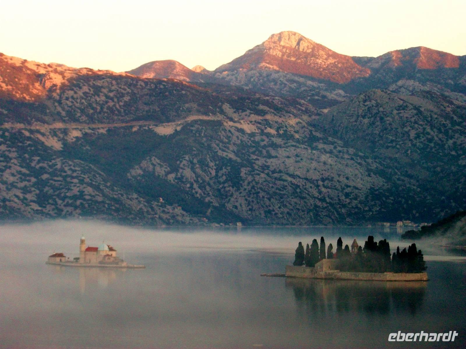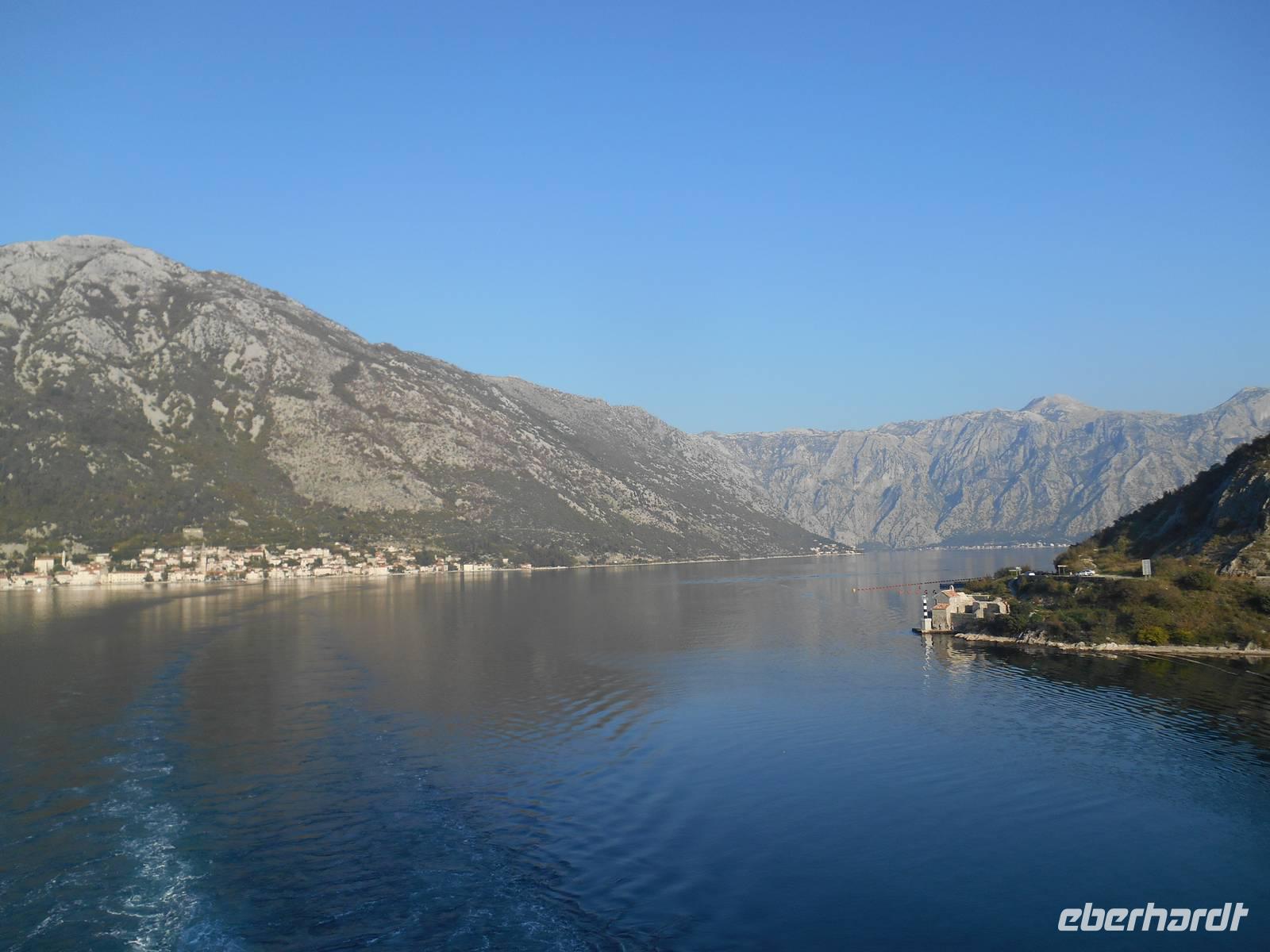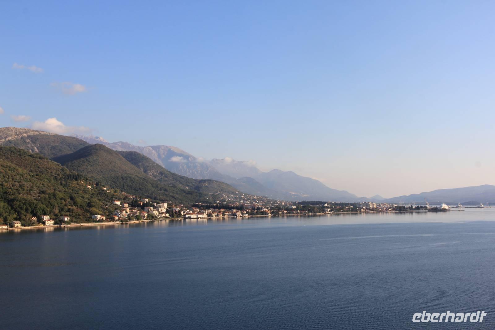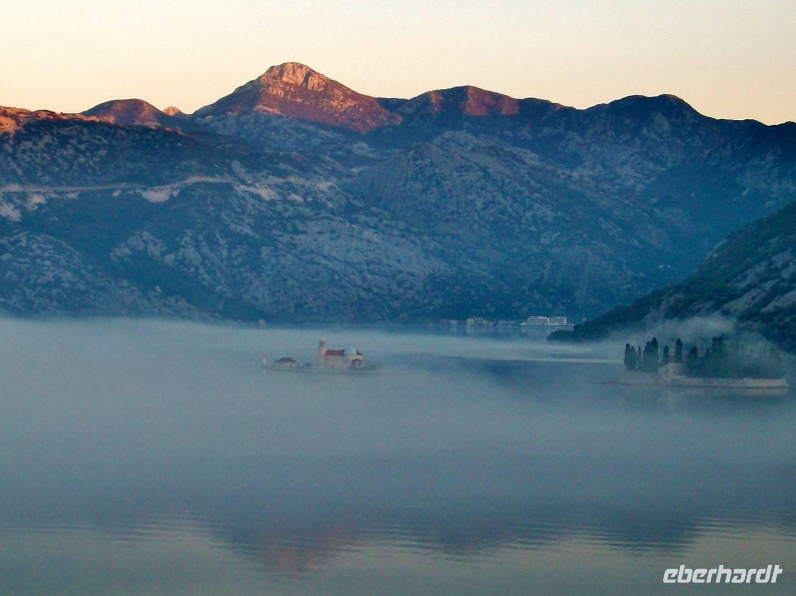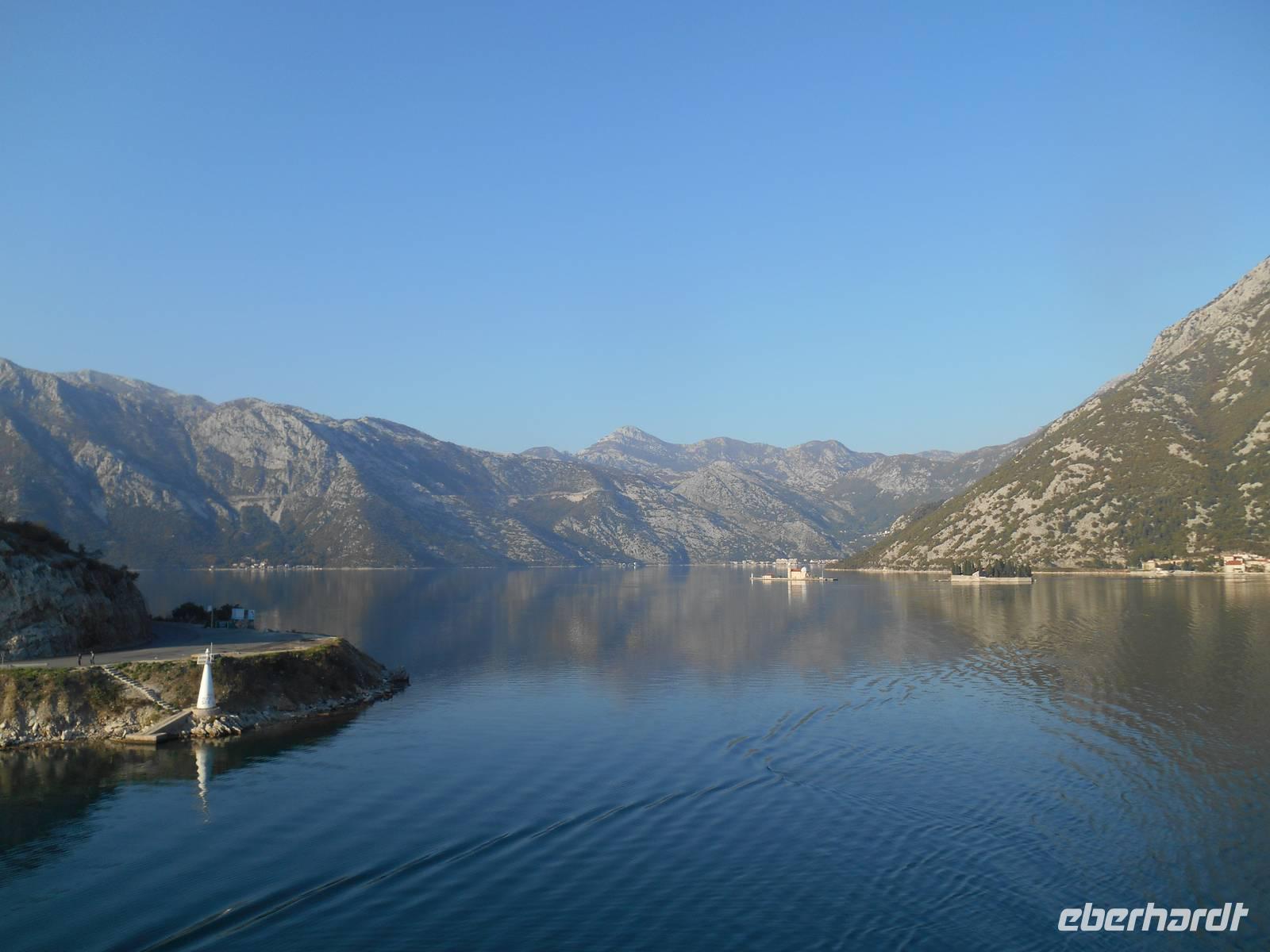 Schon am frühen Morgen laufen wir in die Bucht von Kotor ein. Das Bild, welches sich dabei dem Betrachter bietet, kann malerischer nicht sein: die oberen Spitzen der Berge werden schon von der Sonne angestrahlt, während es hier unten am Wasser noch dunkel ist. Dabei zerteilt das Schiff die Nebelschwaden, die in der Bucht liegen. Es ist eine sehr romantische Impression, die wir vom Oberdeck genießen können.
