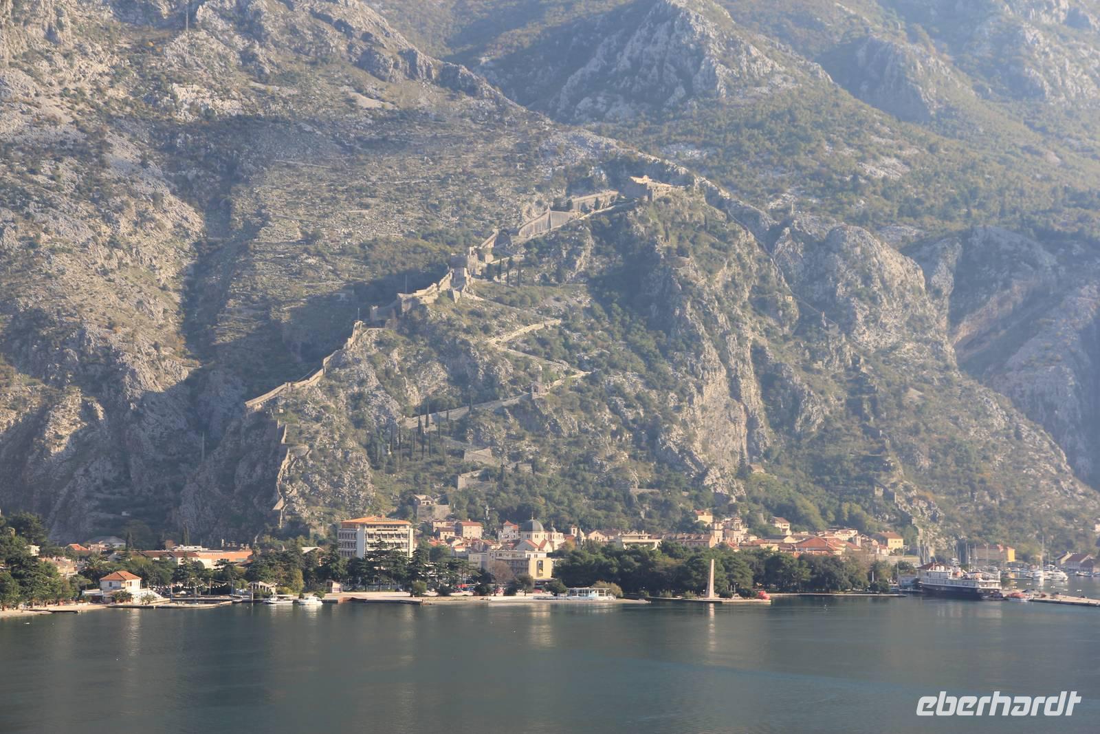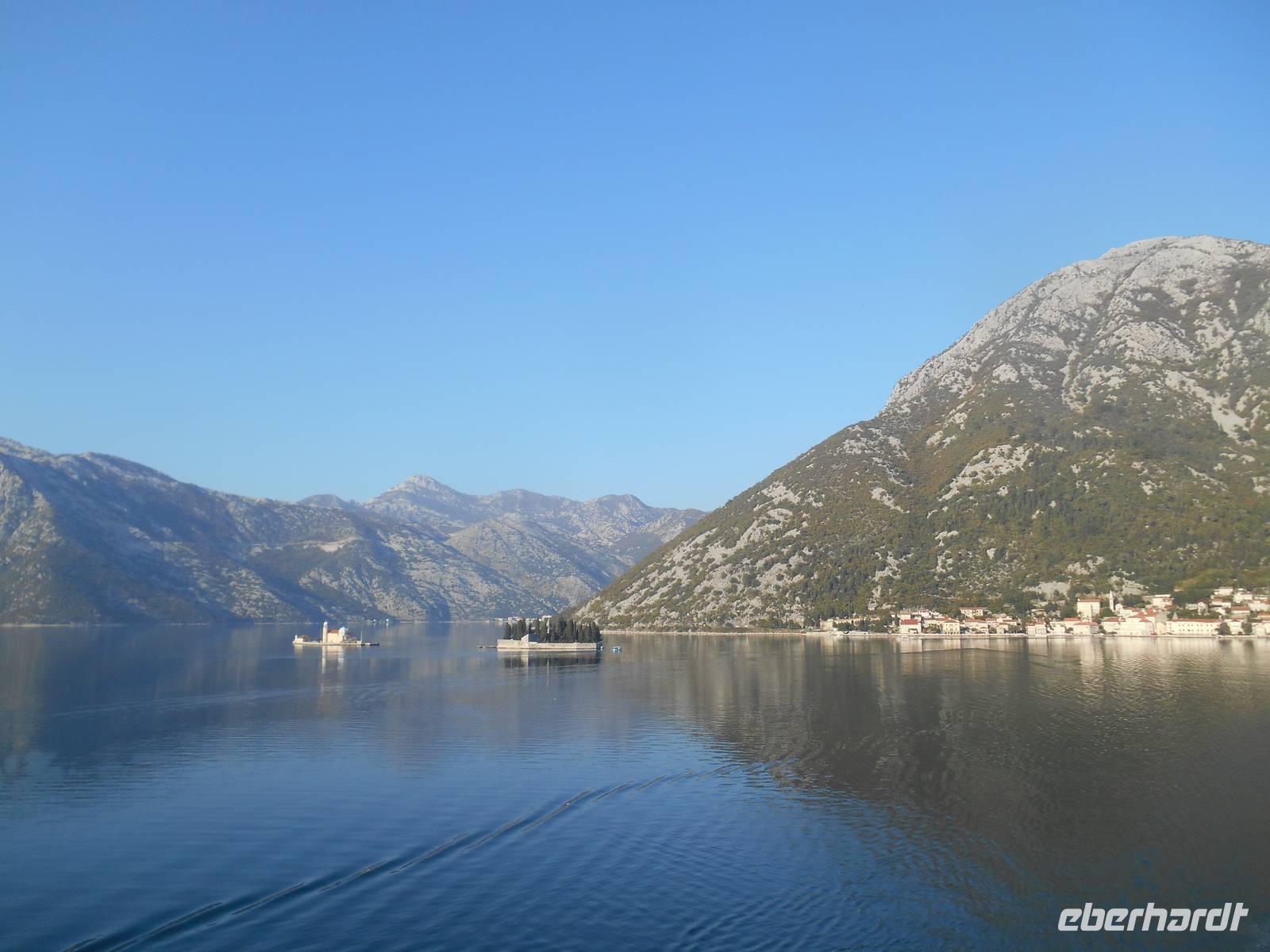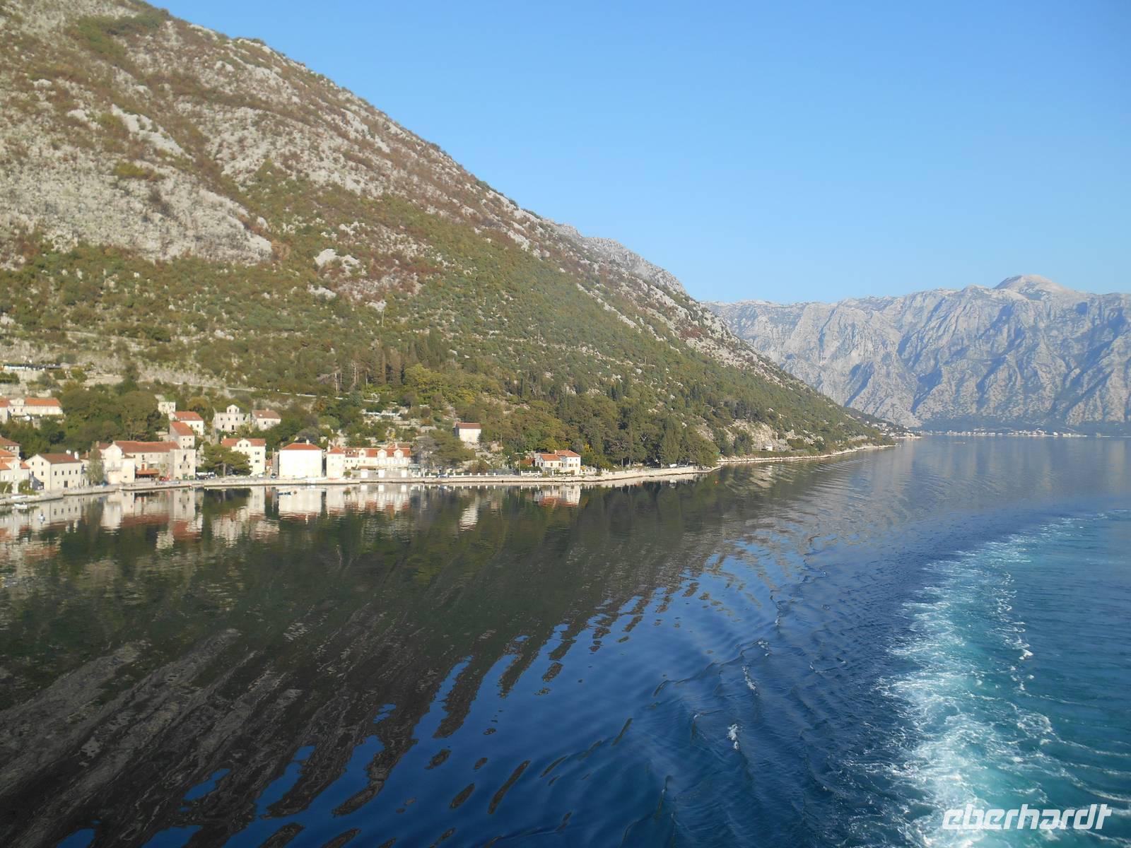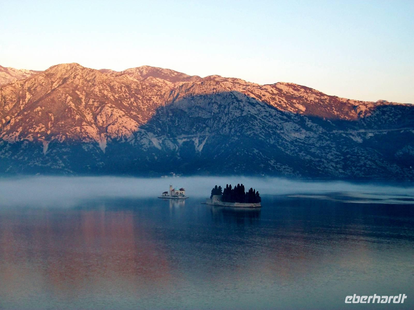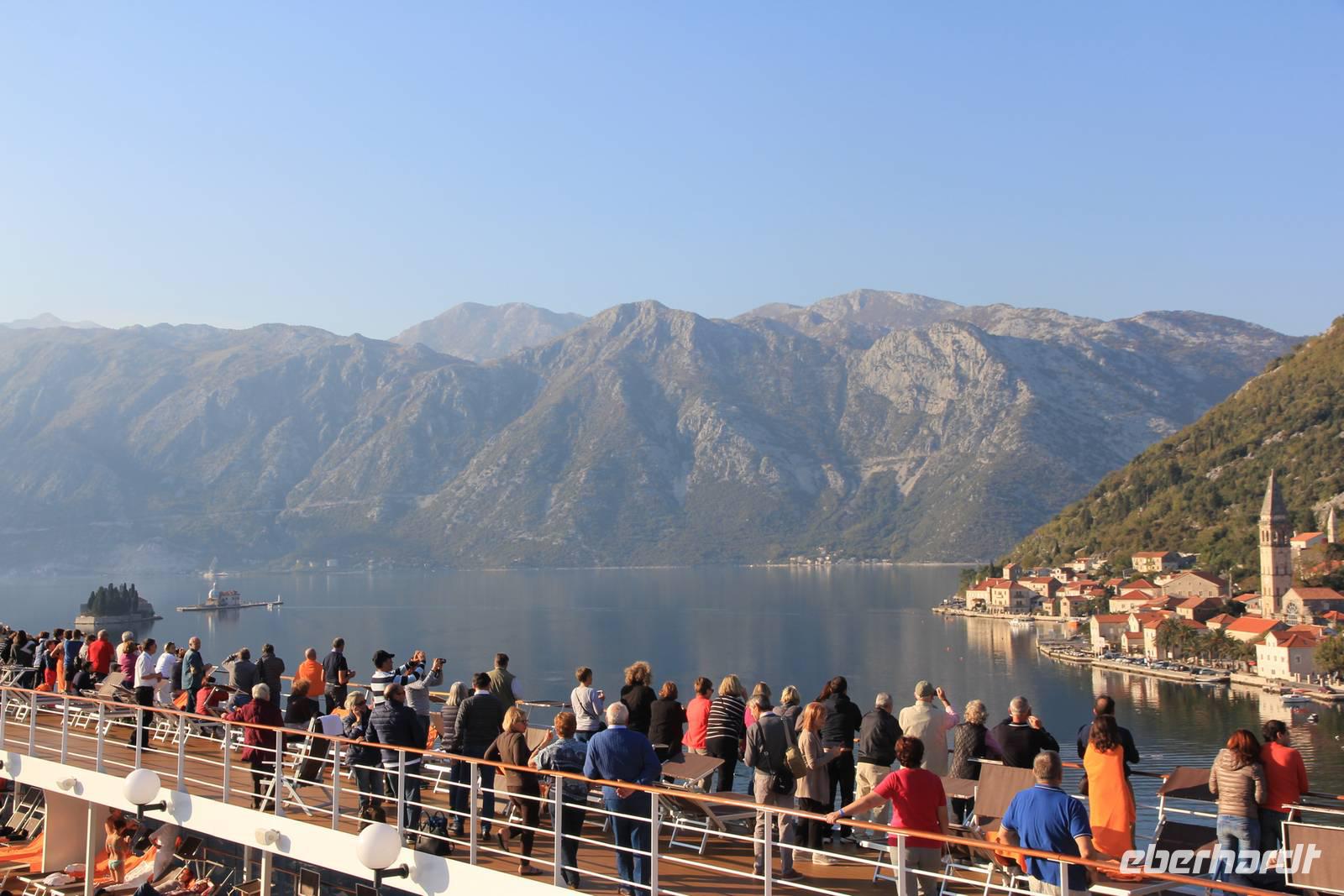 Schon am frühen Morgen laufen wir in die Bucht von Kotor ein. Das Bild, welches sich dabei dem Betrachter bietet, kann malerischer nicht sein: die oberen Spitzen der Berge werden schon von der Sonne angestrahlt, während es hier unten am Wasser noch dunkel ist. Dabei zerteilt das Schiff die Nebelschwaden, die in der Bucht liegen. Es ist eine sehr romantische Impression, die wir vom Oberdeck genießen können.