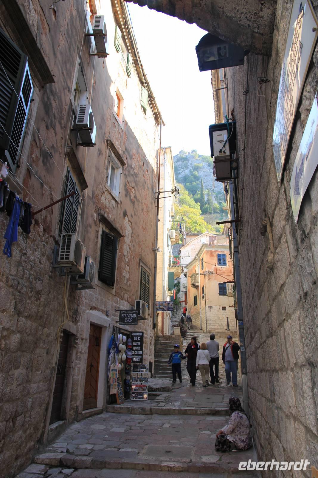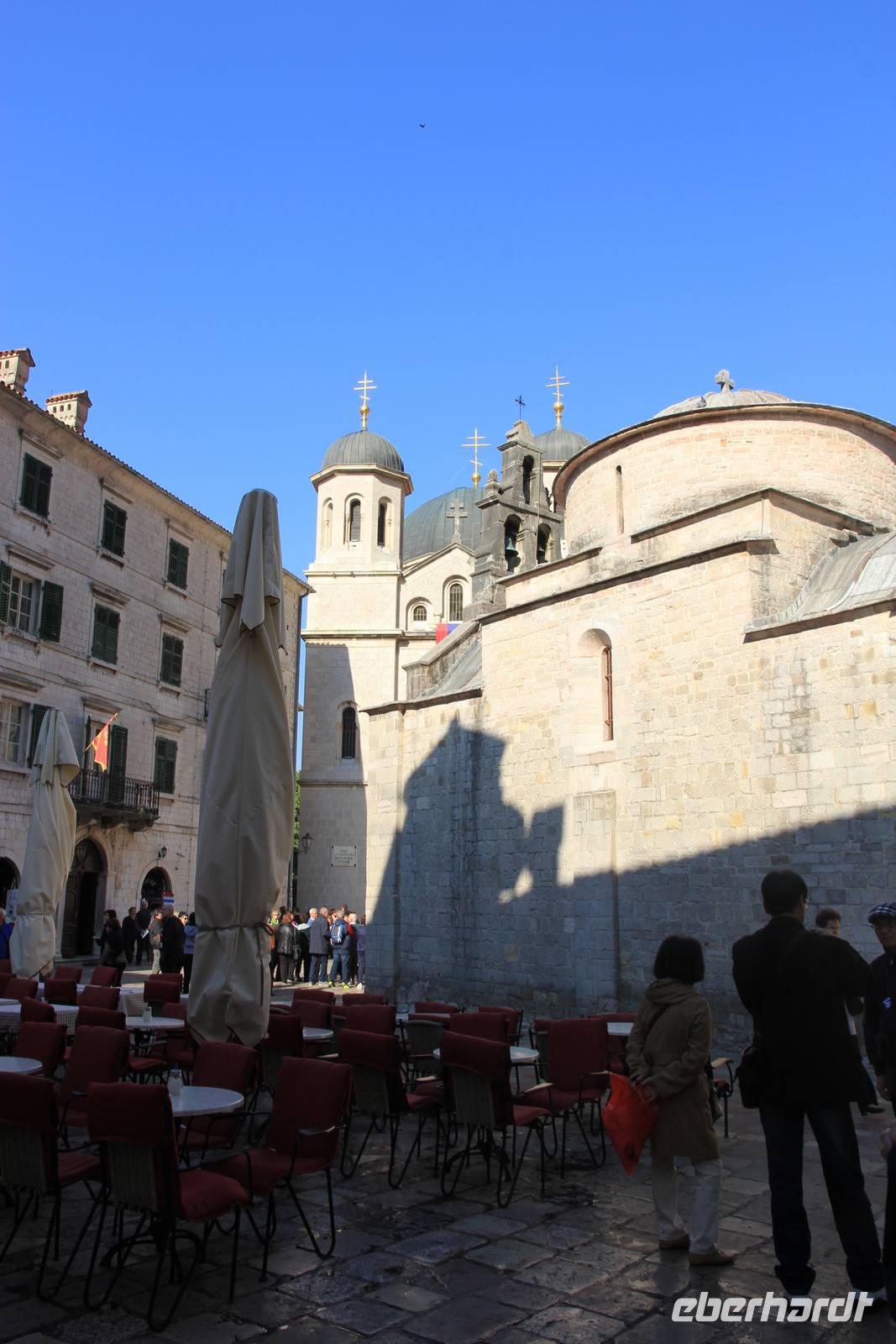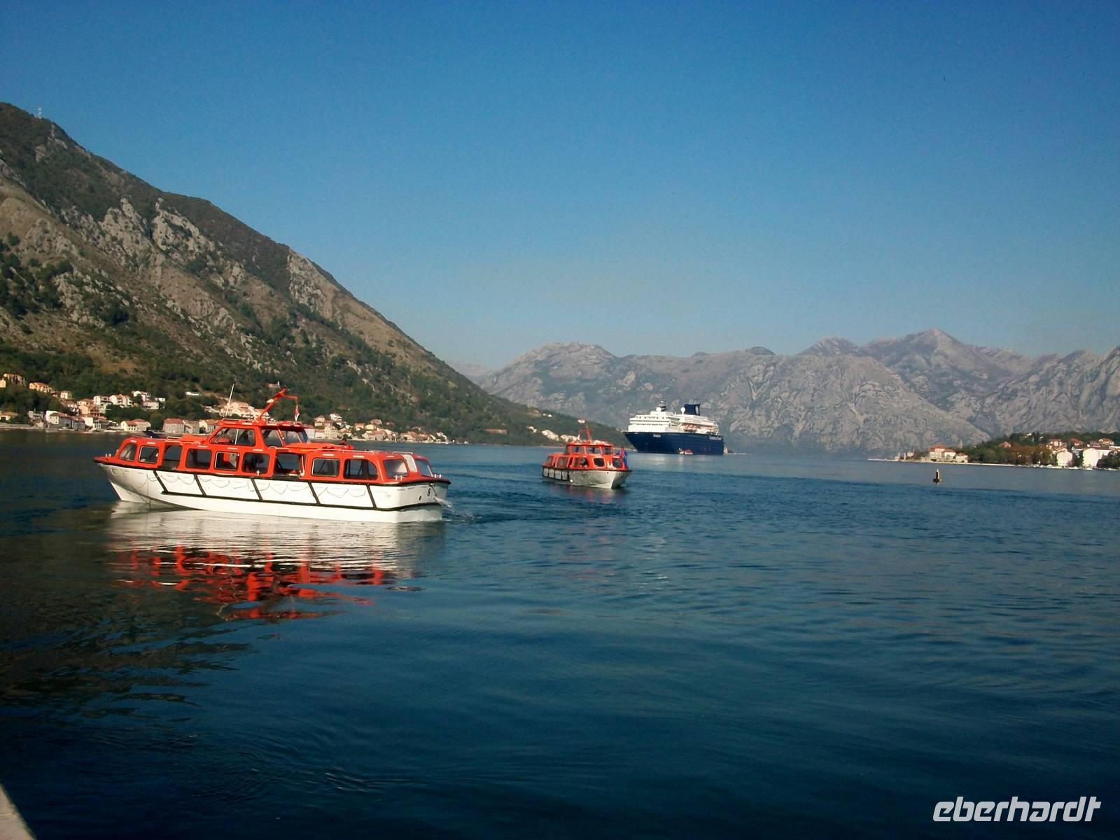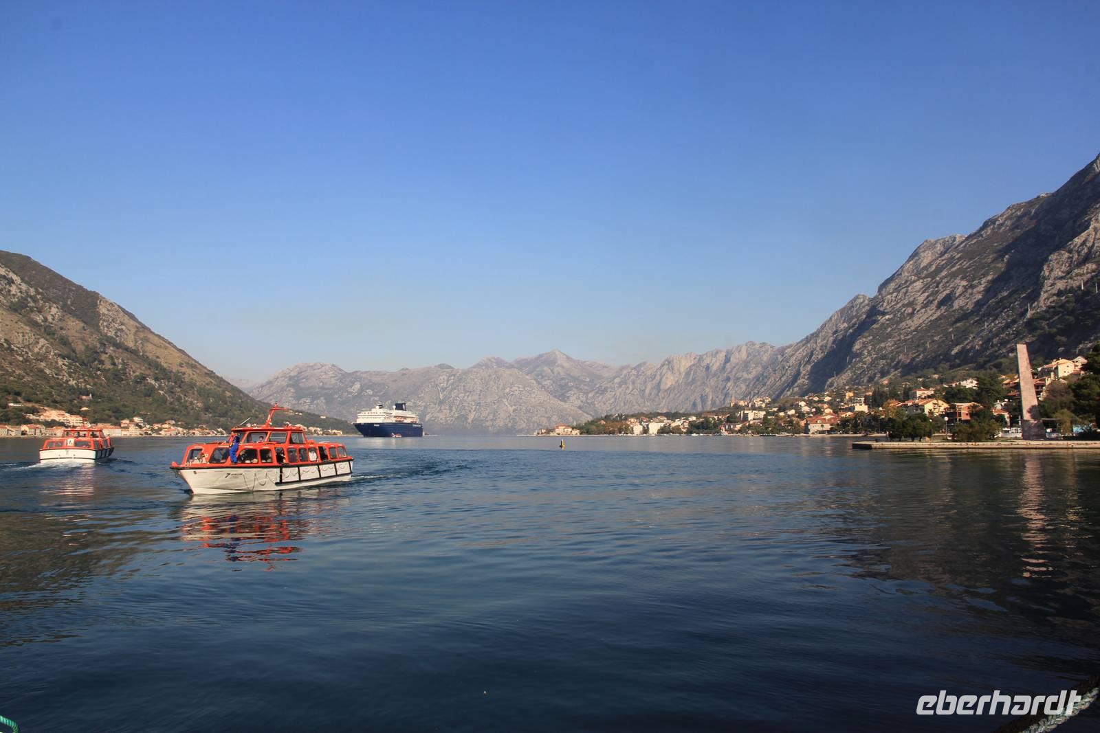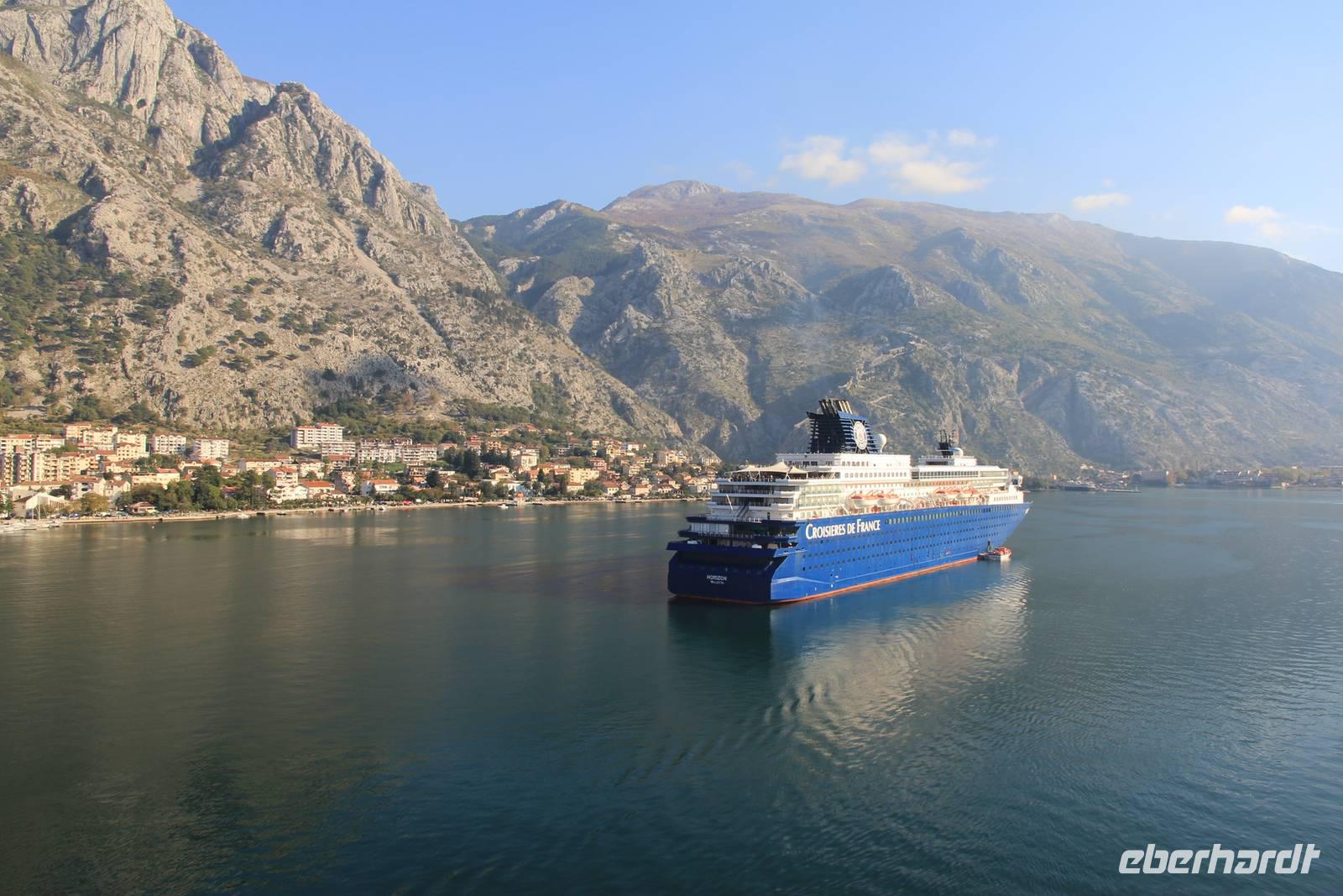 Schon am frühen Morgen laufen wir in die Bucht von Kotor ein. Das Bild, welches sich dabei dem Betrachter bietet, kann malerischer nicht sein: die oberen Spitzen der Berge werden schon von der Sonne angestrahlt, während es hier unten am Wasser noch dunkel ist. Dabei zerteilt das Schiff die Nebelschwaden, die in der Bucht liegen. Es ist eine sehr romantische Impression, die wir vom Oberdeck genießen können.