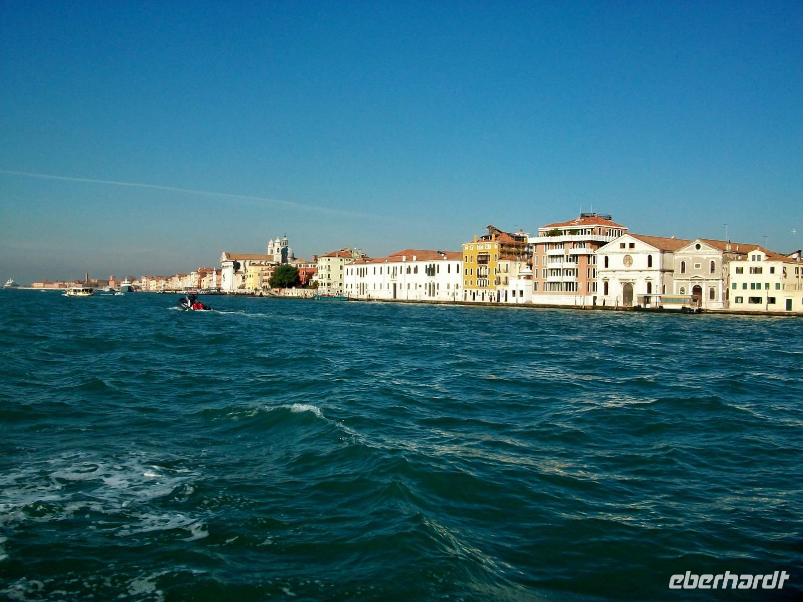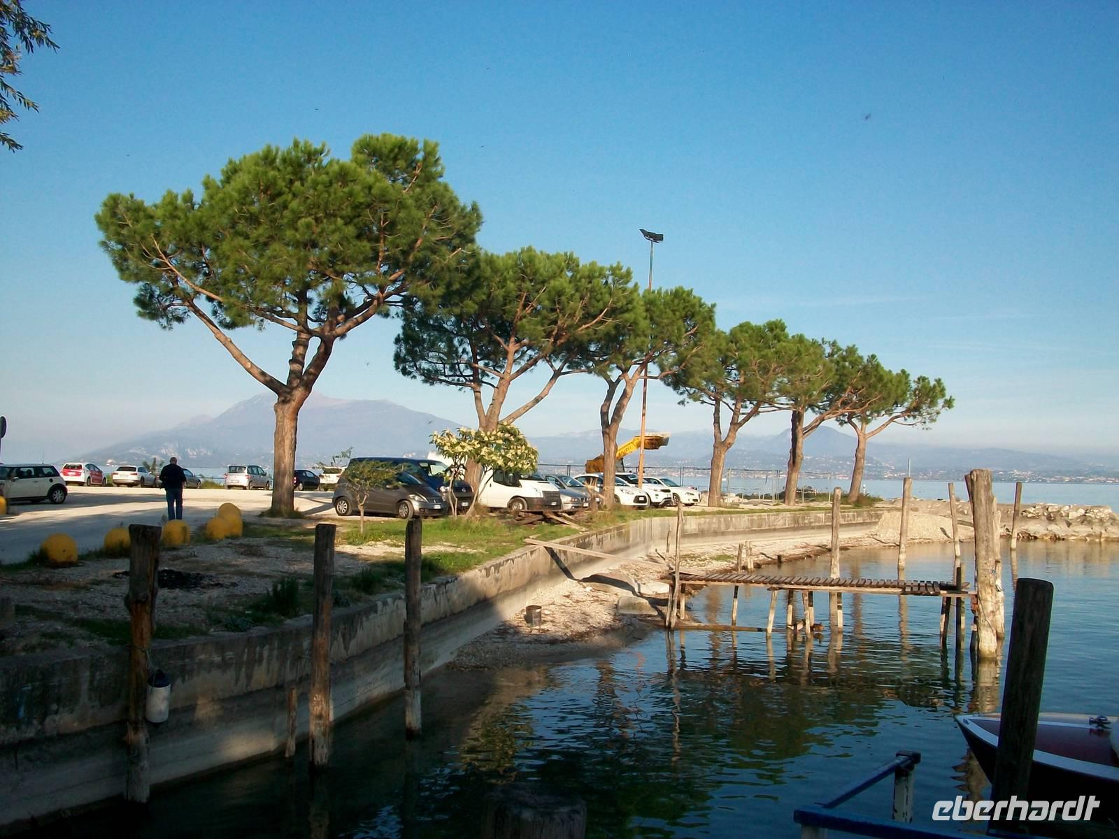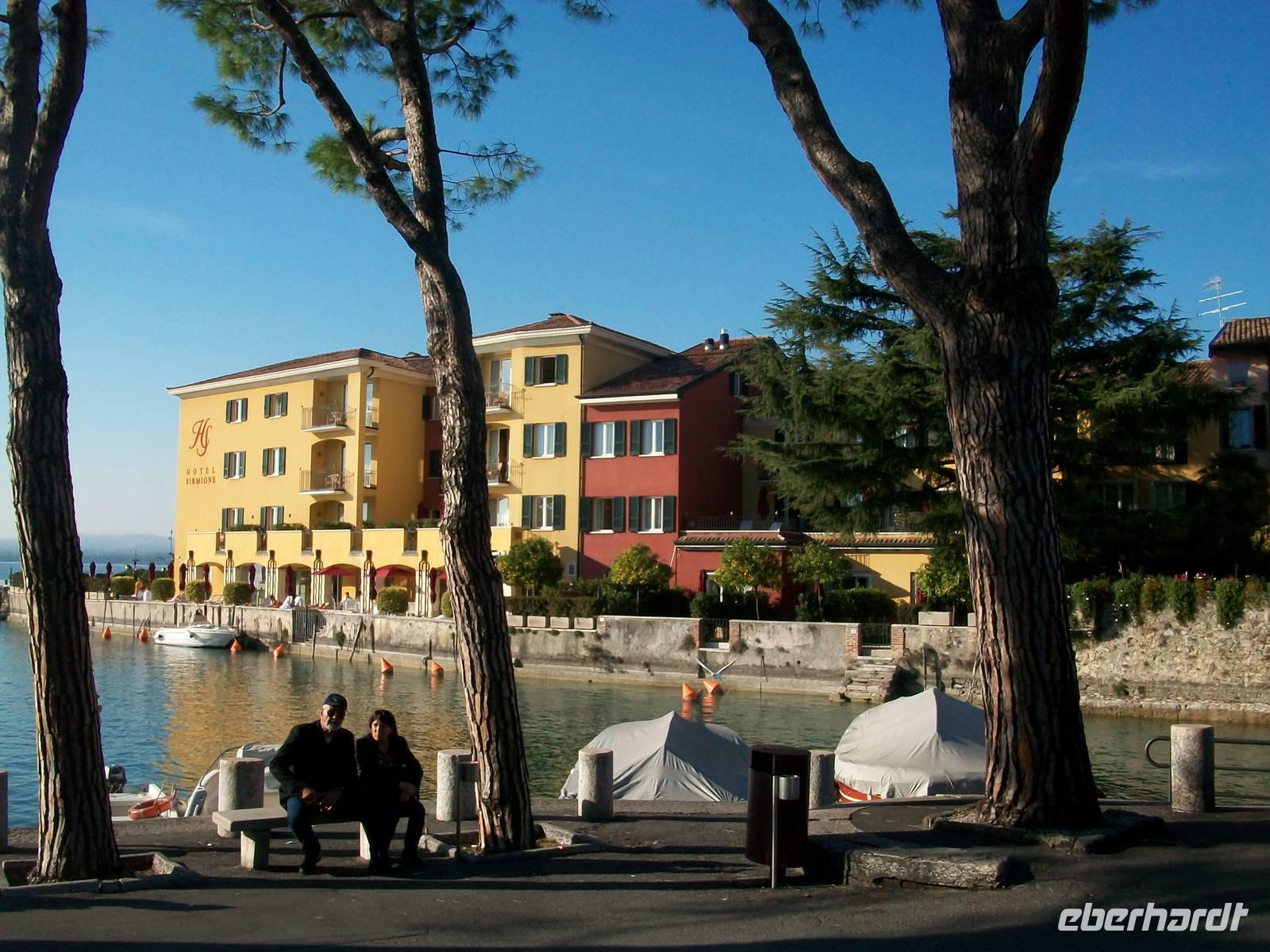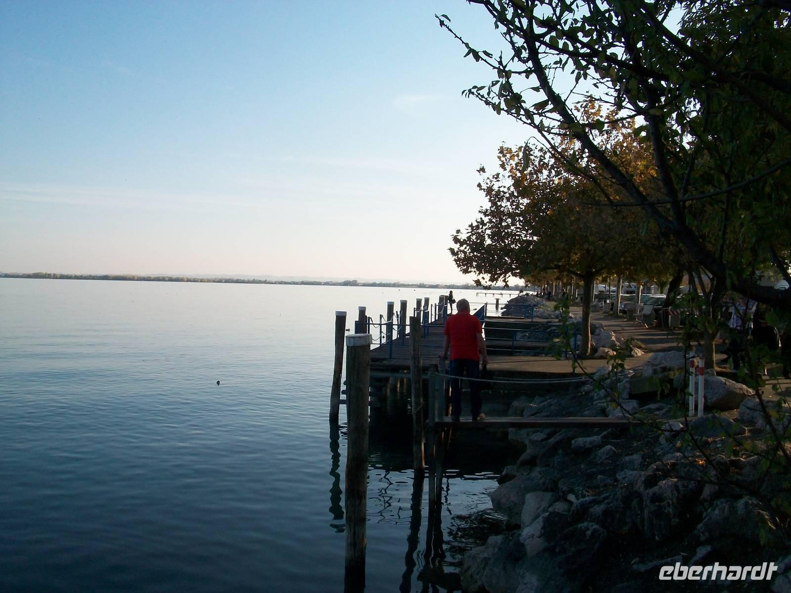 Der Weg führt uns dann noch über schöne Plätze und danach zurück zur sonnendurchfluteten Riva; ganz hinten ist auch unser Schiff auszumachen auf dem schon das Mittagessen bereitet wird, welches uns wenig später die nötige Kräftigung gibt.