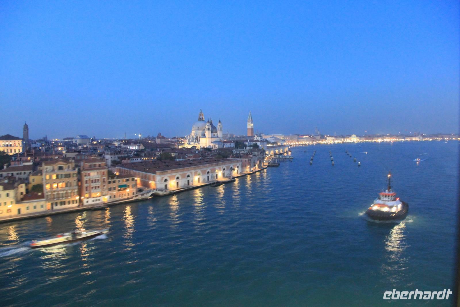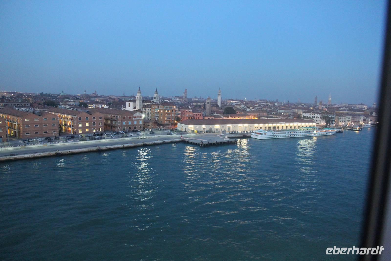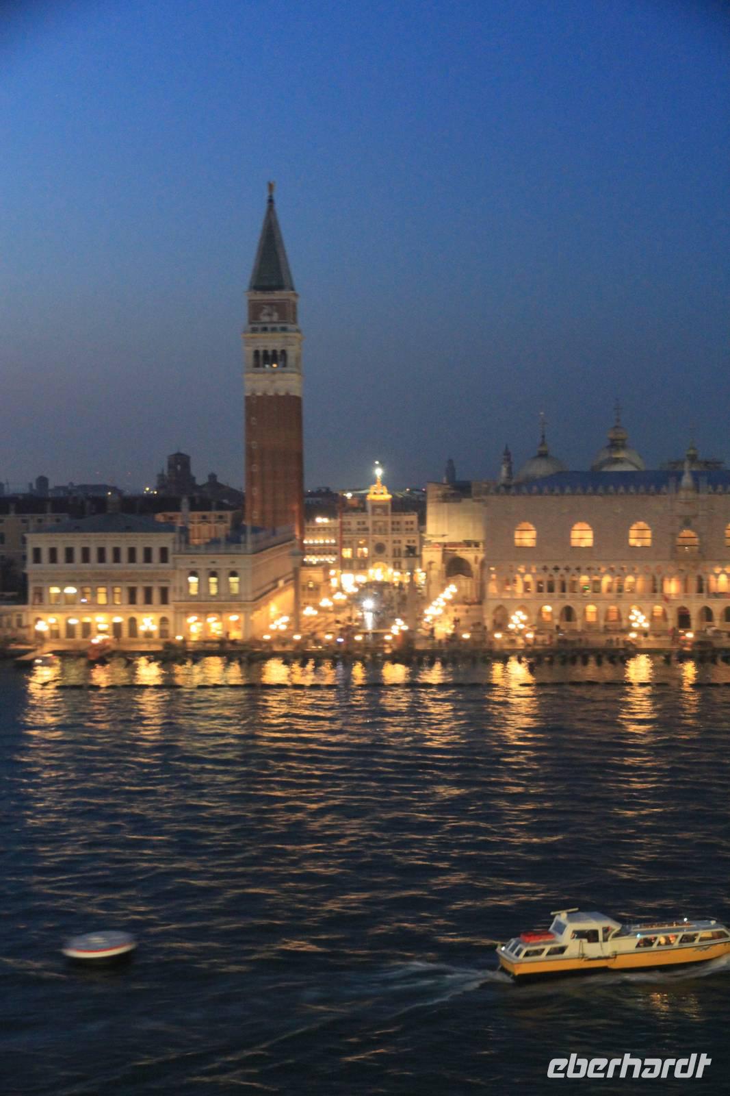 Das zeitige Frühstück ermöglicht es uns, am Gardasee gegen 7 Uhr zu starten, um gegen 10 Uhr schon in Venedig im Hafengelände anzukommen. Hier wartet schon ein Boot, welches uns über den Chioggia Canal in die Nähe der Piazza San Marco bringt. Dort stehen unsere Stadtführerinnen für kleine und große Rundgänge, die zwar nur 90 Minuten dauern, dafür aber mit bestem Wetter und relativ wenig Touristenaufkommen ein angenehmes Erlebnis sind. Gegen 13 Uhr geht es mit unserem Boot wieder Richtung Hafengelände. In unserem Bus legen wir die letzten Meter bis zum MSC Terminal zurück. Das Prozedere der Einschiffung ist ungewohnt, aber schnell gelangen alle zu ihren Kabinen. Vor dem Auslaufen absolvieren wir die obligatorische Seenotrettungsübung. Dann suchen wir unsere Plätze in den Abendessenrestaurants und genießen wir den Service der freundlichen Bedienung bei Abendessen. Der Höhepunkt des ersten Abends ist das spektakuläre Auslaufen des Schiffes aus Venedig, bei der wir das erleuchtete Venedig an unseren staunenden Blicken vorüberziehen lassen.