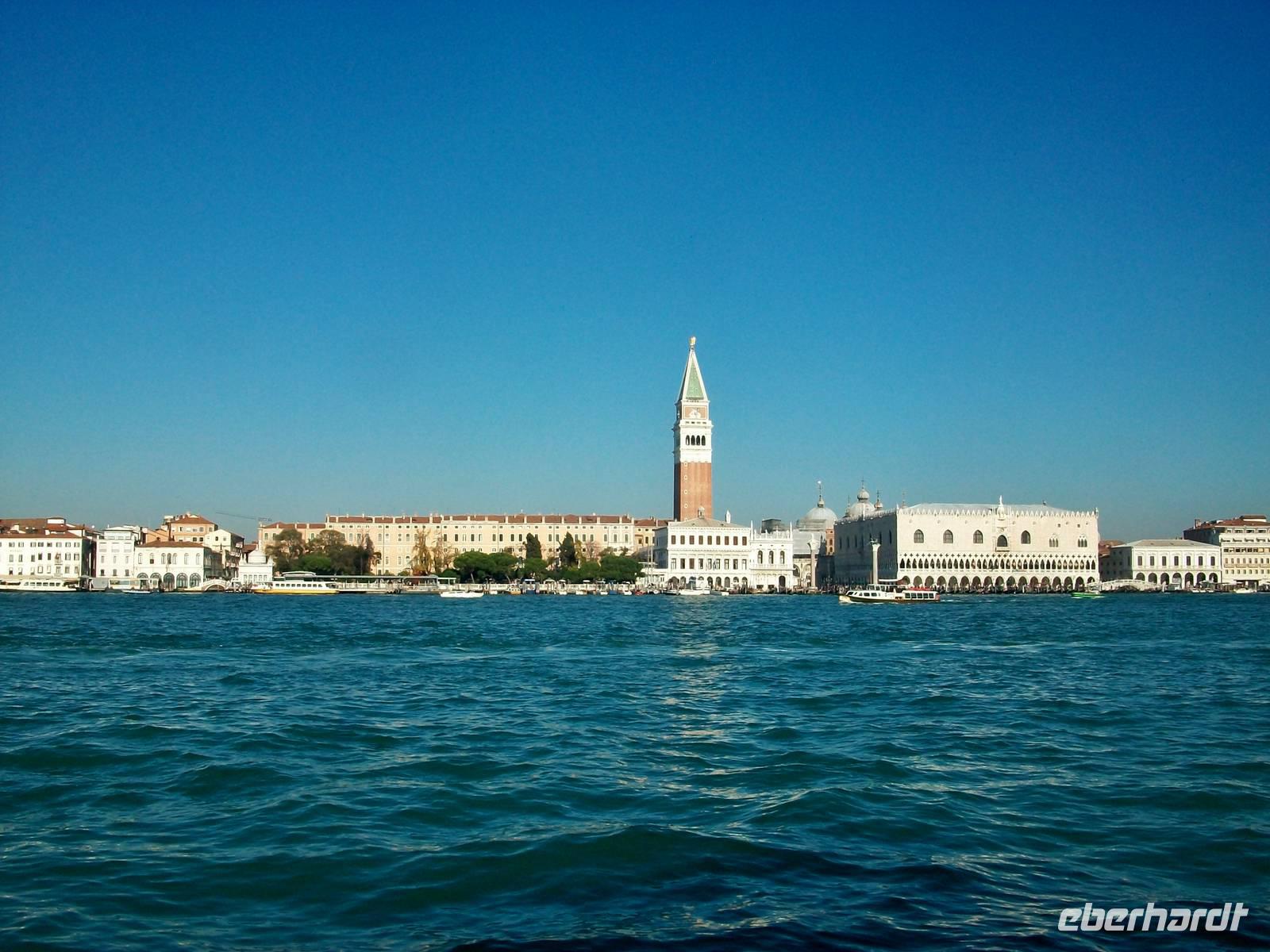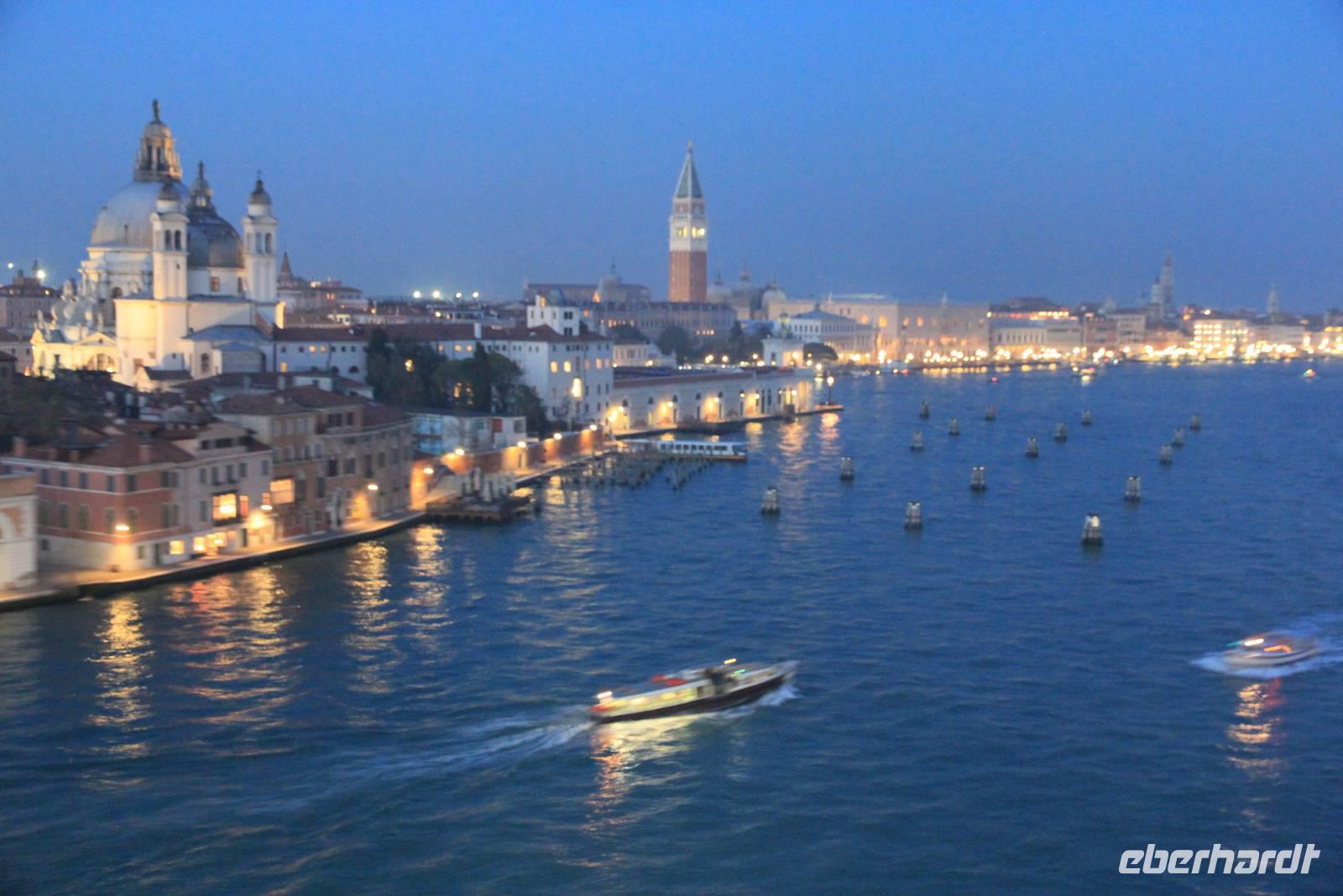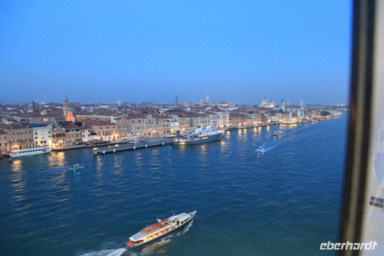 Das zeitige Frühstück ermöglicht es uns, am Gardasee gegen 7 Uhr zu starten, um gegen 10 Uhr schon in Venedig im Hafengelände anzukommen. Hier wartet schon ein Boot, welches uns über den Chioggia Canal in die Nähe der Piazza San Marco bringt. Dort stehen unsere Stadtführerinnen für kleine und große Rundgänge, die zwar nur 90 Minuten dauern, dafür aber mit bestem Wetter und relativ wenig Touristenaufkommen ein angenehmes Erlebnis sind. Gegen 13 Uhr geht es mit unserem Boot wieder Richtung Hafengelände. In unserem Bus legen wir die letzten Meter bis zum MSC Terminal zurück. Das Prozedere der Einschiffung ist ungewohnt, aber schnell gelangen alle zu ihren Kabinen. Vor dem Auslaufen absolvieren wir die obligatorische Seenotrettungsübung. Dann suchen wir unsere Plätze in den Abendessenrestaurants und genießen wir den Service der freundlichen Bedienung bei Abendessen. Der Höhepunkt des ersten Abends ist das spektakuläre Auslaufen des Schiffes aus Venedig, bei der wir das erleuchtete Venedig an unseren staunenden Blicken vorüberziehen lassen.