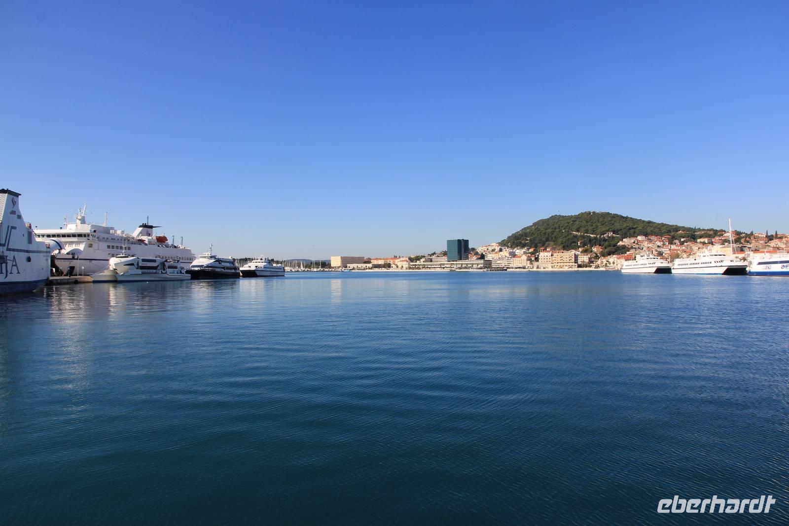 Bald kommt die Einfahrt von Split in unser Blickfeld; ein kleines Boot bringt den Lotsen für den Hafen, und sicher werden wir von ihm zur Anlegestelle geleitet.
