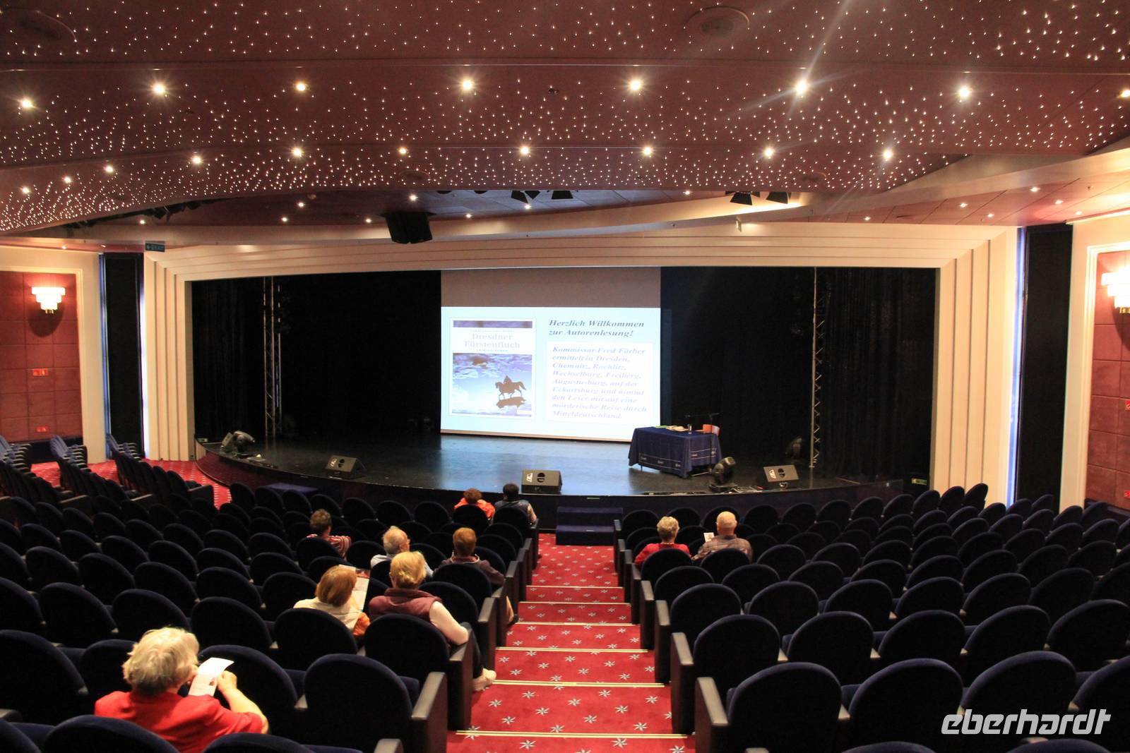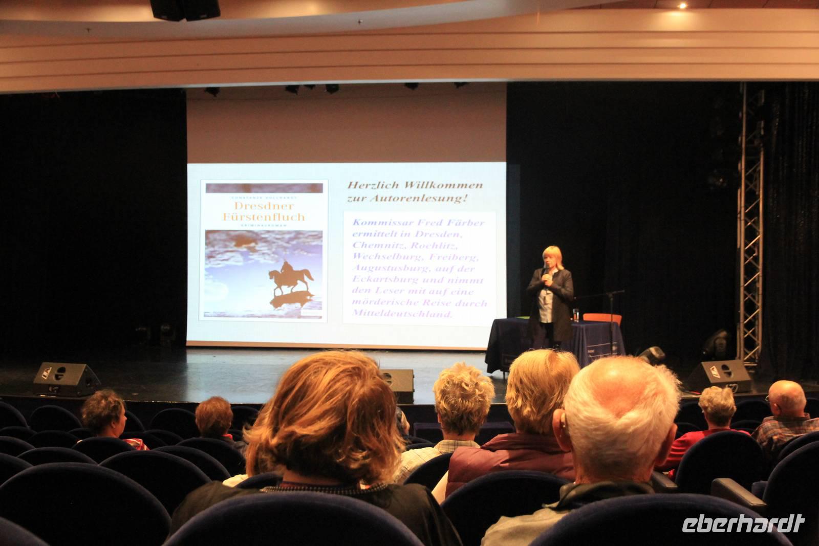 Wir Eberhardt-Travel-Reisegäste genießen zusätzlich eine Autorenlesung von Constanze Vollhardt alias Constanze Hölig aus dem Sachsenkrimi "Dresdner Fürstenfluch". Das Buch macht neugierig auf mehr, insbesondere auch aufgrund der Verquickung der fiktiven Geschichte mit den Tatsachen und Legenden des Lebens der Wettiner Fürsten.
